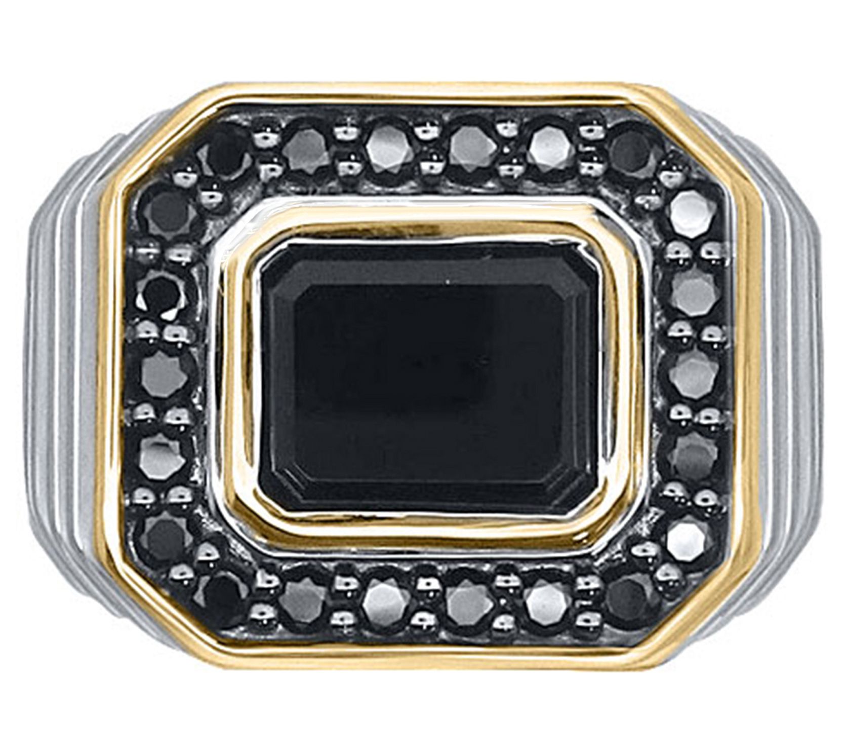 Emerald-cut onyx gemstone with a halo of black rhodium-plated, prong-set black diamonds; 14K yellow gold-plated sterling silver border; line-patterned shank