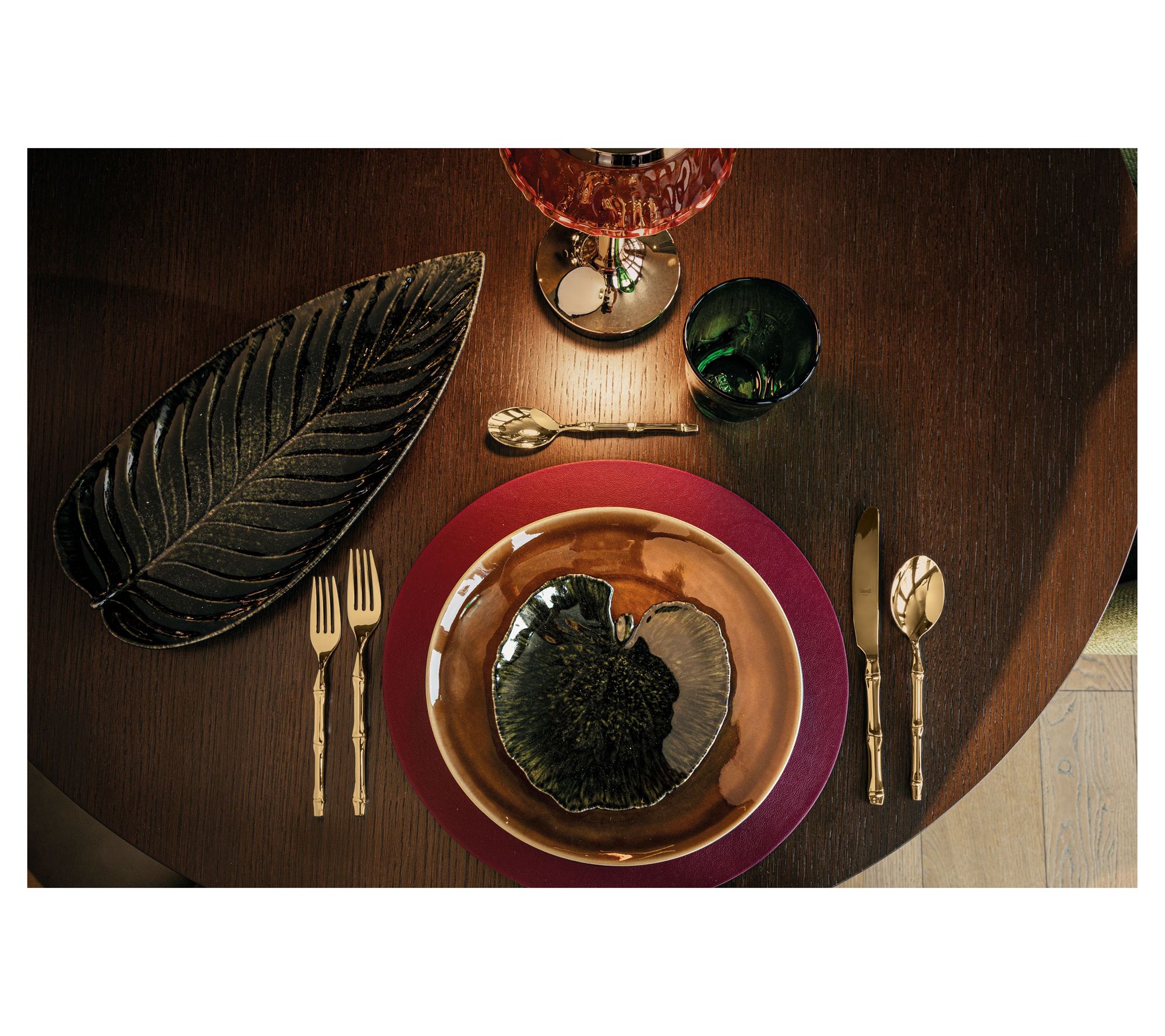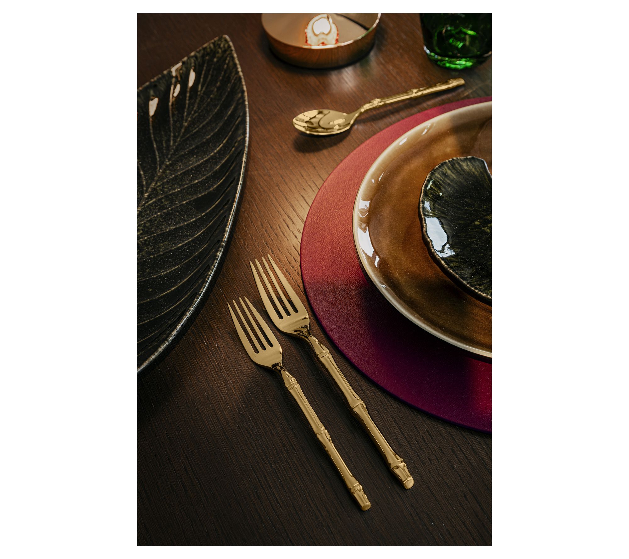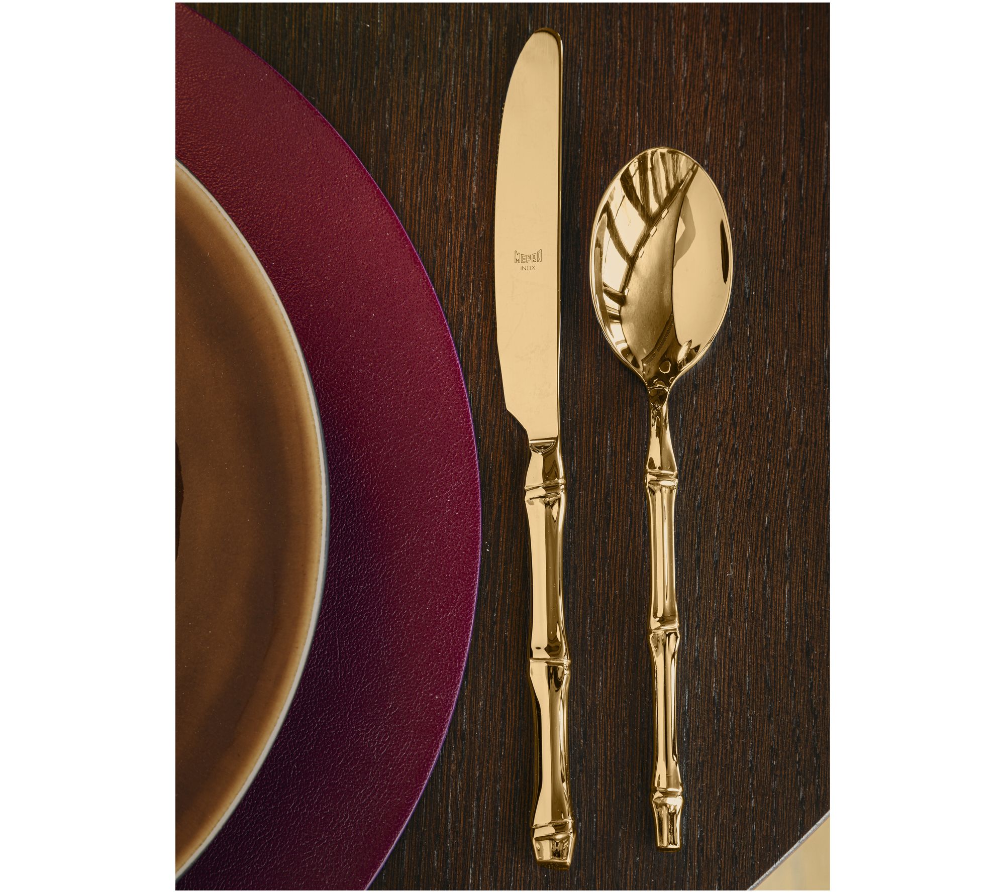 Create a sophisticated dining scene for family meals or special occasions with this goldtone flatware set, inspired by the textures of bamboo. Each piece pairs high-quality stainless steel with a titanium coating for extra allure and lasting style, making every place setting feel warm and inviting. Enjoy the comfort of specially patterned handles, whether you're hosting formal events or adding elegance to daily dinners. From Mepra.