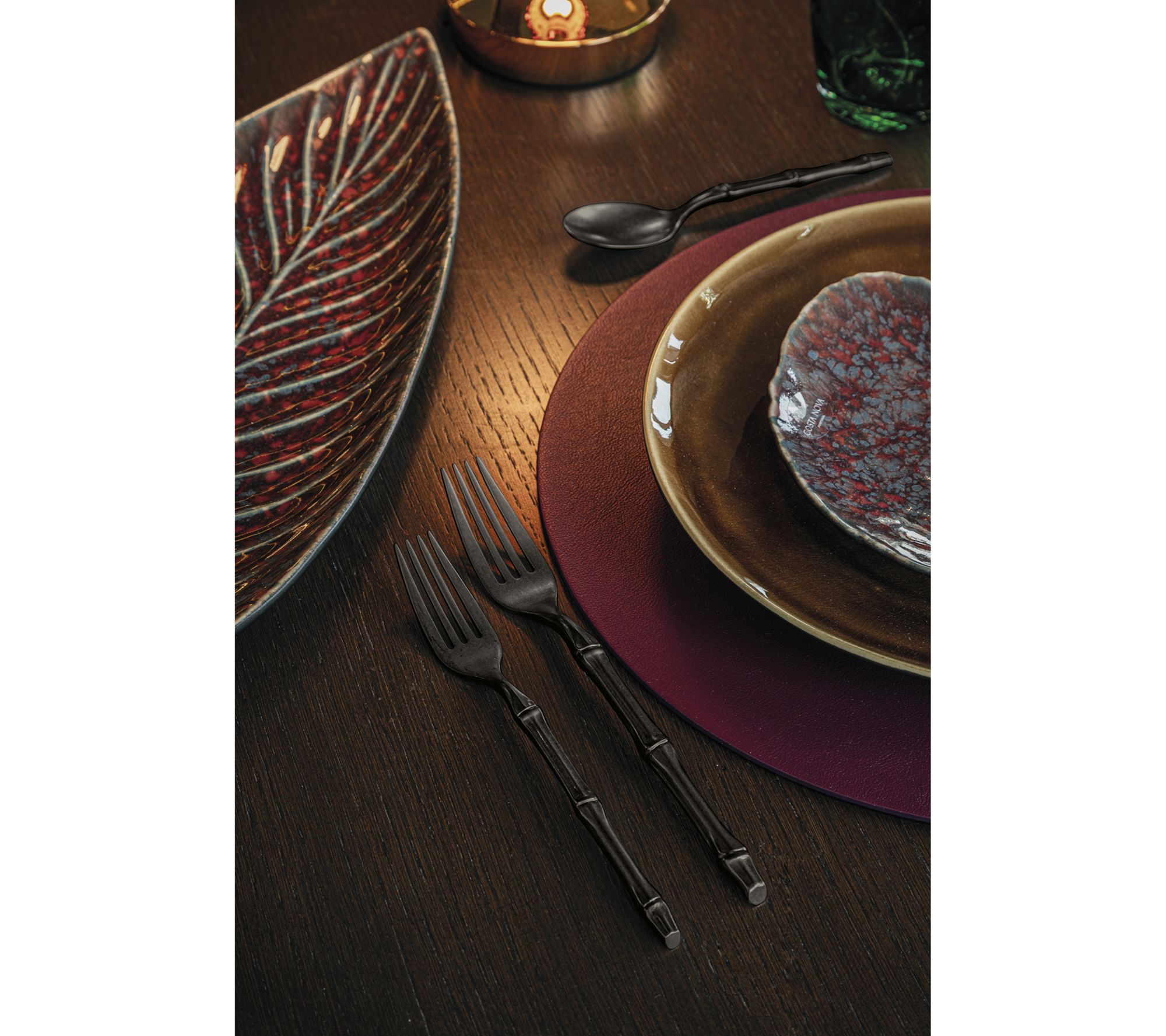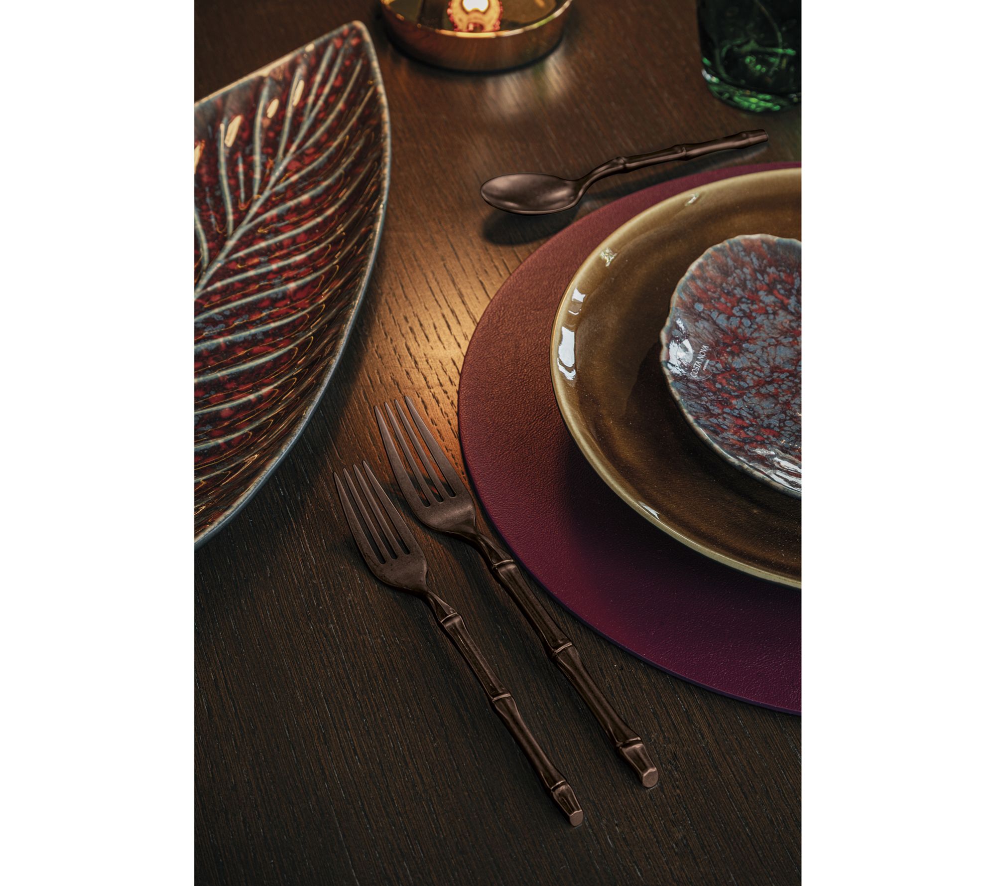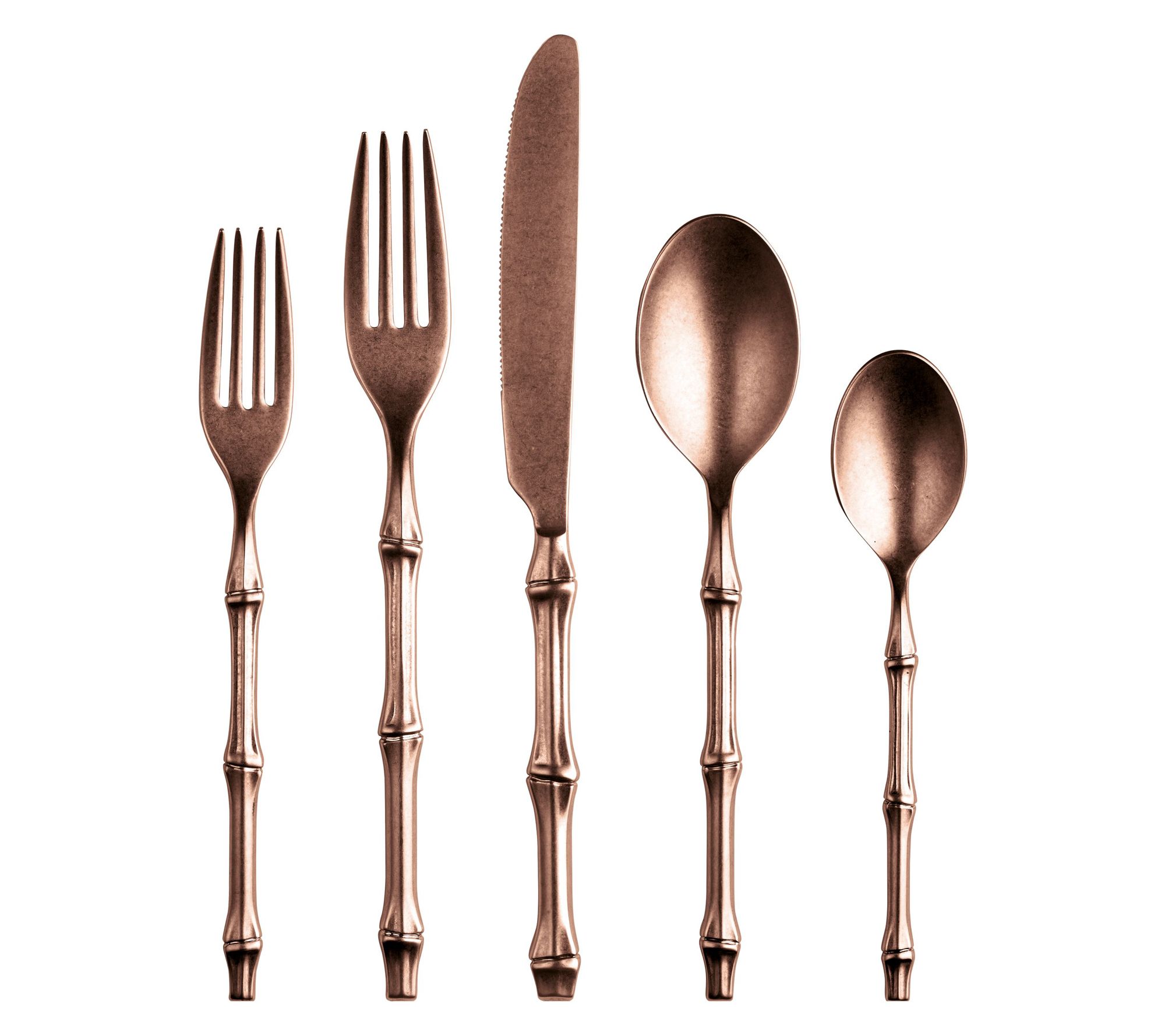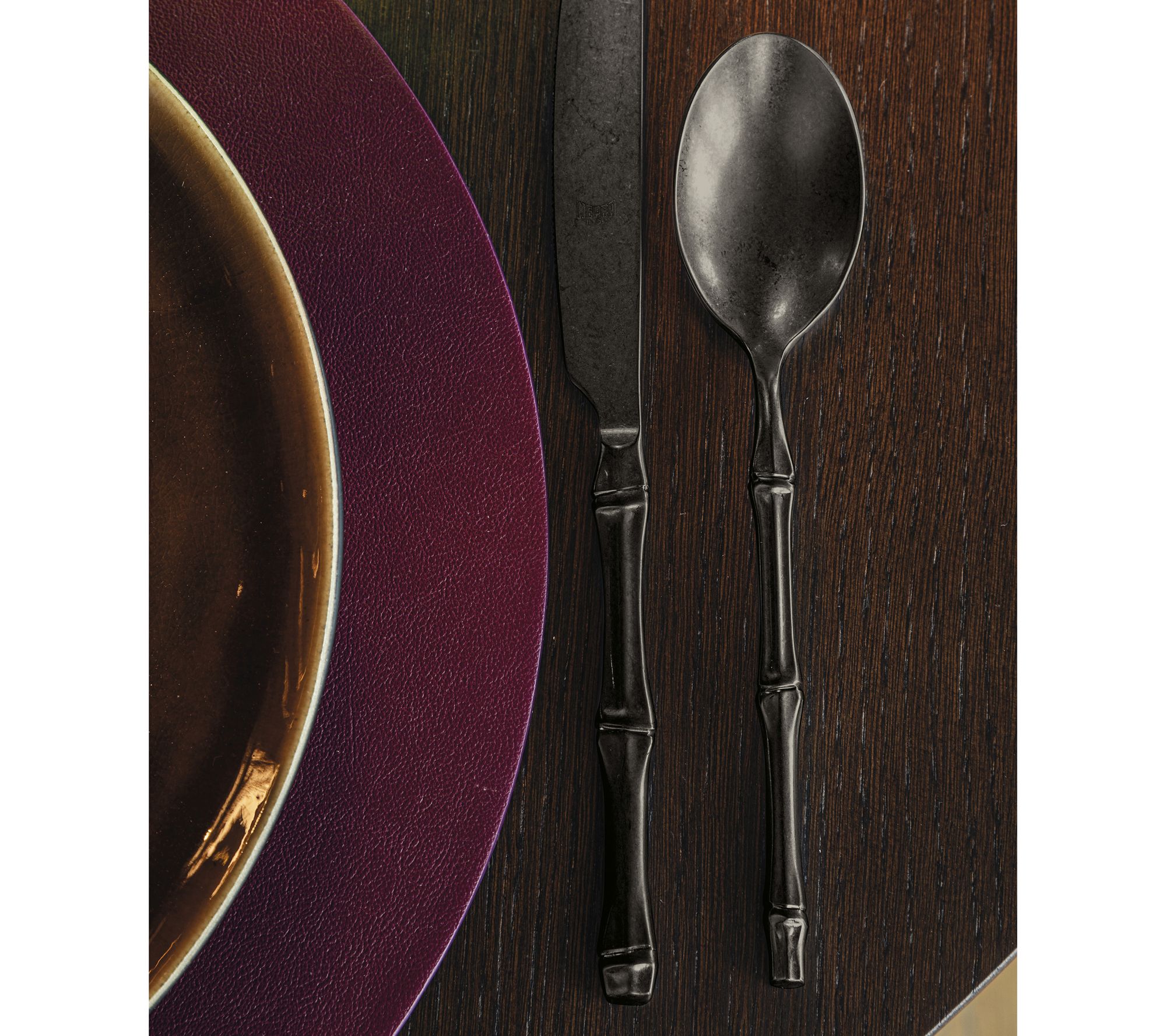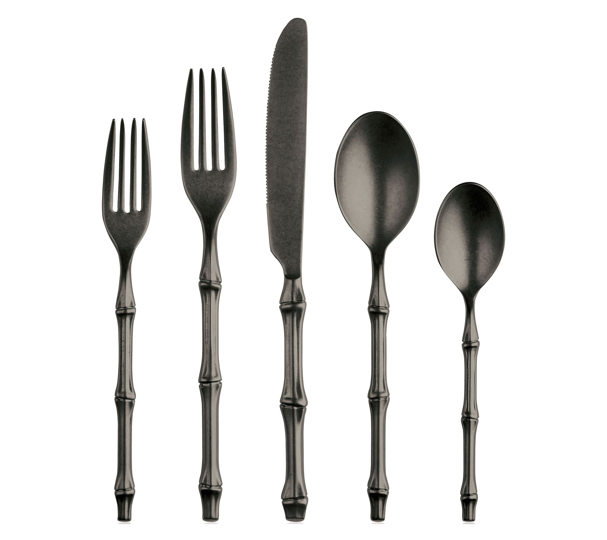 Bring a refined, nature-inspired look to the table with this five-piece Bali flatware set, featuring a realistic bamboo-like handle and striking titanium-coated finish. Whether hosting a formal dinner or elevating everyday meals, this stainless steel cutlery blends Italian craftsmanship with luxurious style and a comfortable grip. From Mepra.
