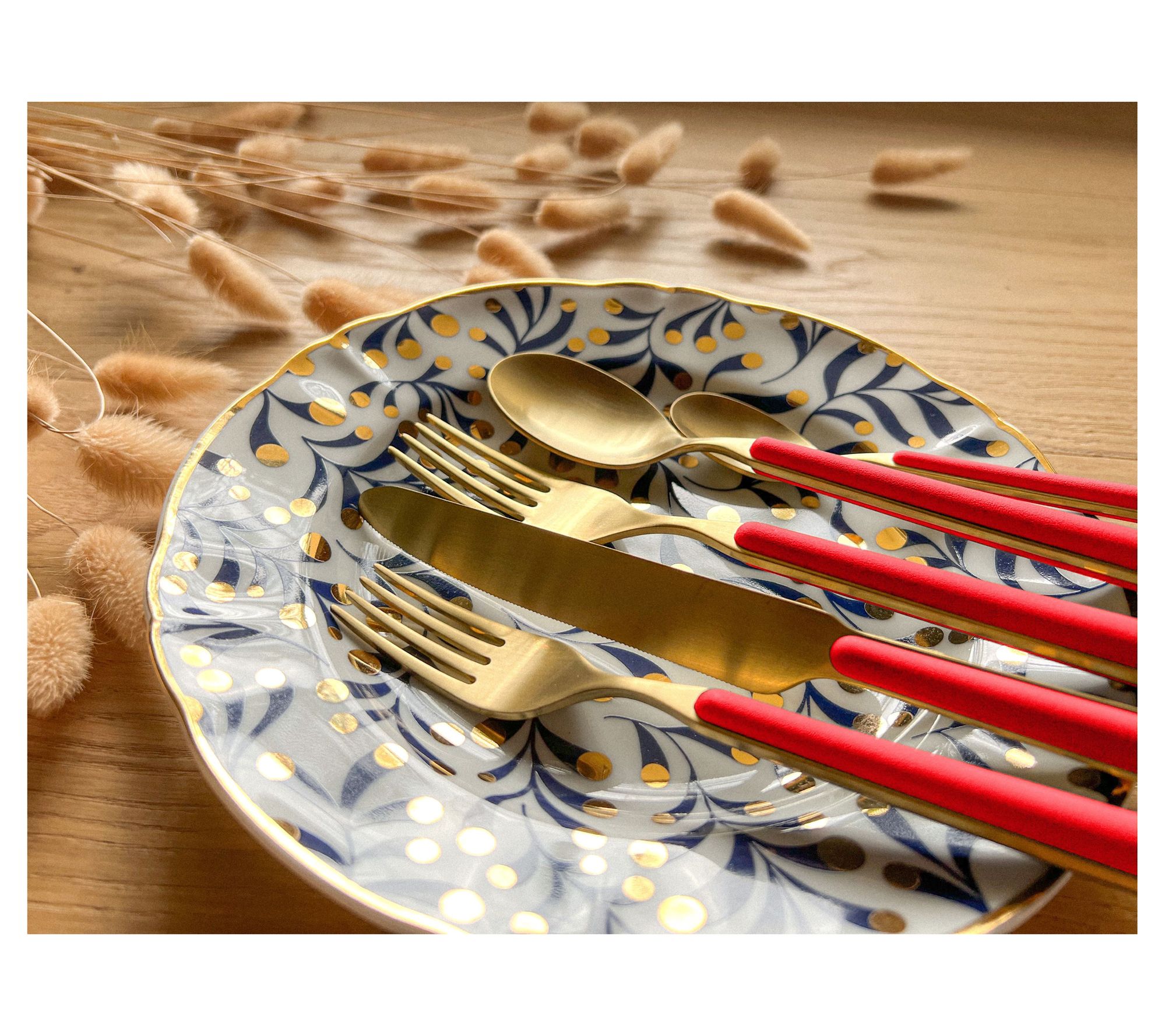 • Includes one table fork, one table knife, one dessert fork, one dessert spoon, and one coffee spoon