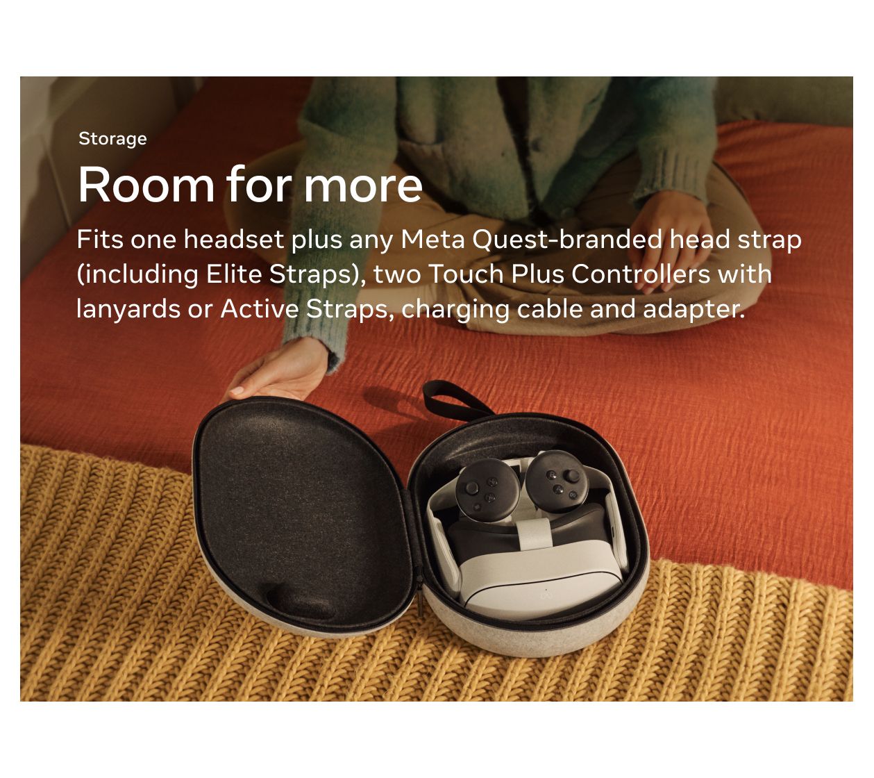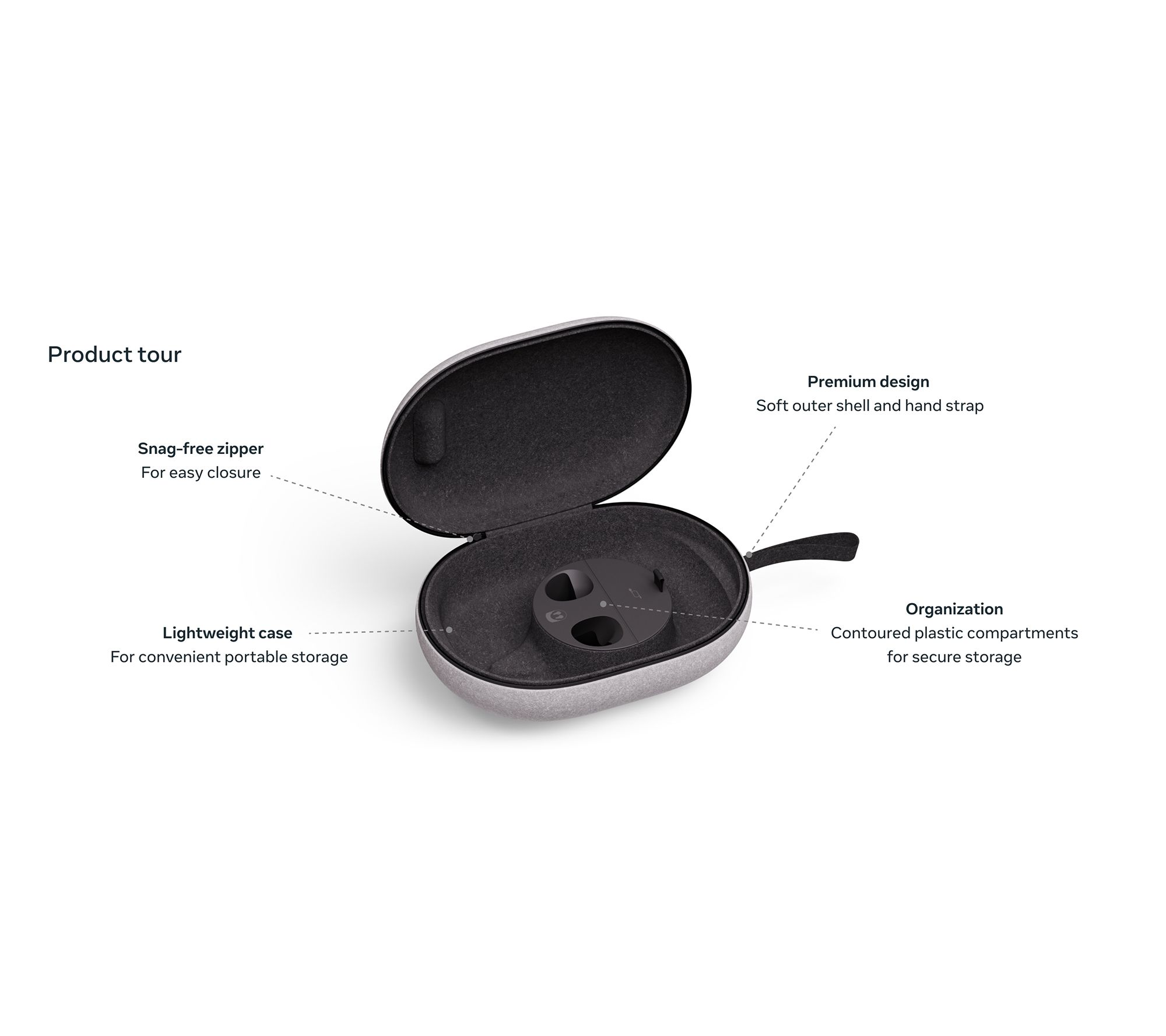 • Contoured plastic inner compartments designed to fit headset, Touch Plus Controllers, charging cable, adapter, head strap (standard or Elite), and Active Straps, not included