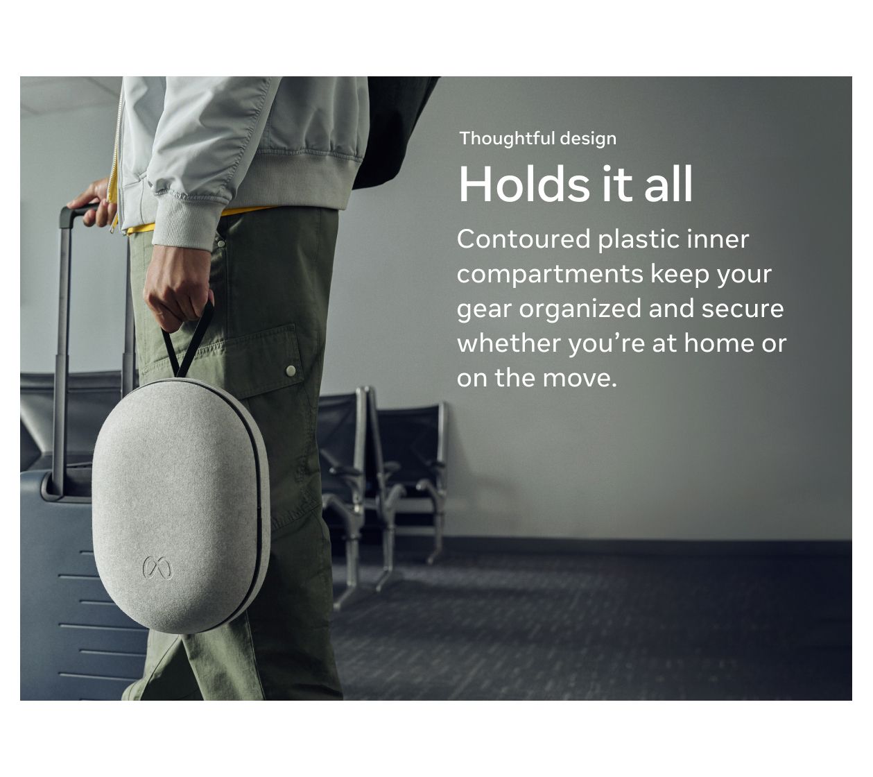 Take your headset and accessories on the go with style and protection with this case designed to fit your Meta Quest 3/3S (not included). The sturdy felt-trimmed shell and inner compartments help keep your gear organized and secure, while the lightweight construction, soft hand strap, and rounded profile make it easy to carry and access your VR setup. From Meta.