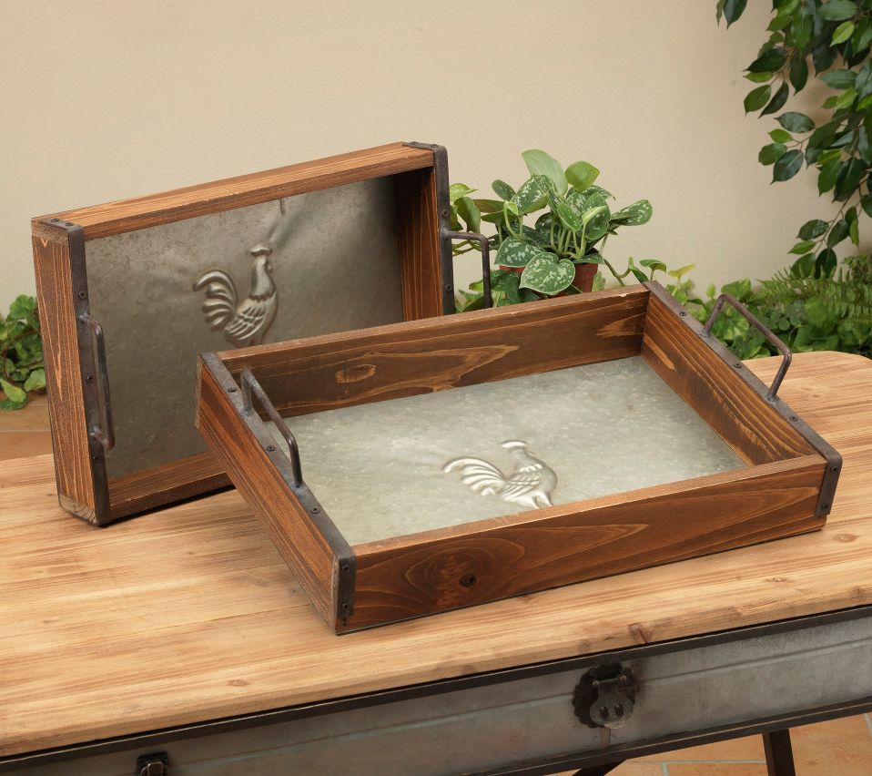 Add a touch of rustic charm to your decor with these metal and wood trays. Perfect for seasonal displays, their farmhouse-inspired design combines sturdy metal frames with natural wood bases that blend seamlessly with any style. From Gerson International.