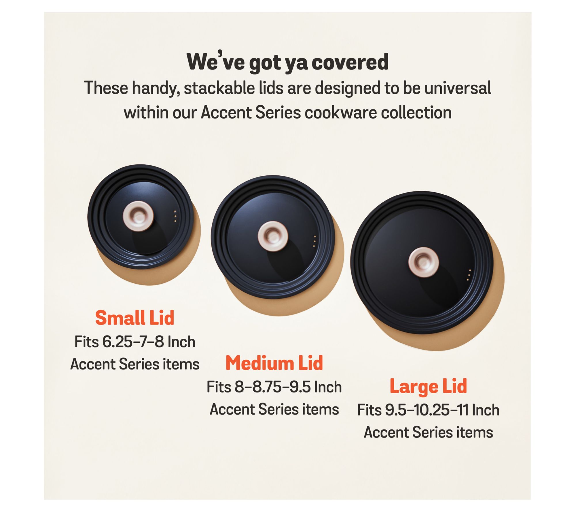 • Compatible with Meyer Accent Series 3-qt saucier, 5-qt Dutch oven, 9.5" steamer, 8" fry pan, and all three stockpots (not included)