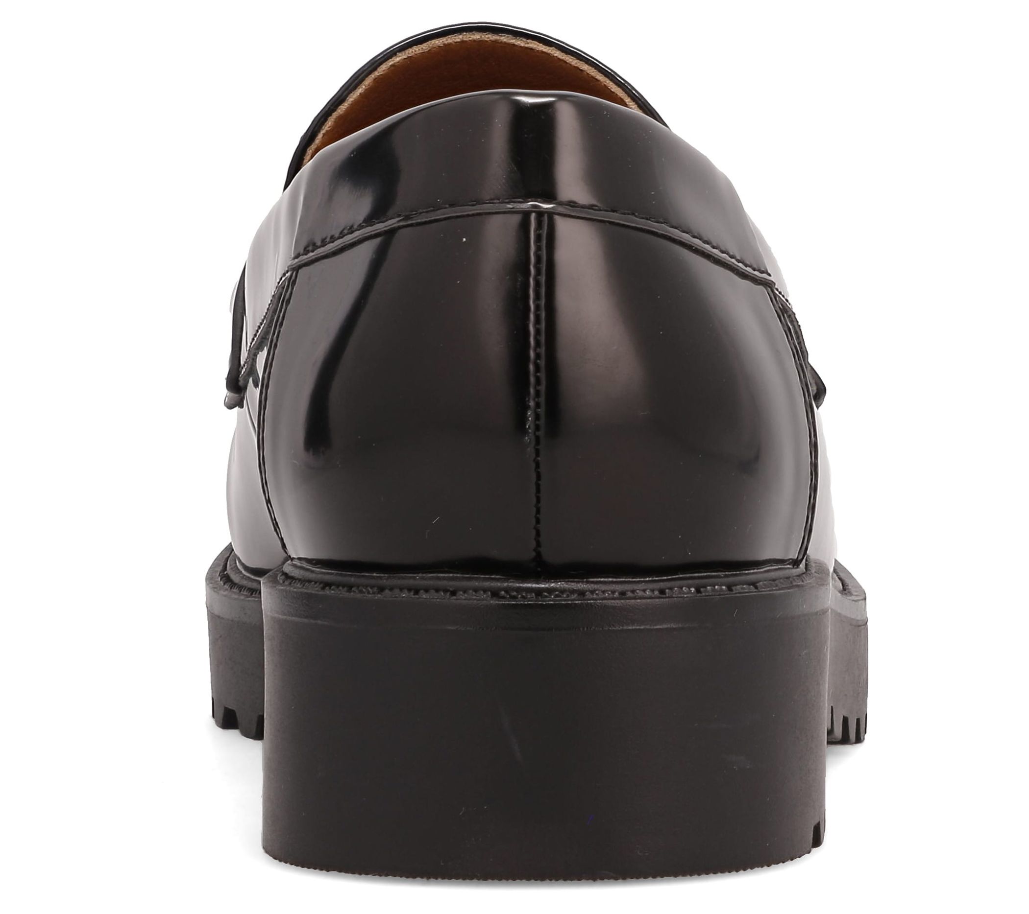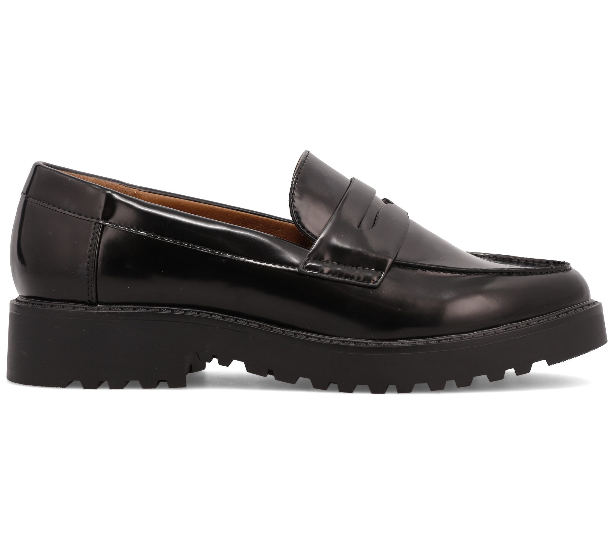 Command the sidewalk when you slip on these classic penny loafers that feature a modern patent finish and sturdy lug soles. From MIA Amore.