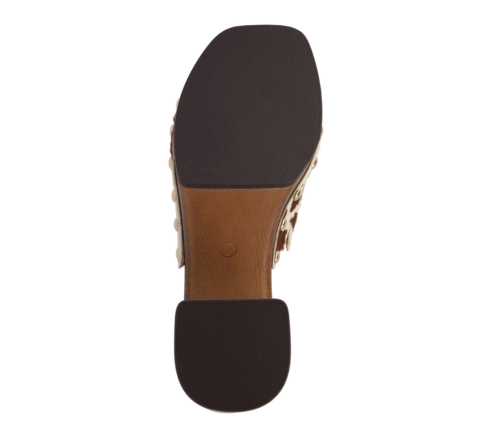• Faux leather, slip-on mule design, square toe, stud detailing