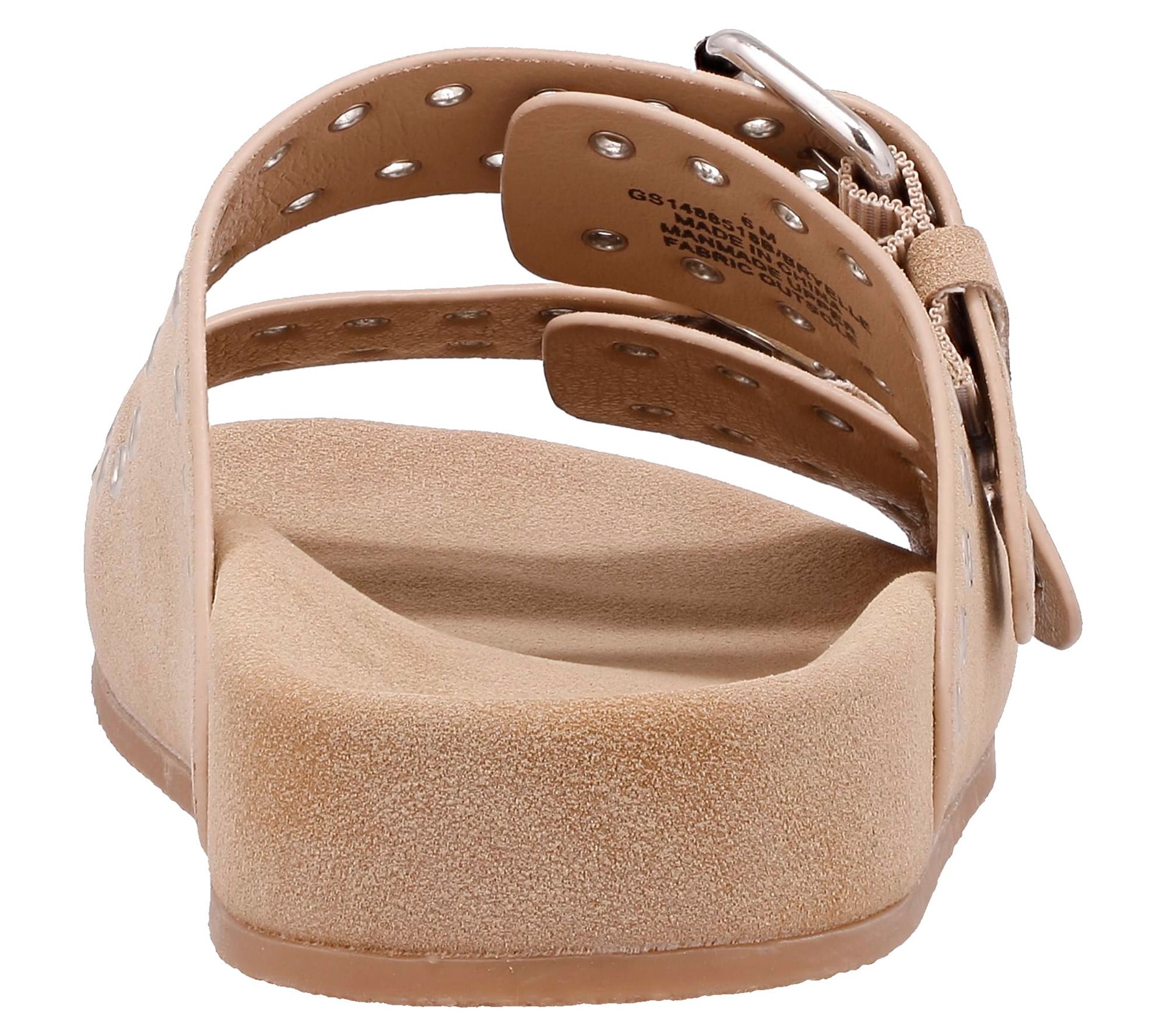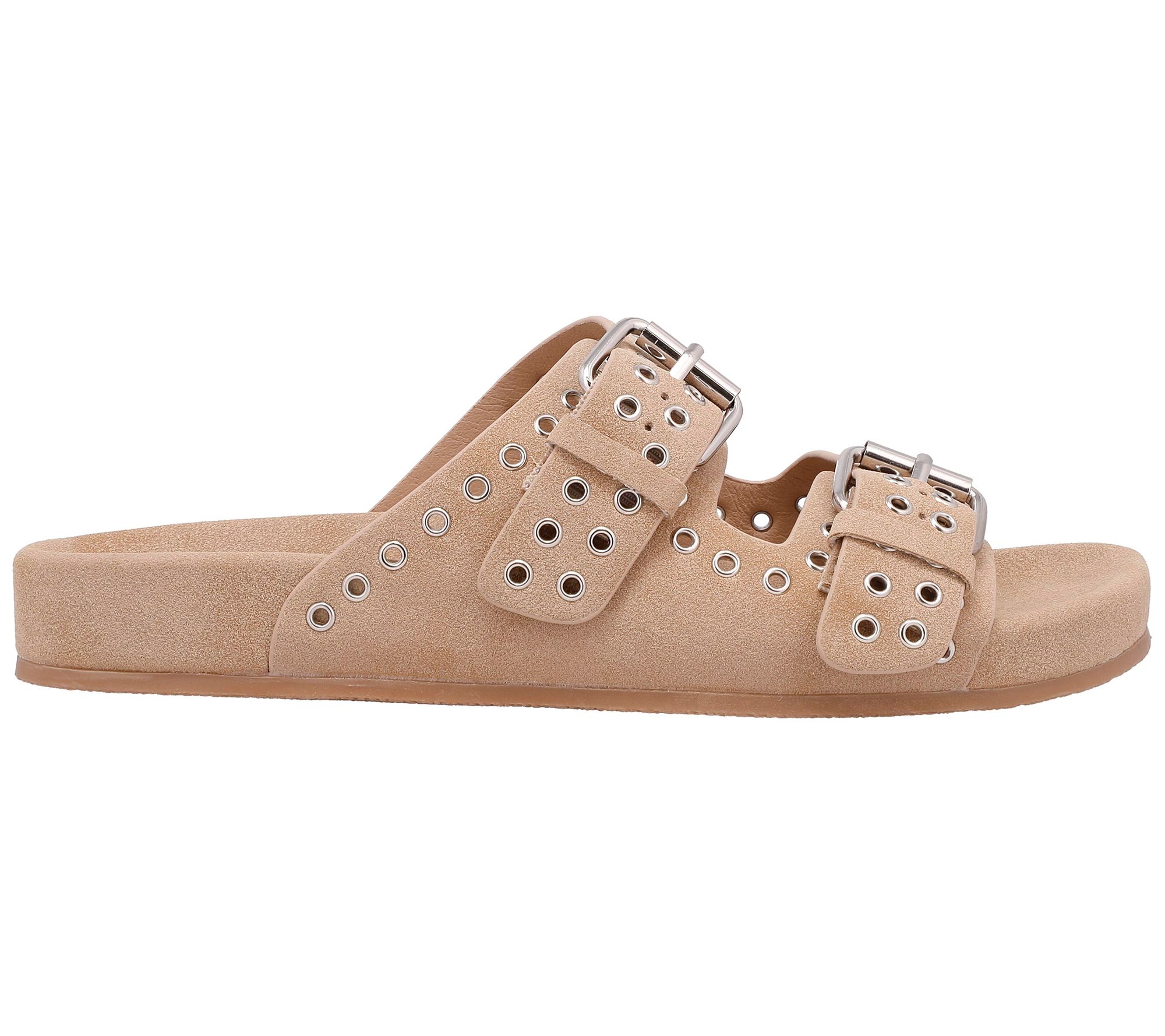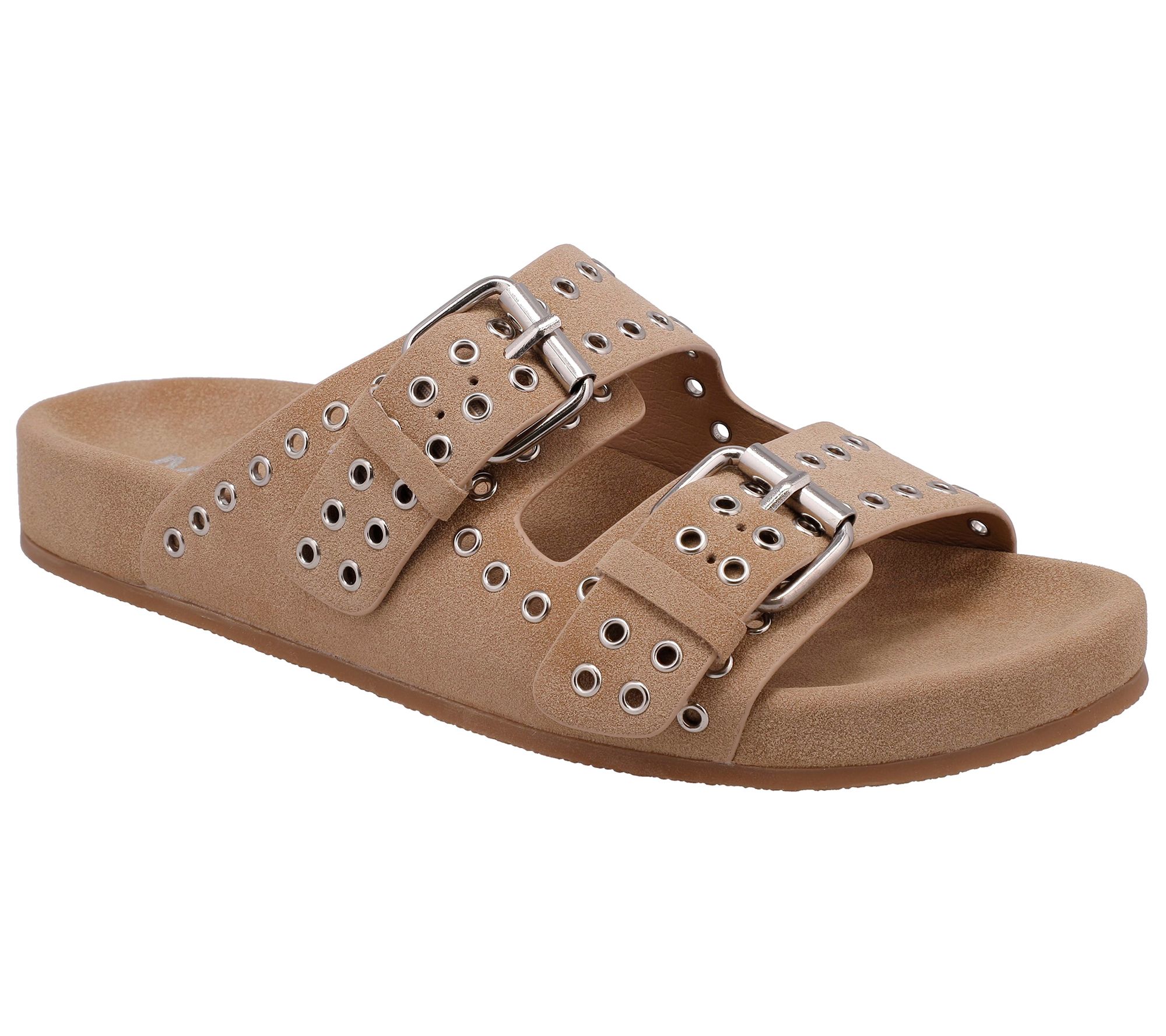 Slip into effortless style with the MIA Shoes two-strap slide sandal - Brooklyn-G. Crafted from faux suede, this sandal features grommet detailing and two silver buckles, offering a chic and edgy look. With a contoured footbed, you'll enjoy all-day comfort whether you're out and about or lounging at home. From MIA Shoes.