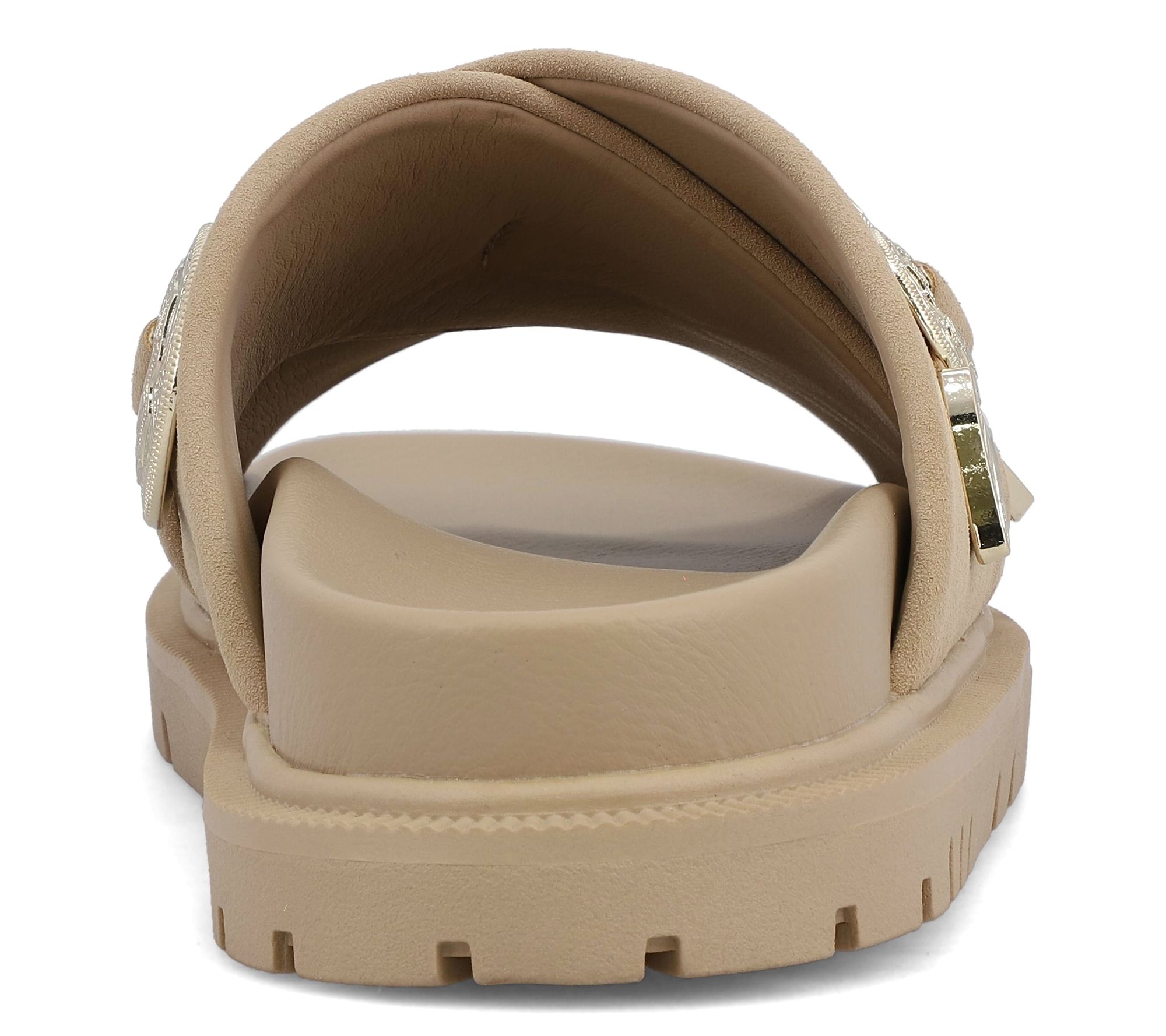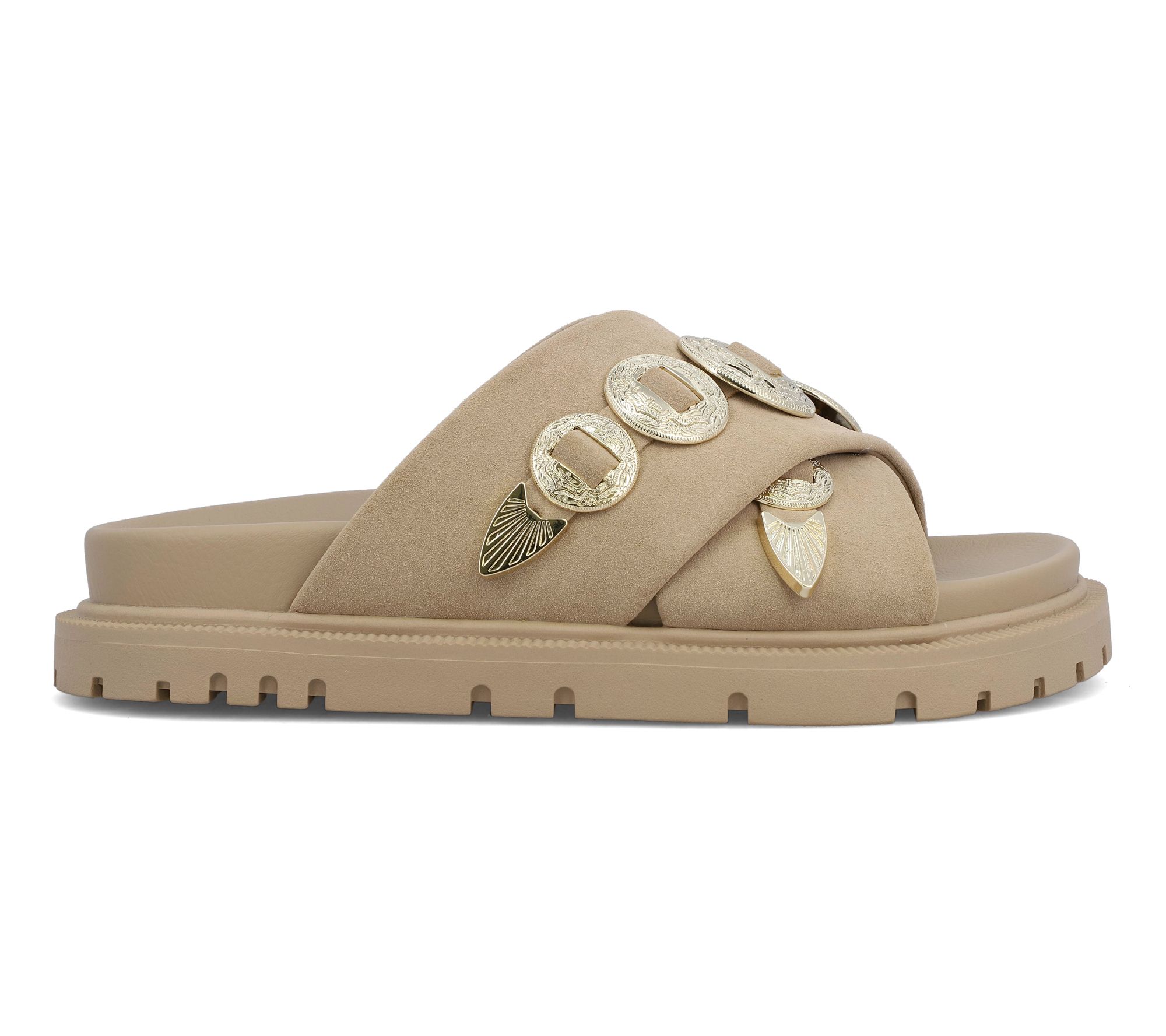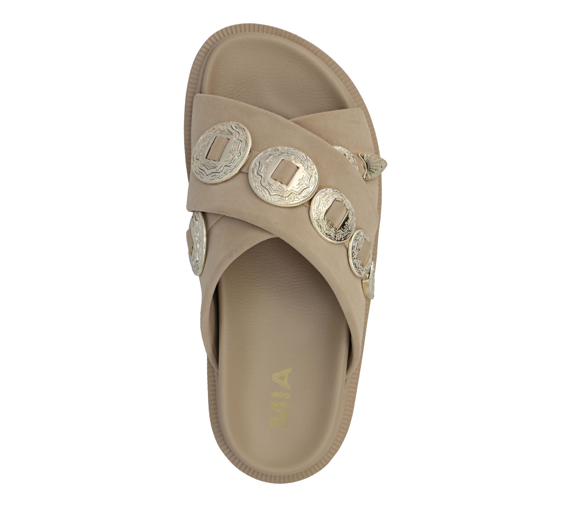 Step into the season with the Gorgene, a western-inspired slide that effortlessly combines fashion and comfort. With its durable construction, crossed straps adorned with silvertone hardware, and a molded footbed, these slides offer a unique blend of style and practicality. Perfect for adding a touch of the wild west to your summer ensemble, the Gorgene is a must-have. From MIA Shoes.