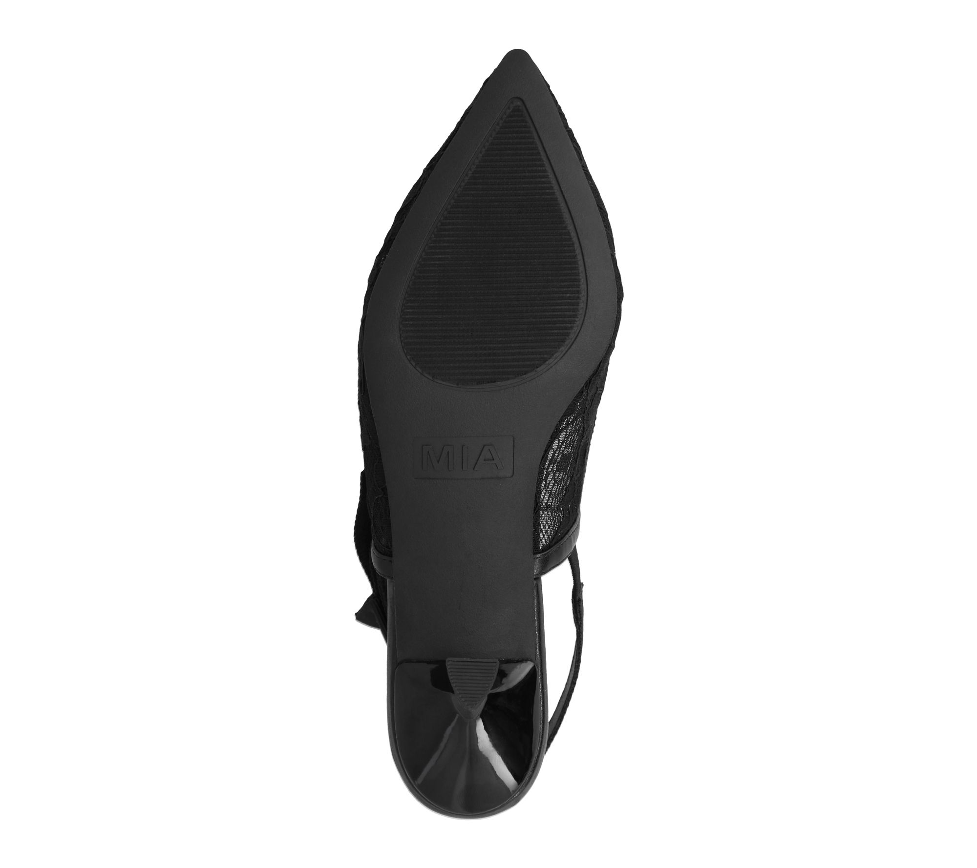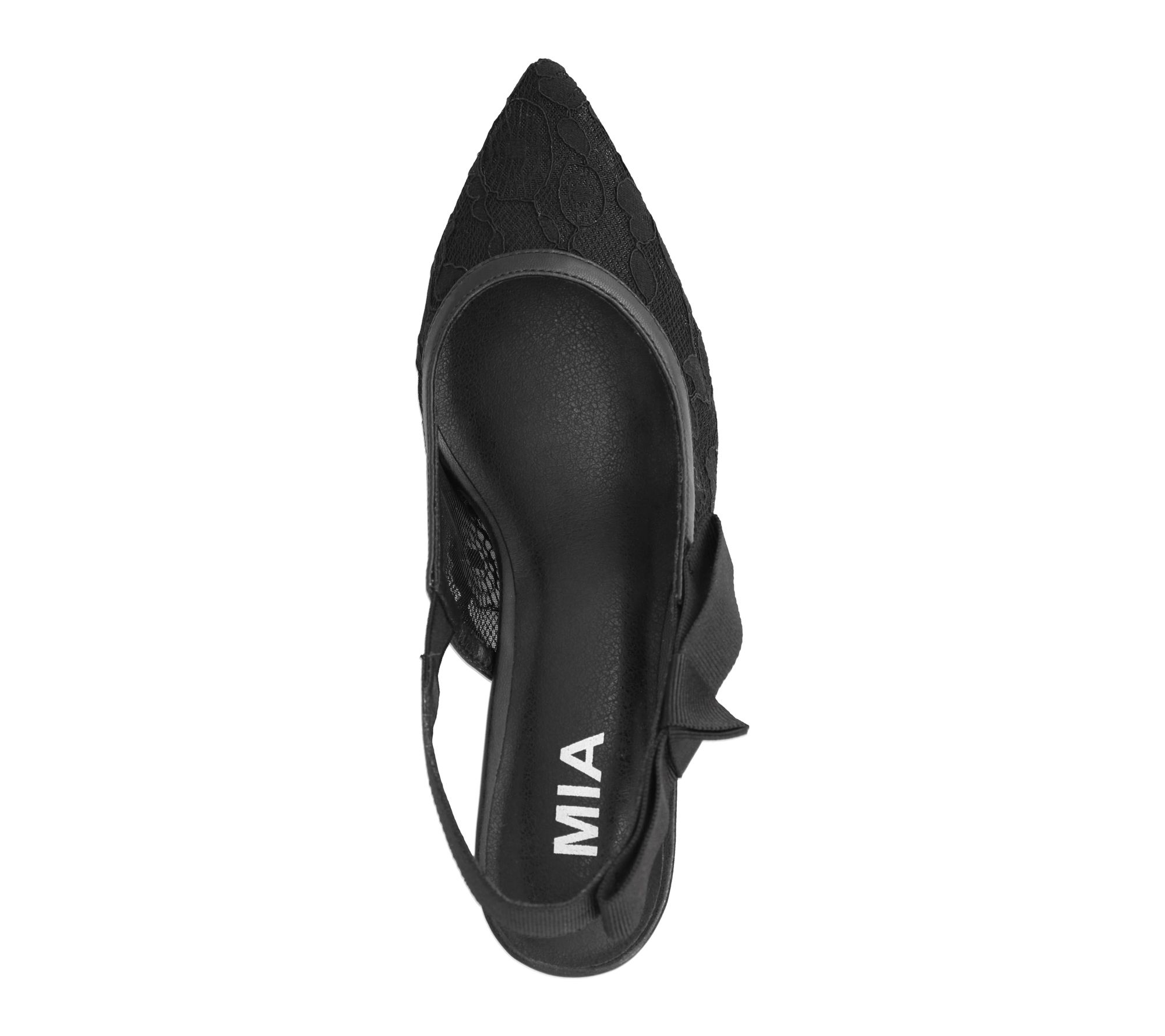 Slip-on slingback design with black lace mesh upper and pointed toe