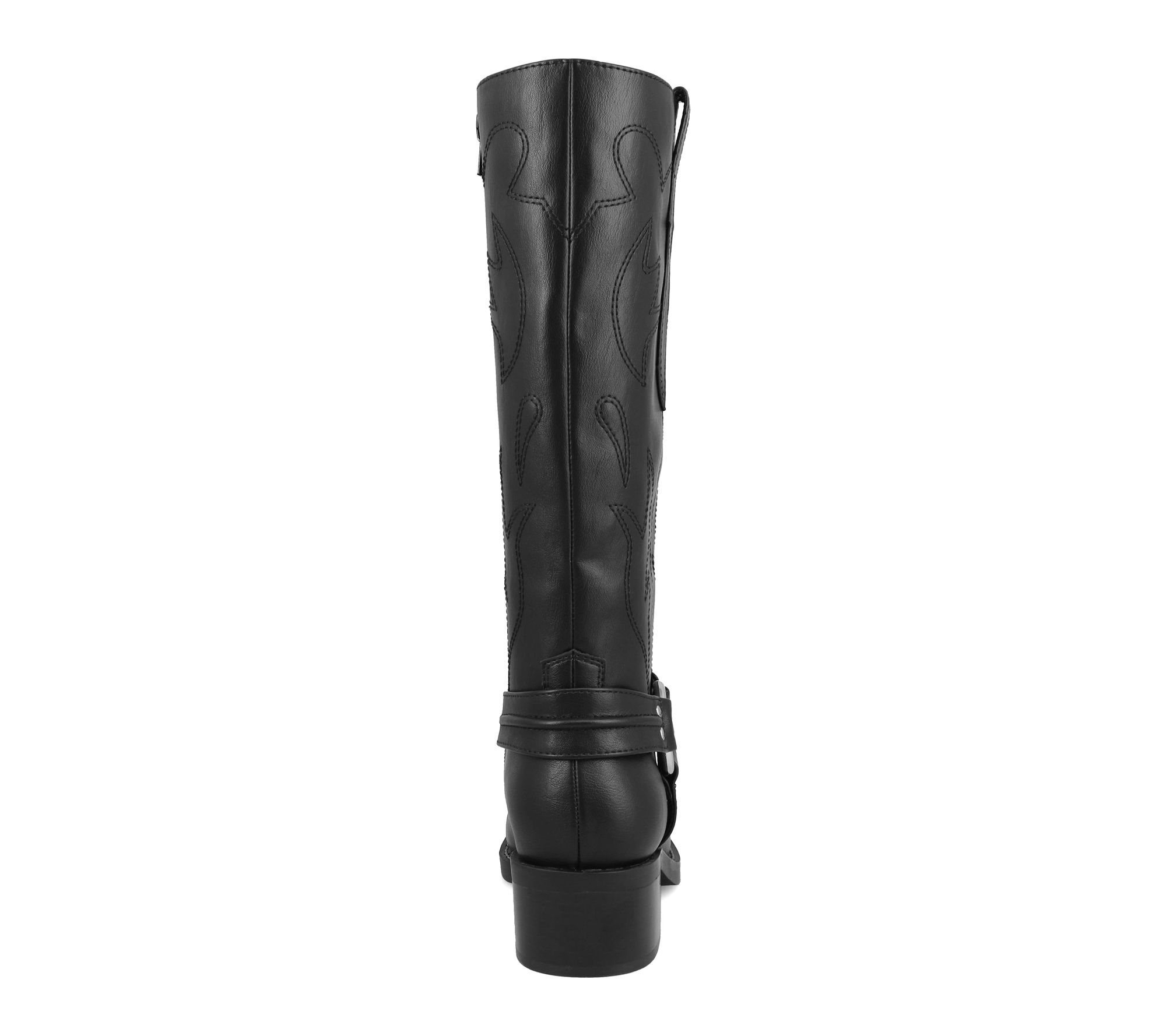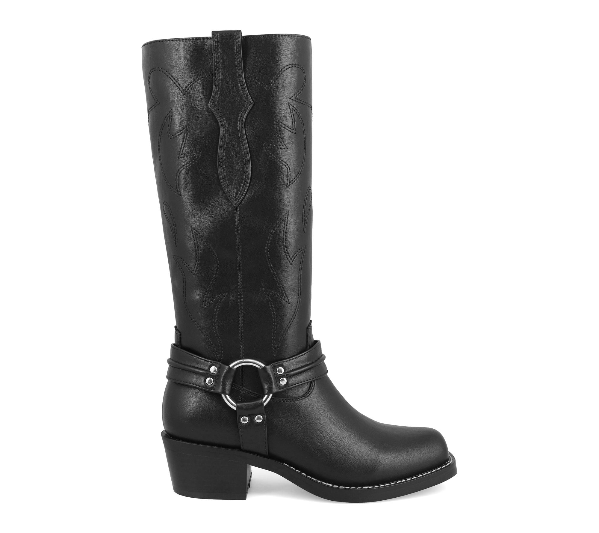 Make an entrance at your next night out with these tall western boots, featuring dramatic harness straps and bold detailing that catch the eye. Flexible soles and a supportive footbed keep you comfortable from the dance floor to brunch with friends. Effortless to pull on and easy to style, this pair promises all-day confidence wherever you roam. From MIA.