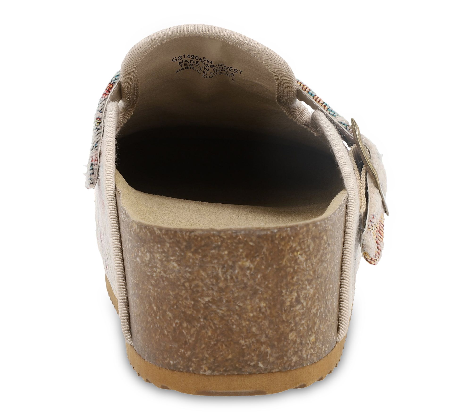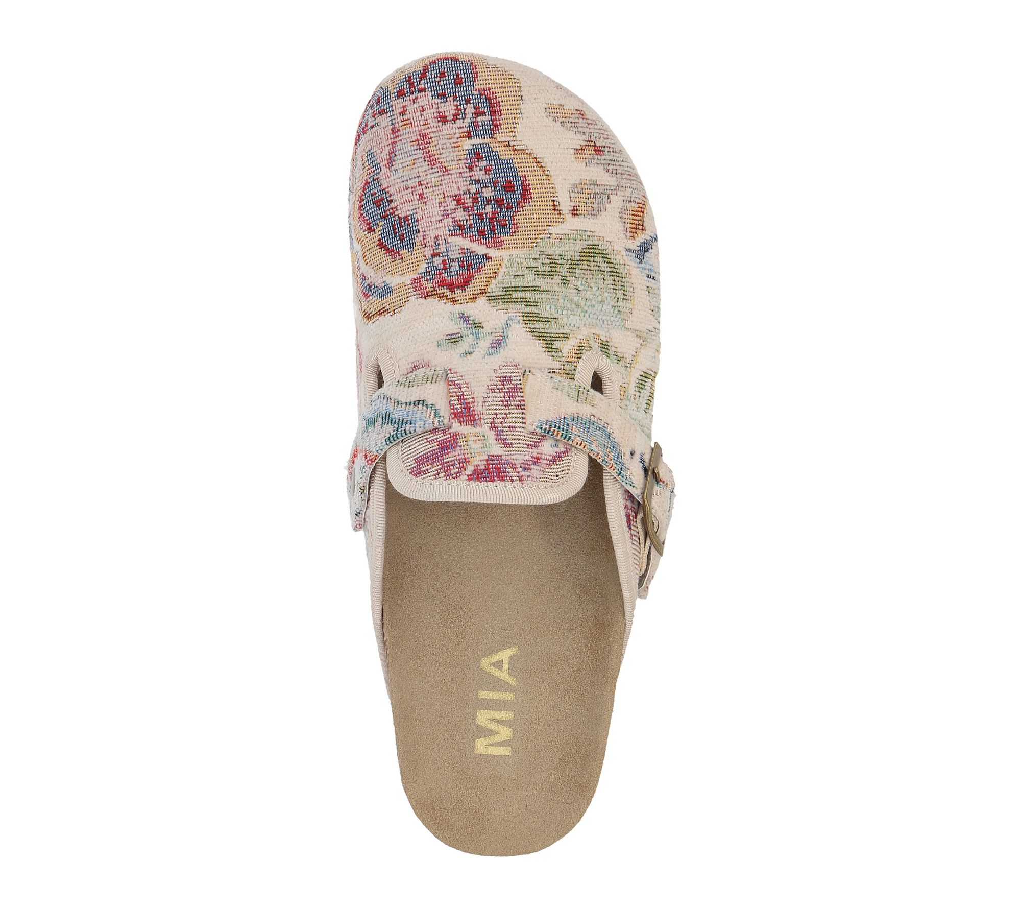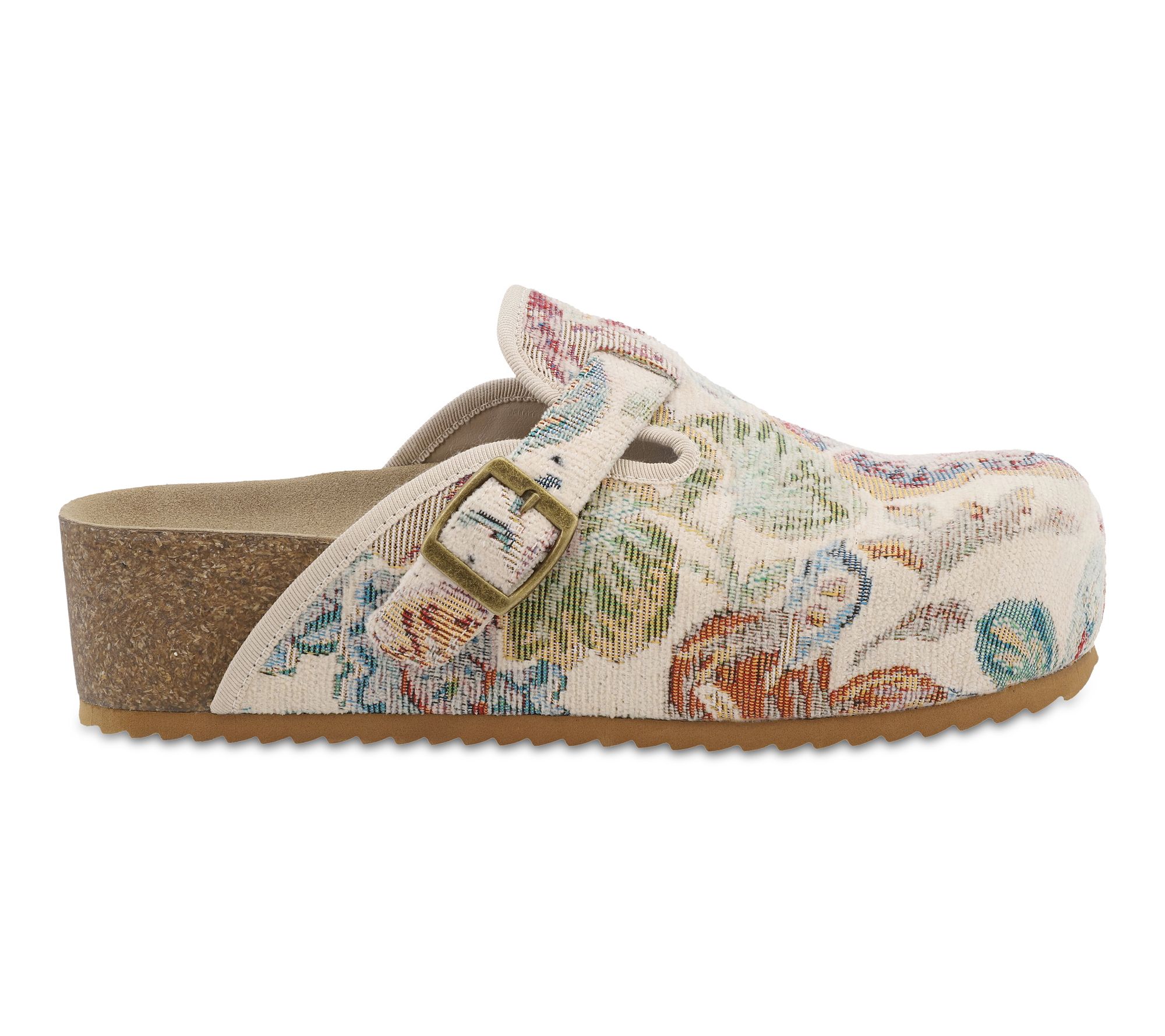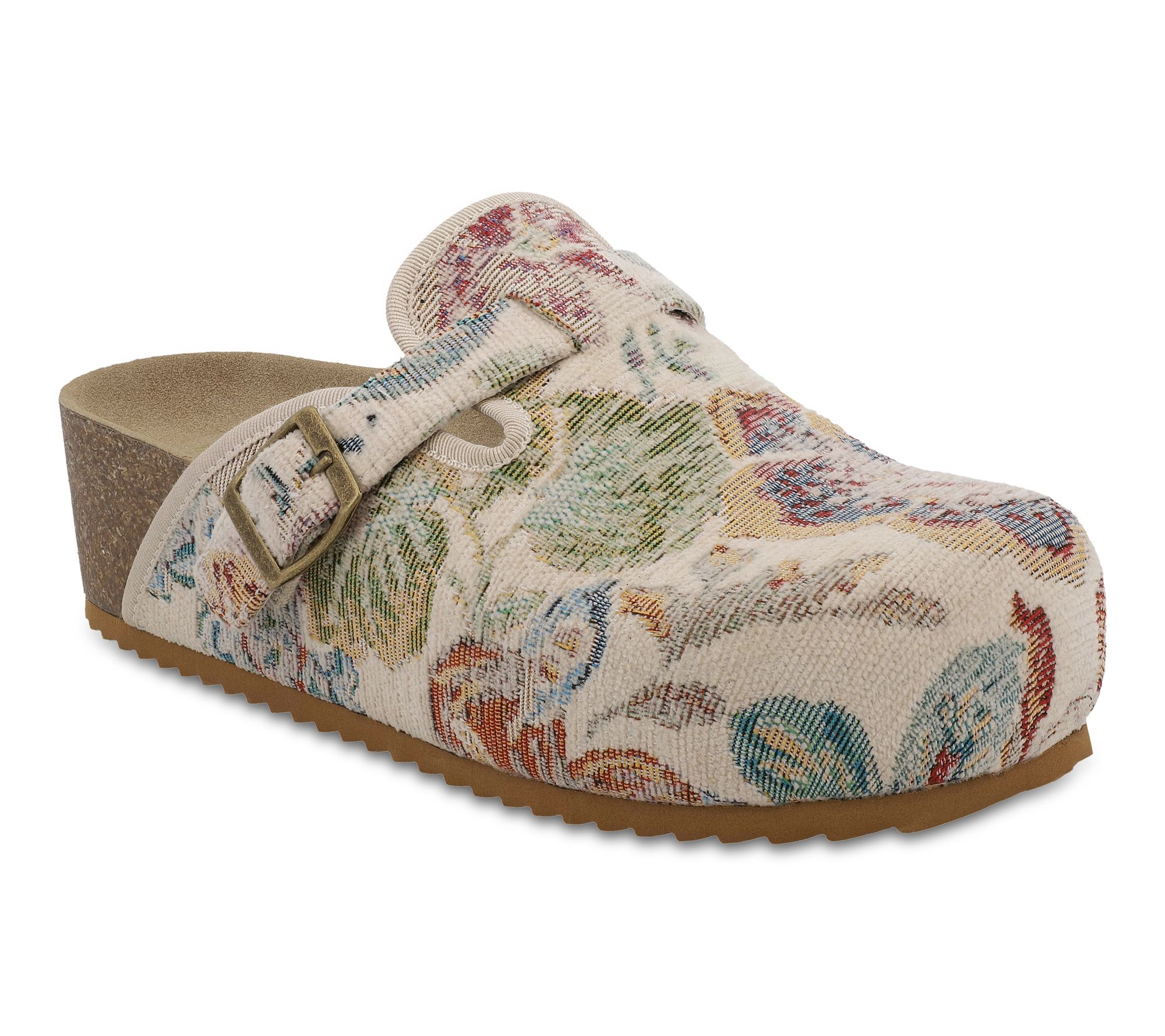 Slip-on mule with bold floral tapestry fabric upper, rounded toe, cork-wrapped platform, and brass buckle