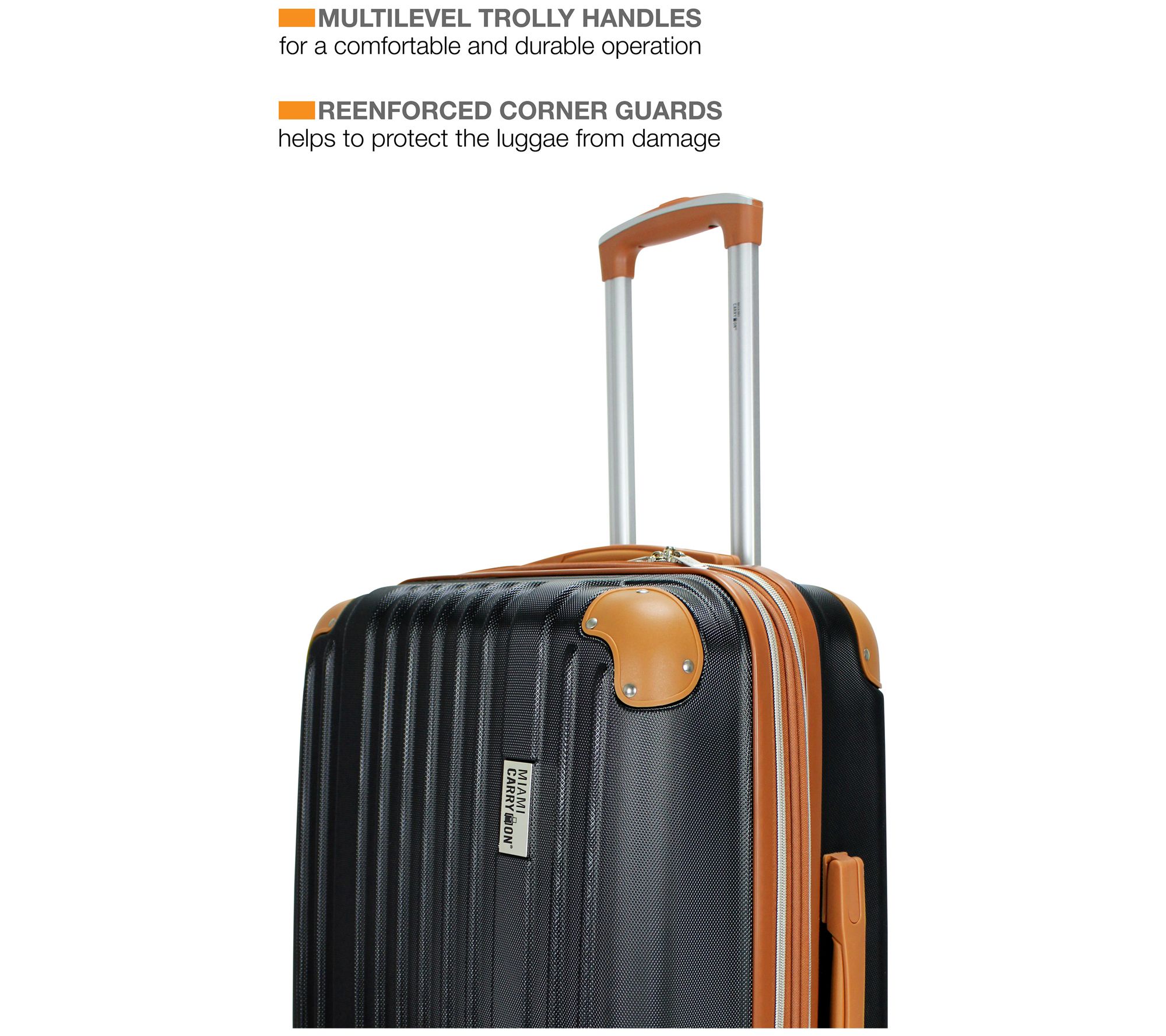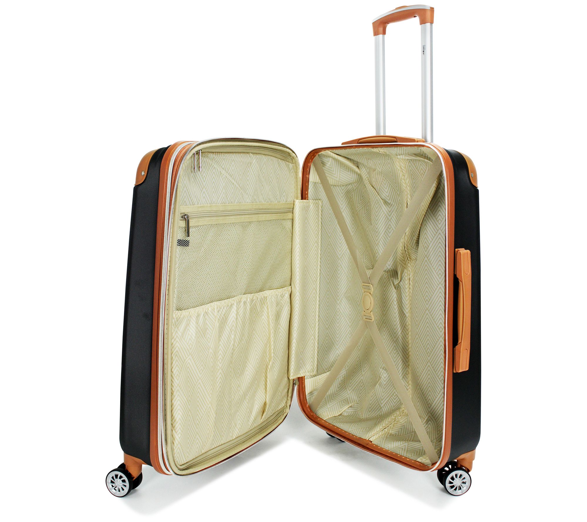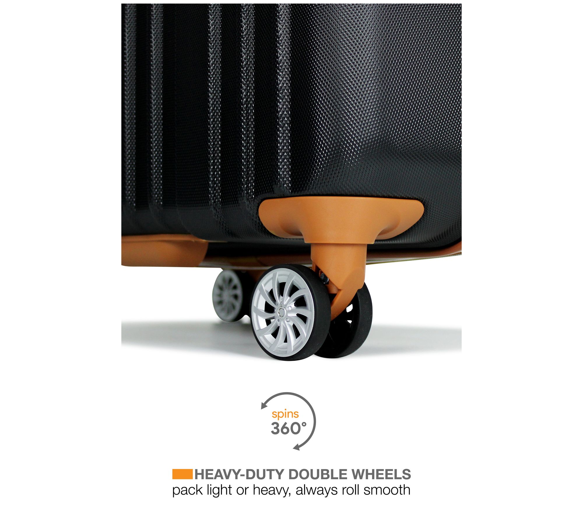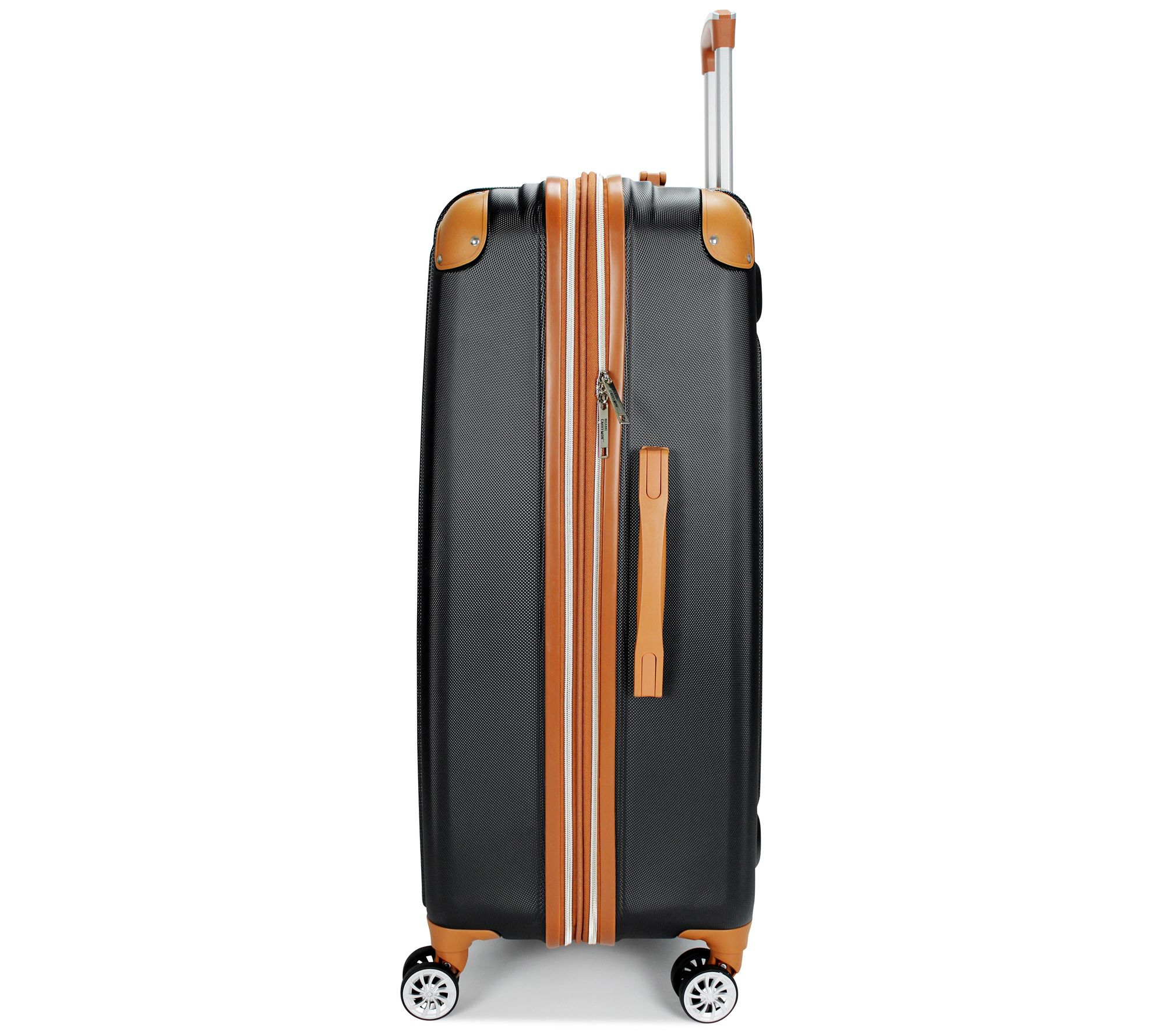 • Textured ABS construction, reinforced corner guards, rubber molded handles, eight spinner wheels, expandable design