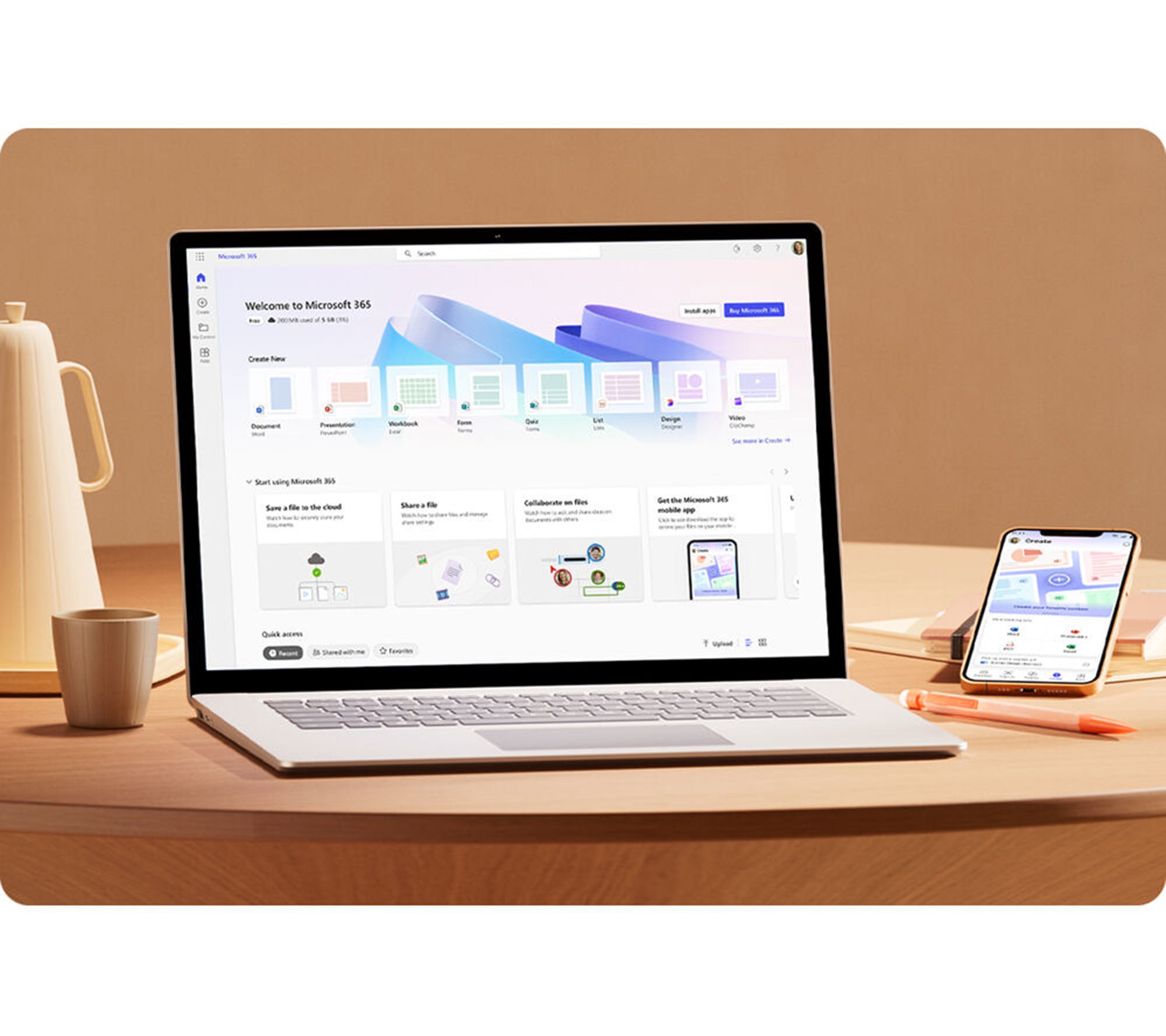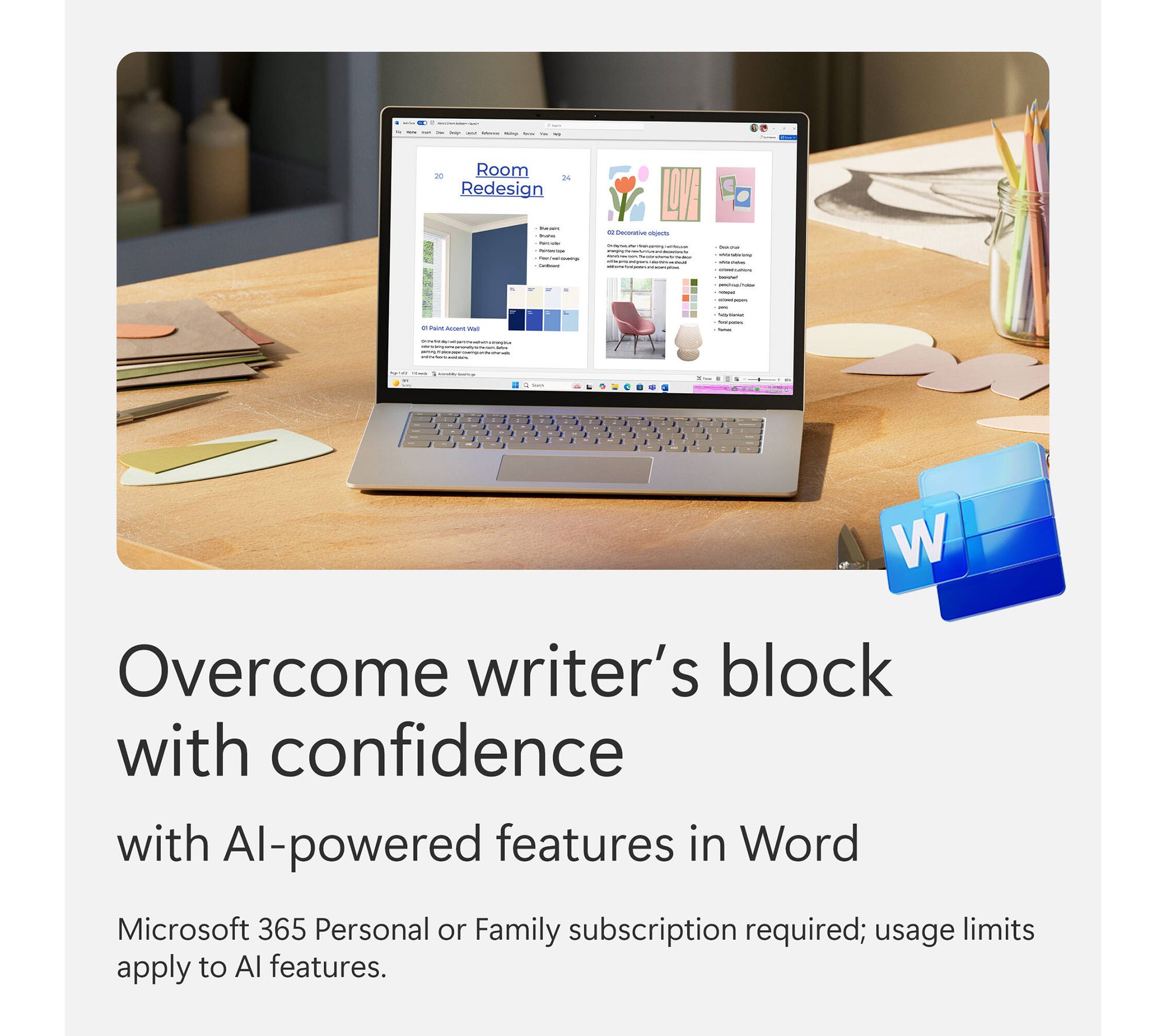 Bring your ideas to life! This bundle includes a one-year subscription to Microsoft 365, so you'll have access to Word, Excel, Power Point, and more.