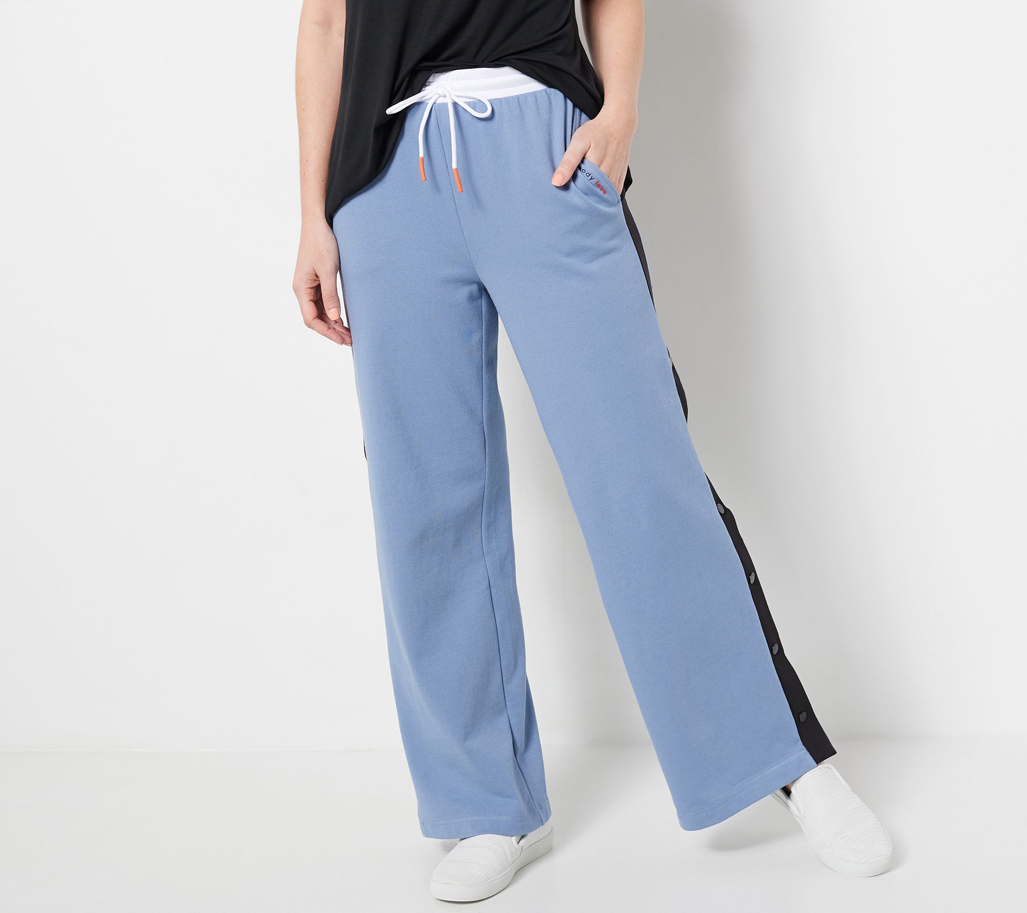 Features: contrast knit waistband along with tunneled elastic in the waistband, contrast side panel, side seam pocket and BL branded, branded matte enamel ocated snaps at side panels, red dash heat label at leg opening