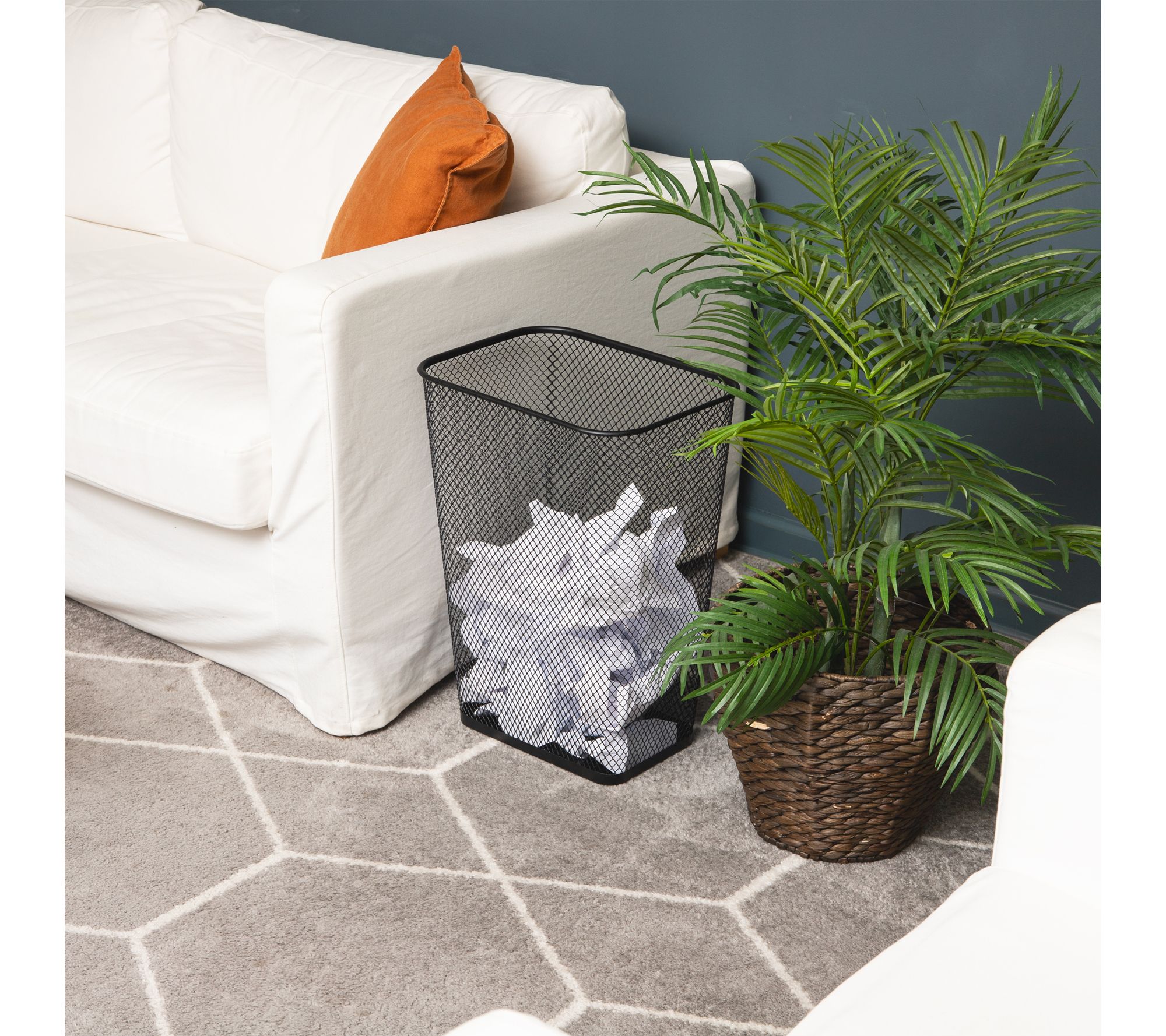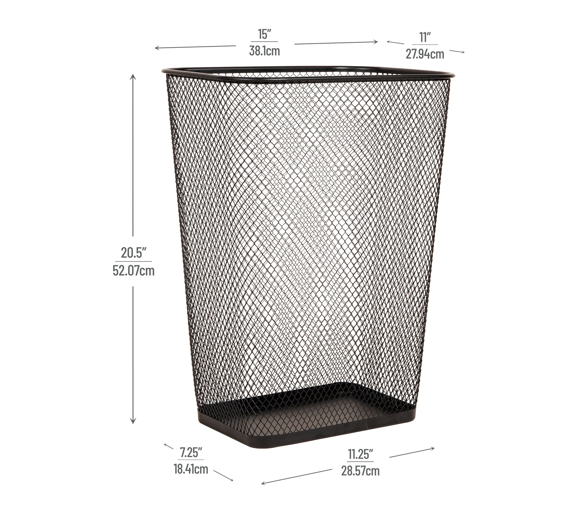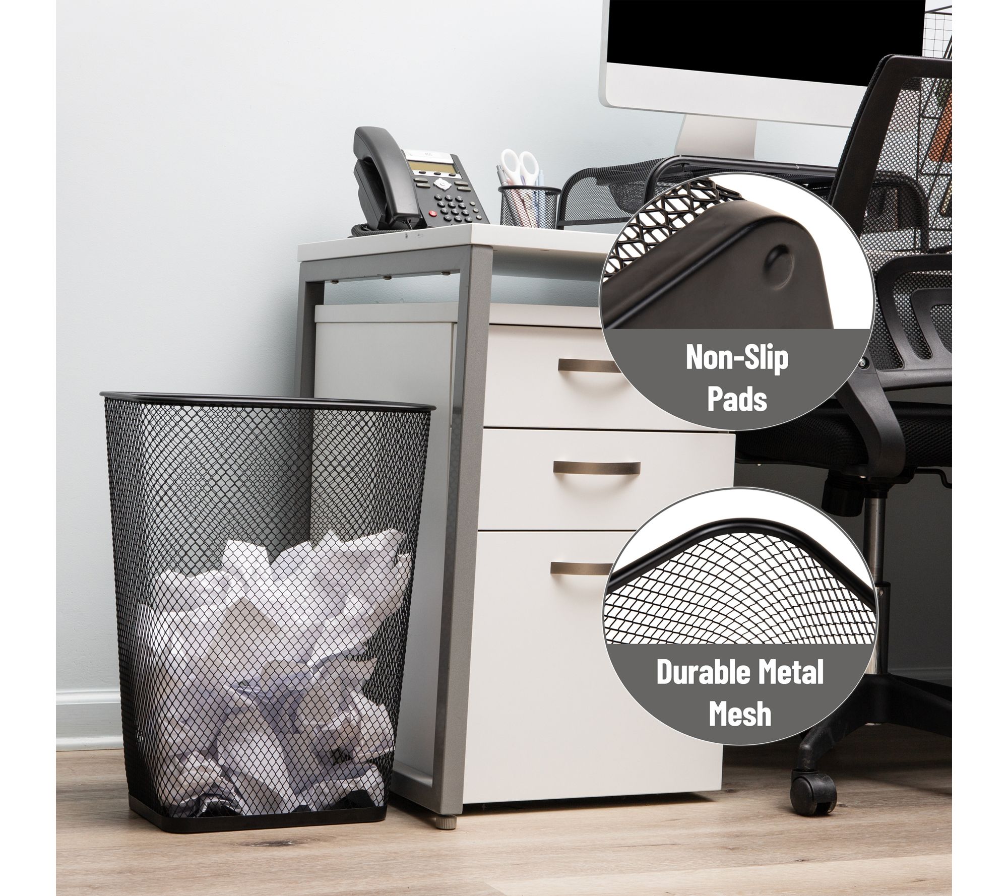 Keep your workspace or home tidy with this set of two metal mesh waste paper bins. The open mesh design offers airflow and lets you check contents easily, while the solid metal base helps contain spills and debris. Their tapered shape fits neatly beside desks or under tables, and non-slip pads help protect floors from scratches.