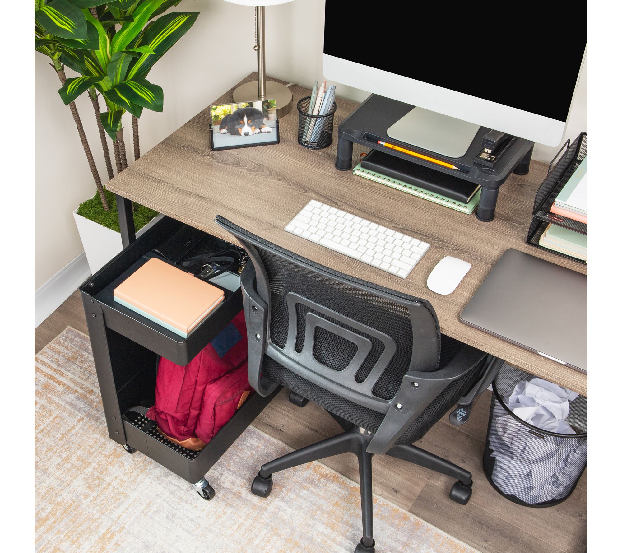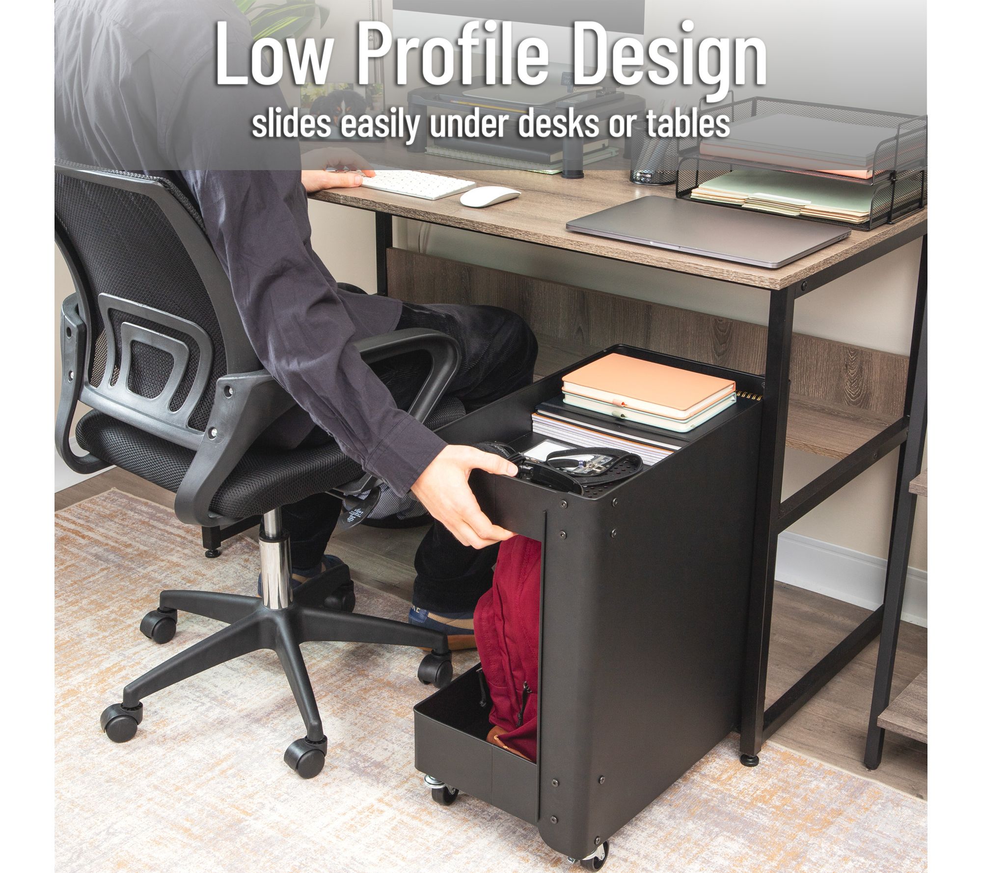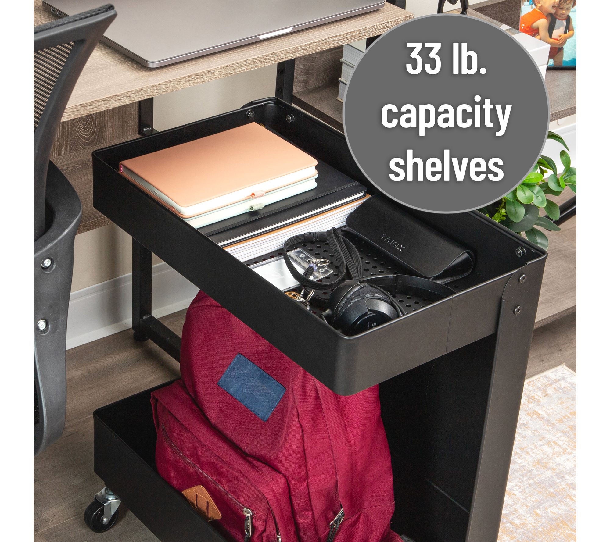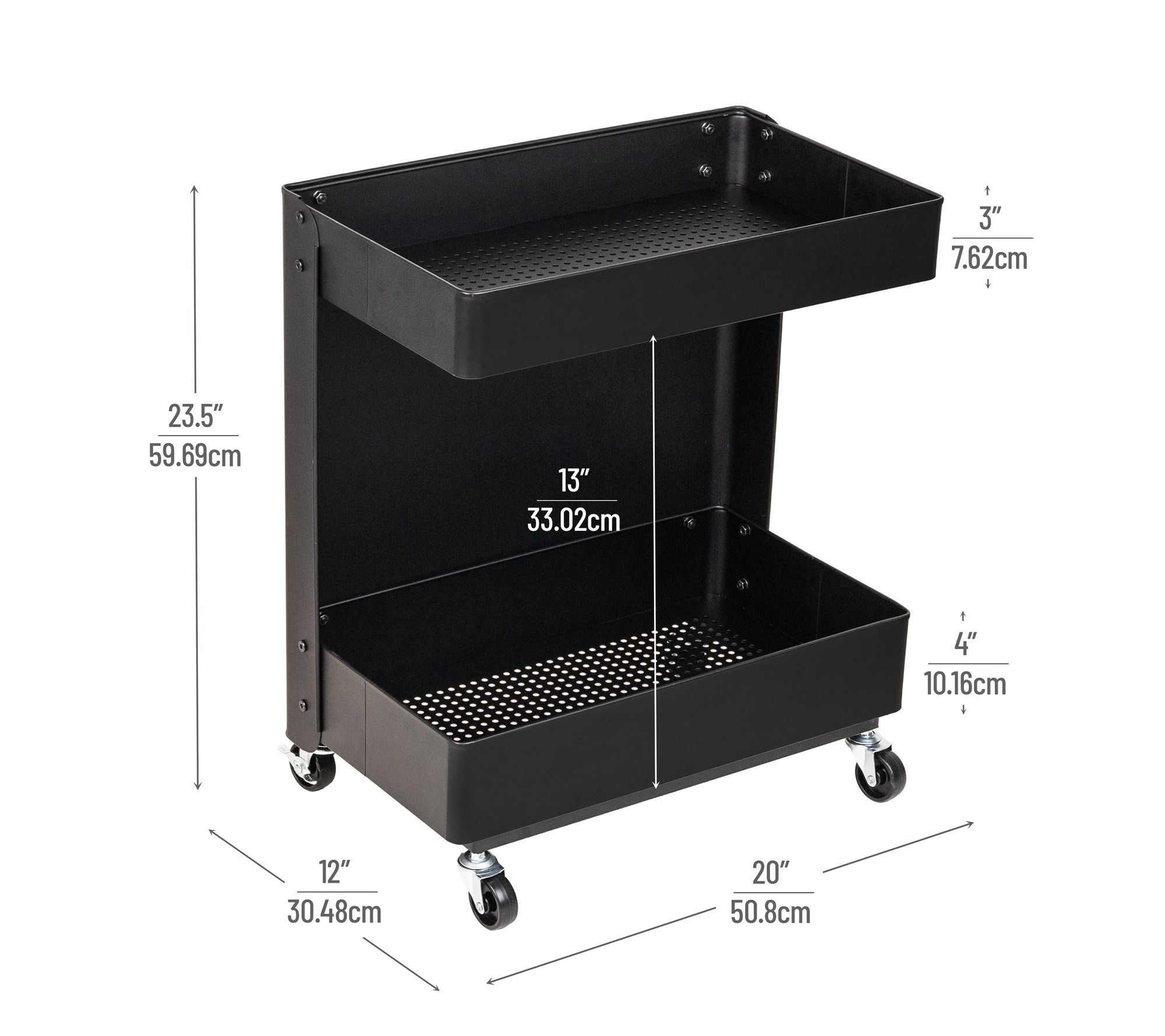 Keep office essentials within reach as you organize your workspace with this two-tier rolling cart. Its slim profile slides neatly under desks, while smooth wheels and sturdy metal shelves make it easy to store books, documents, and tech gear wherever you need them most. From Mind Reader.
