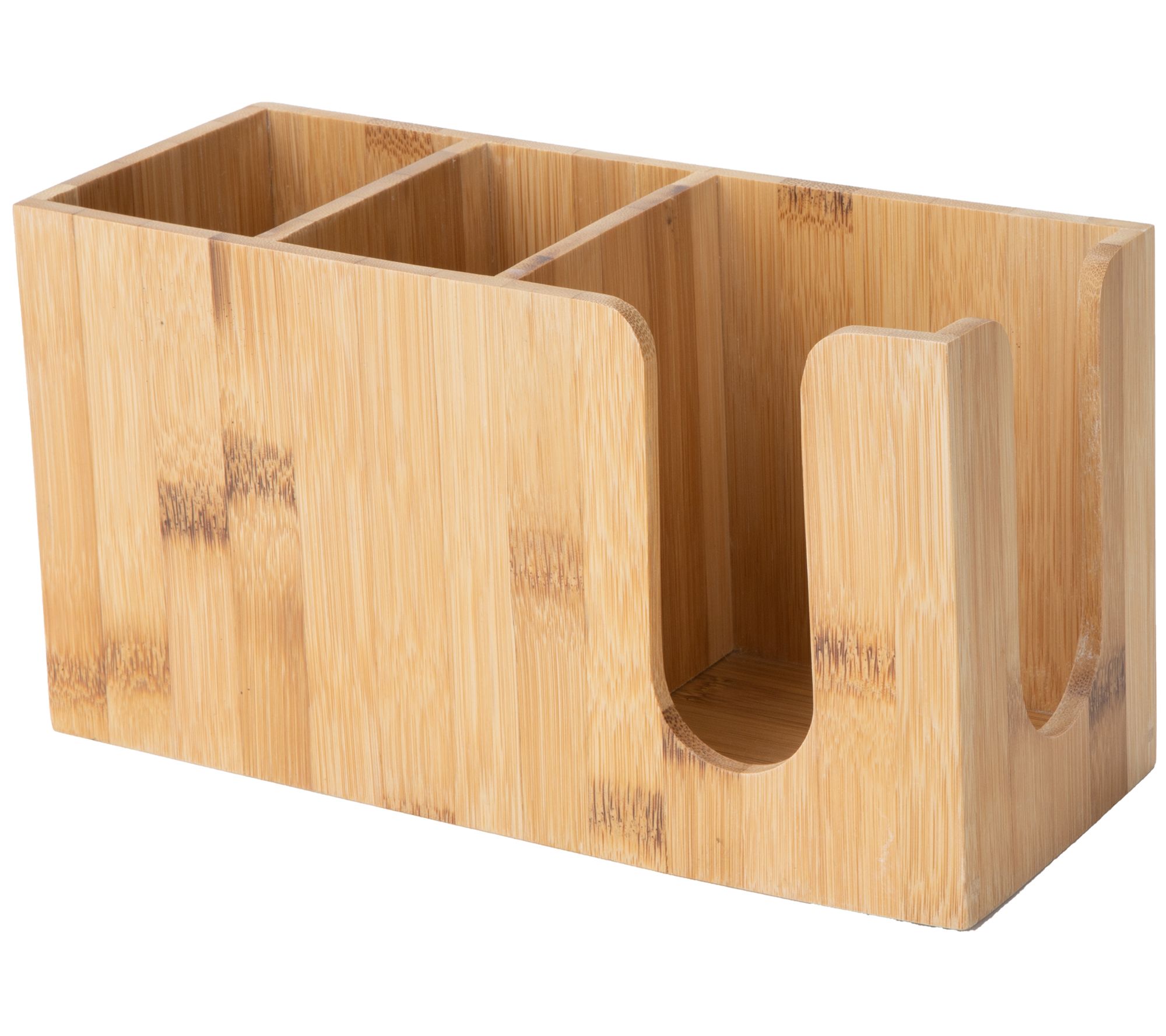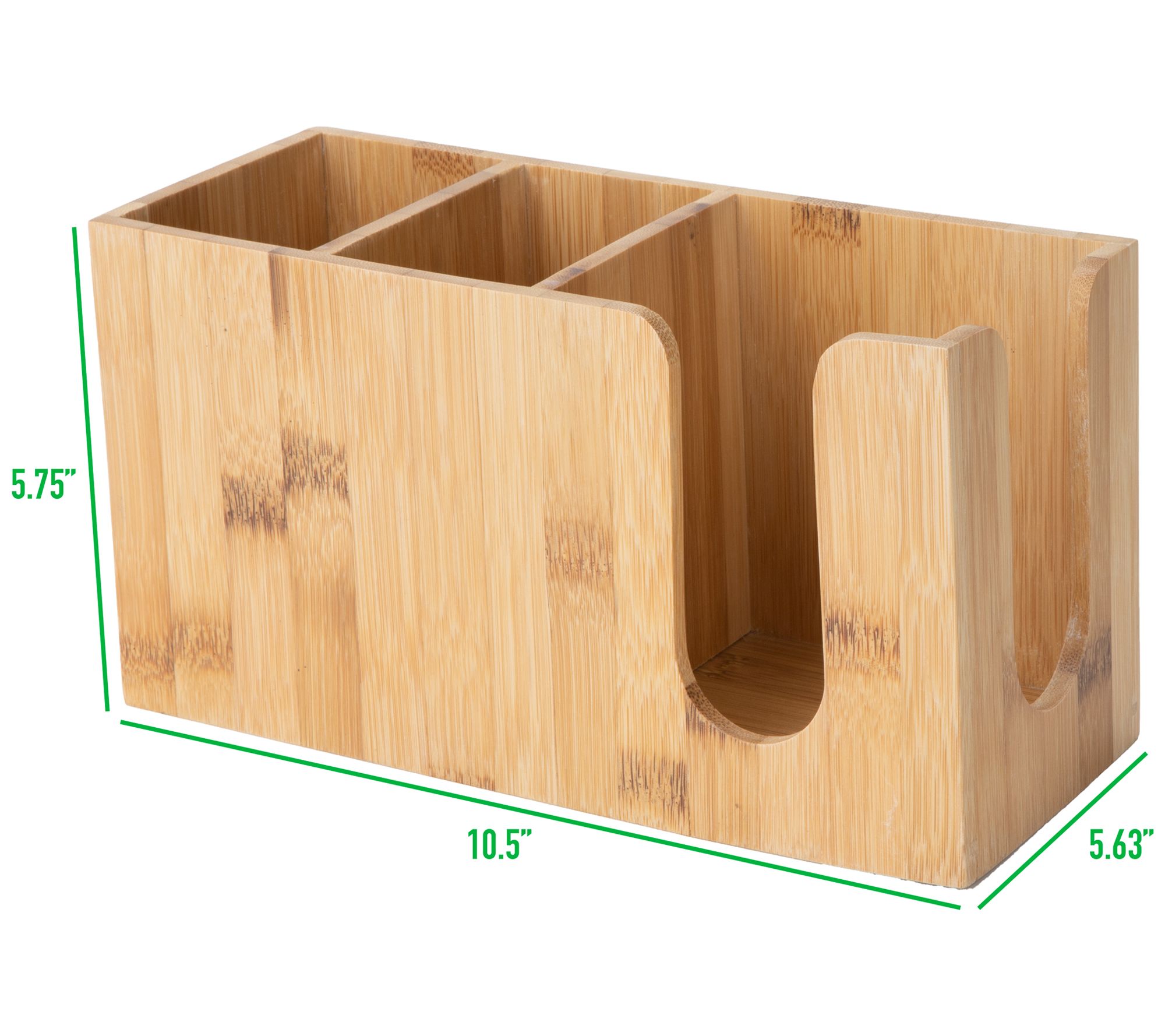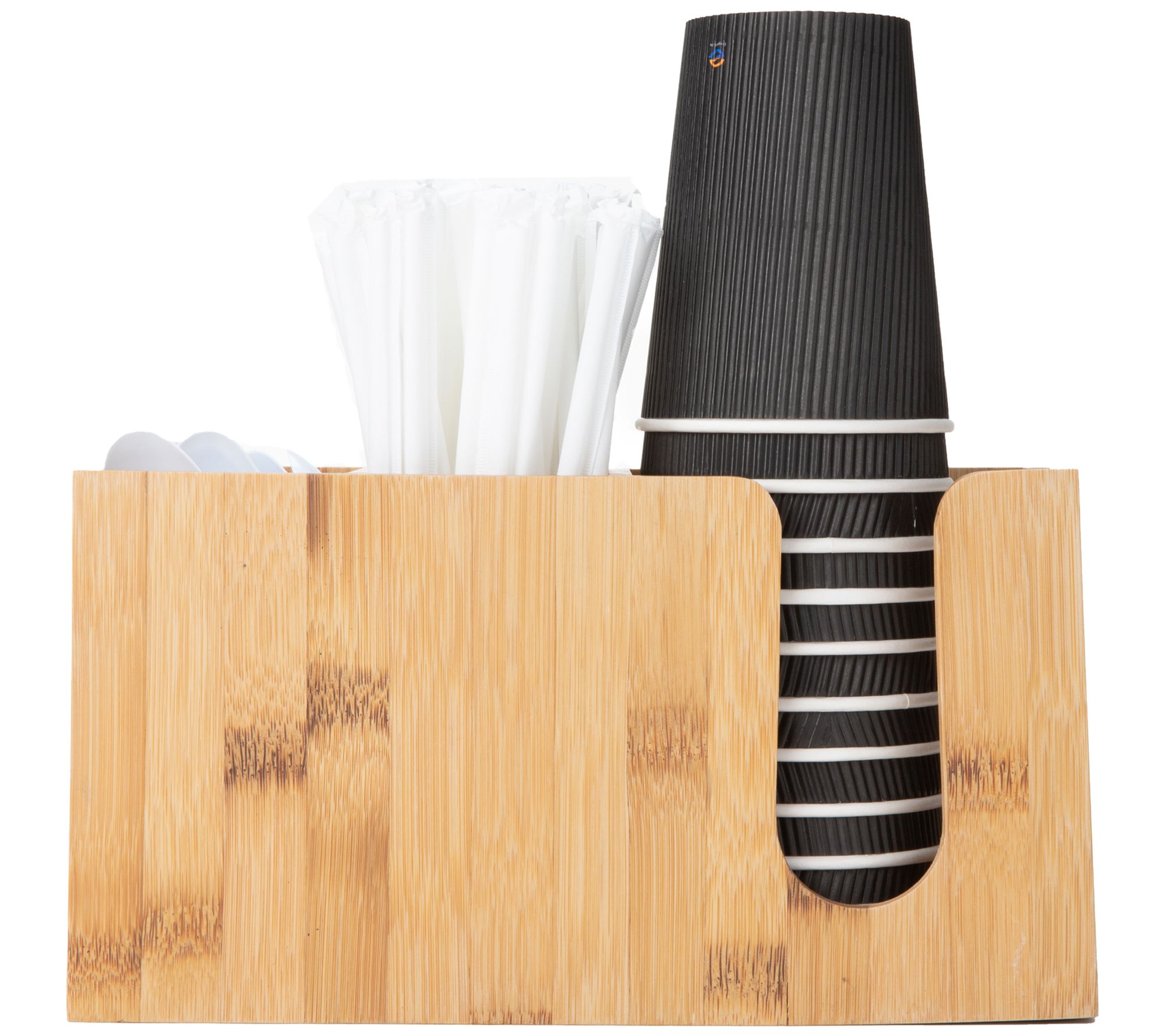 Tidy up your break room, hospitality area or kitchen with this multi-cup organizer that saves space and contains clutter. Designed to perfectly fit cups and lids in a variety of sizes, this durable bamboo wood organizer features three sections and its integrated rubber feet grip to prevent sliding. From Mind Reader Products.