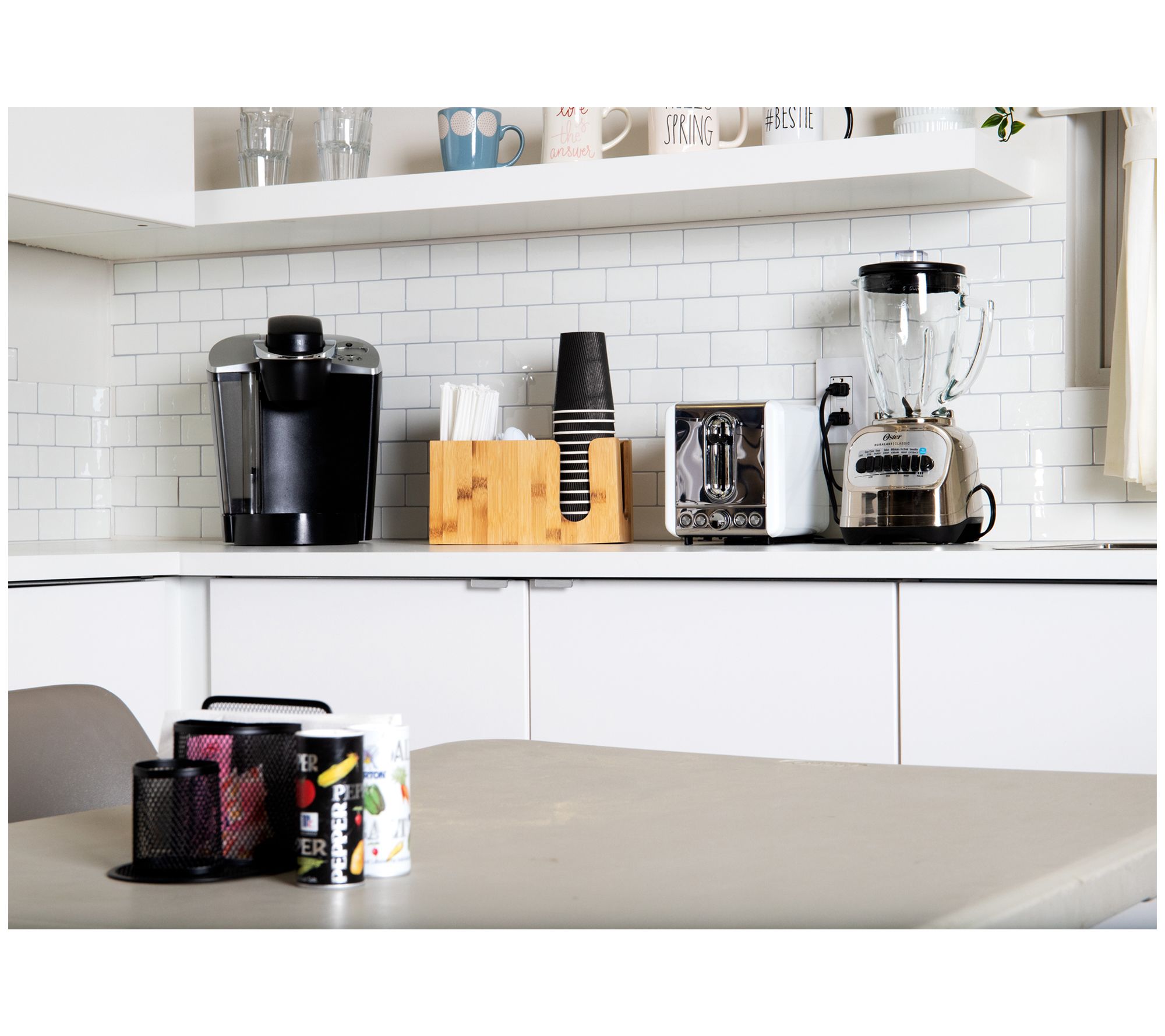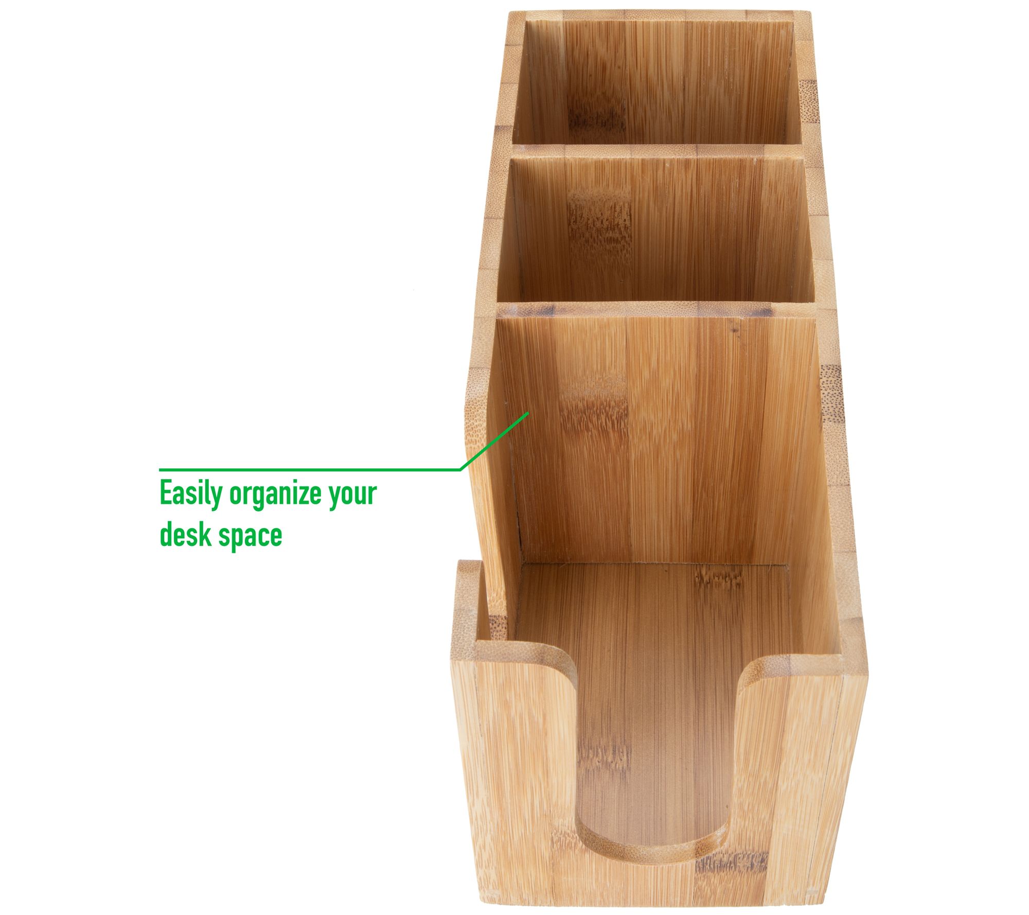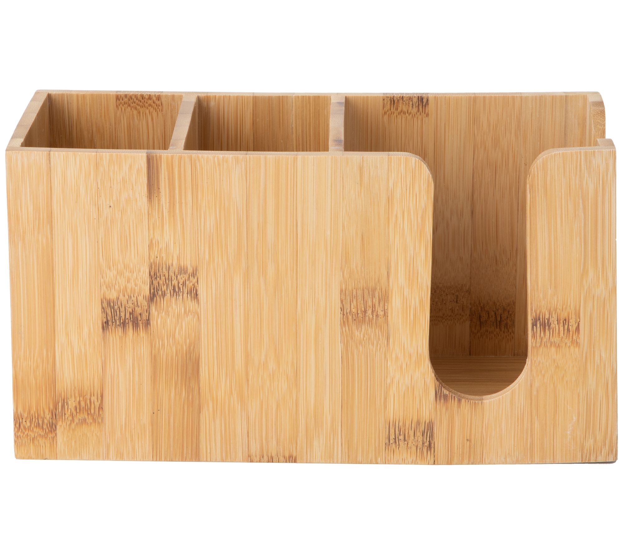 Tidy up your break room, hospitality area or kitchen with this multi-cup organizer that saves space and contains clutter. Designed to perfectly fit cups and lids in a variety of sizes, this durable bamboo wood organizer features three sections and its integrated rubber feet grip to prevent sliding. From Mind Reader Products.