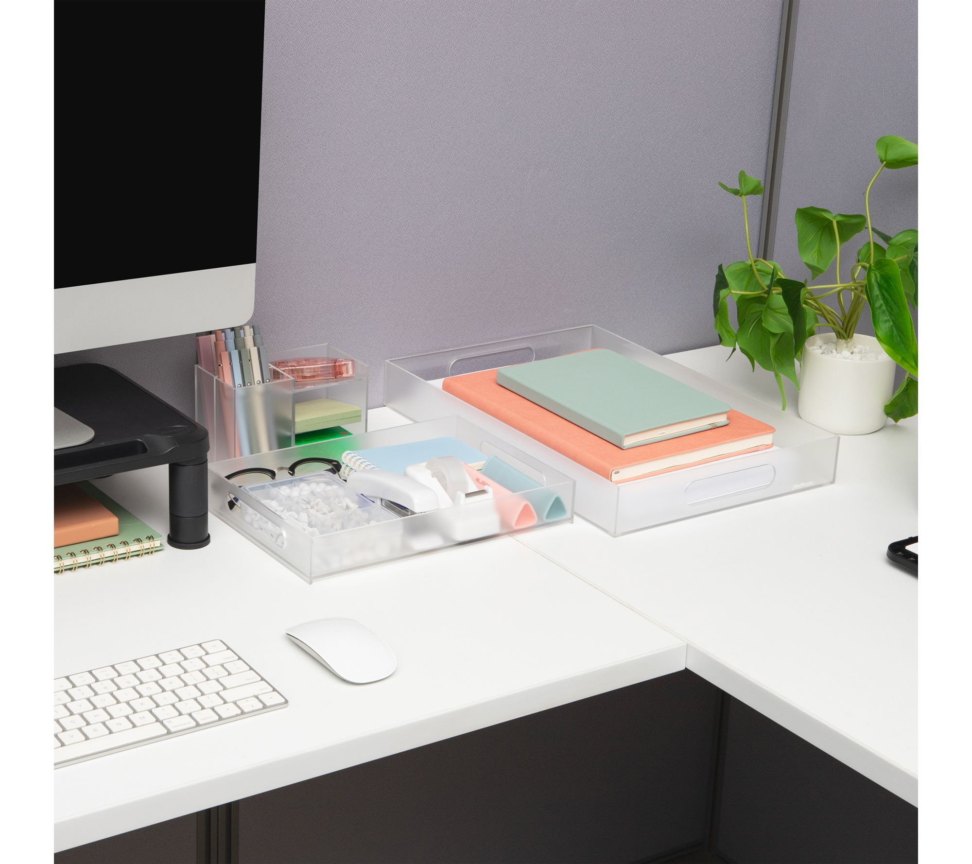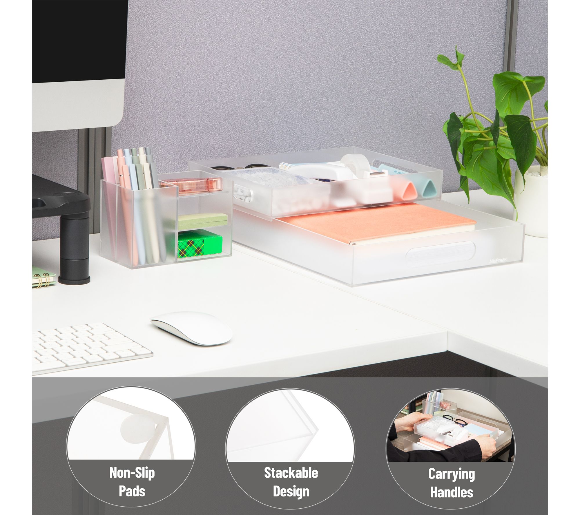 Create a streamlined, clutter-free workspace with this three-piece acrylic desktop organizer set. Its modular design lets you arrange the trays and organizer to fit your style -- store papers, pens, clips, and sticky notes with dedicated compartments that keep essentials within arm's reach. The frosted clear finish complements modern offices while ensuring everything remains visible and easy to access. From Mind Reader.