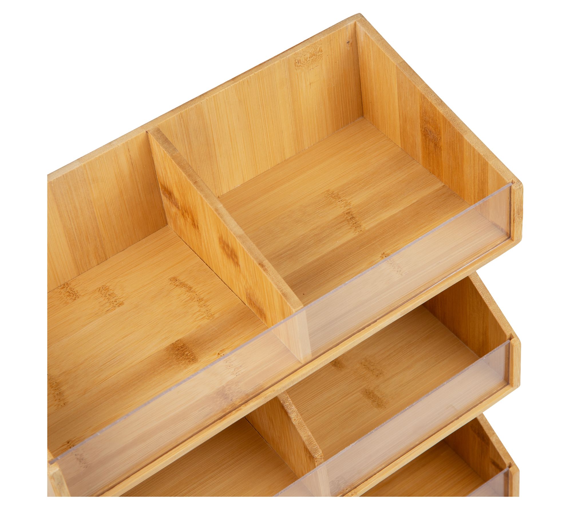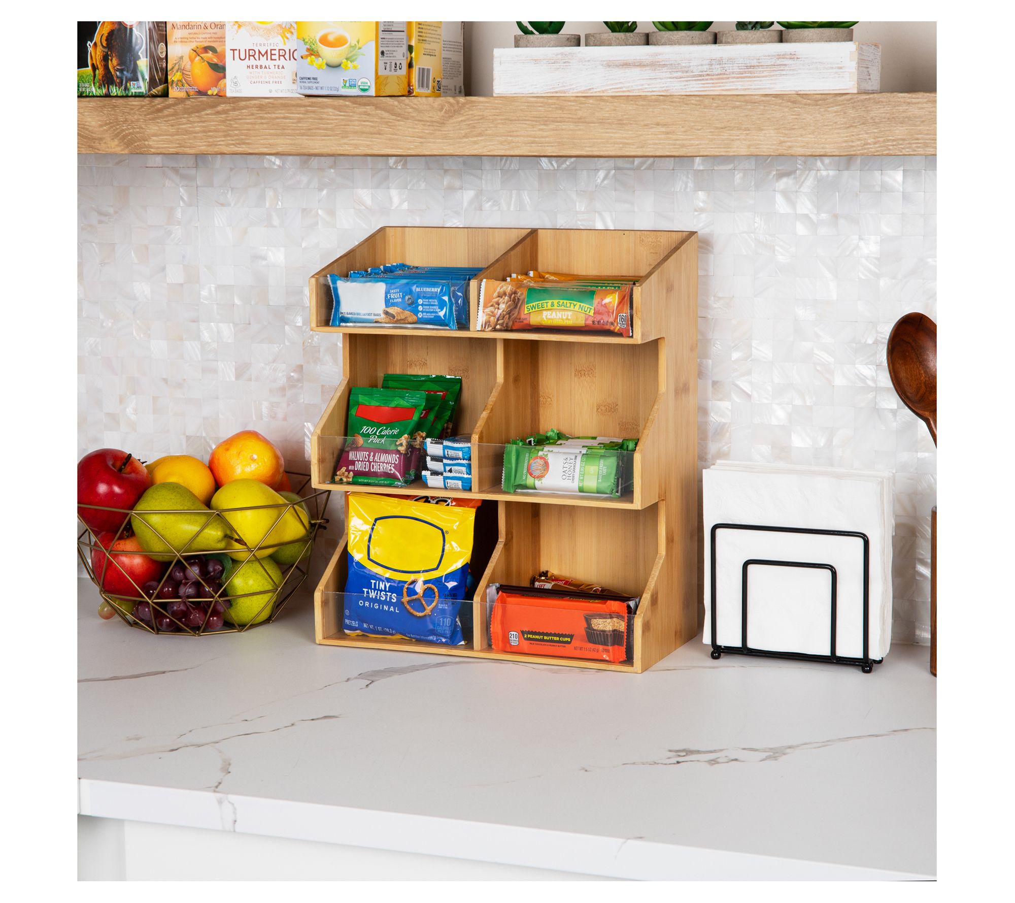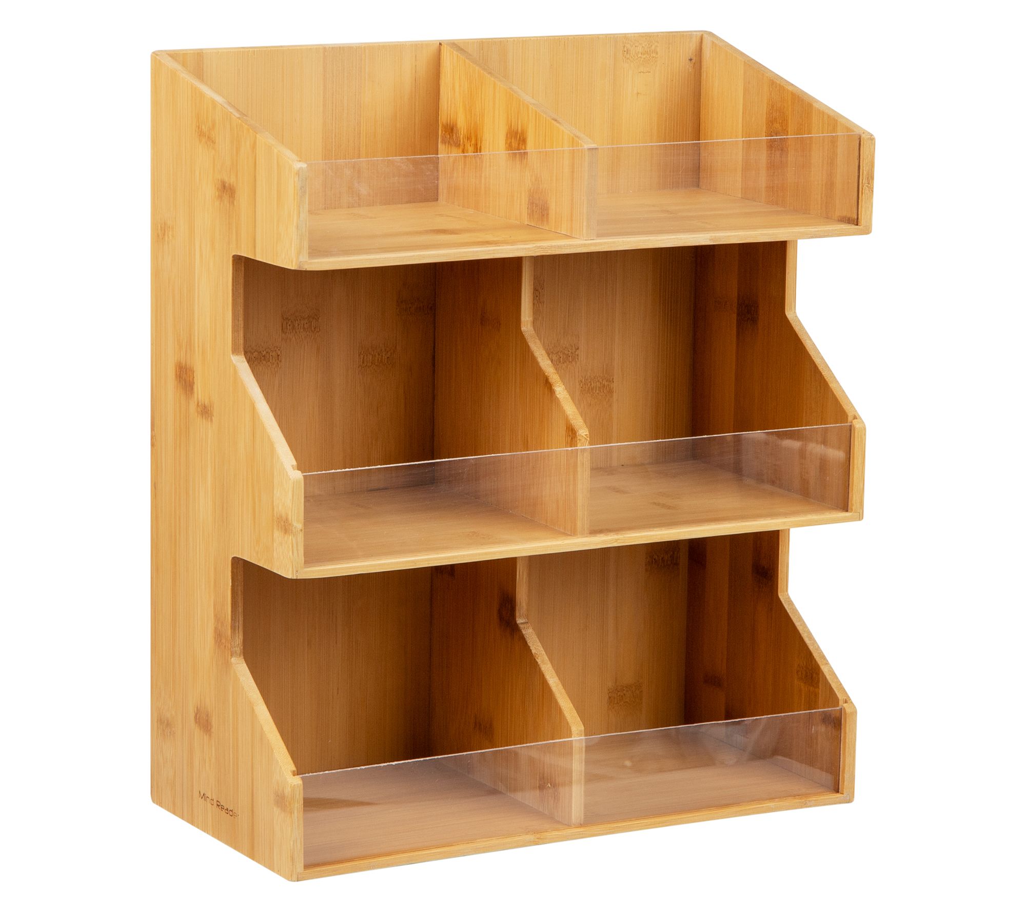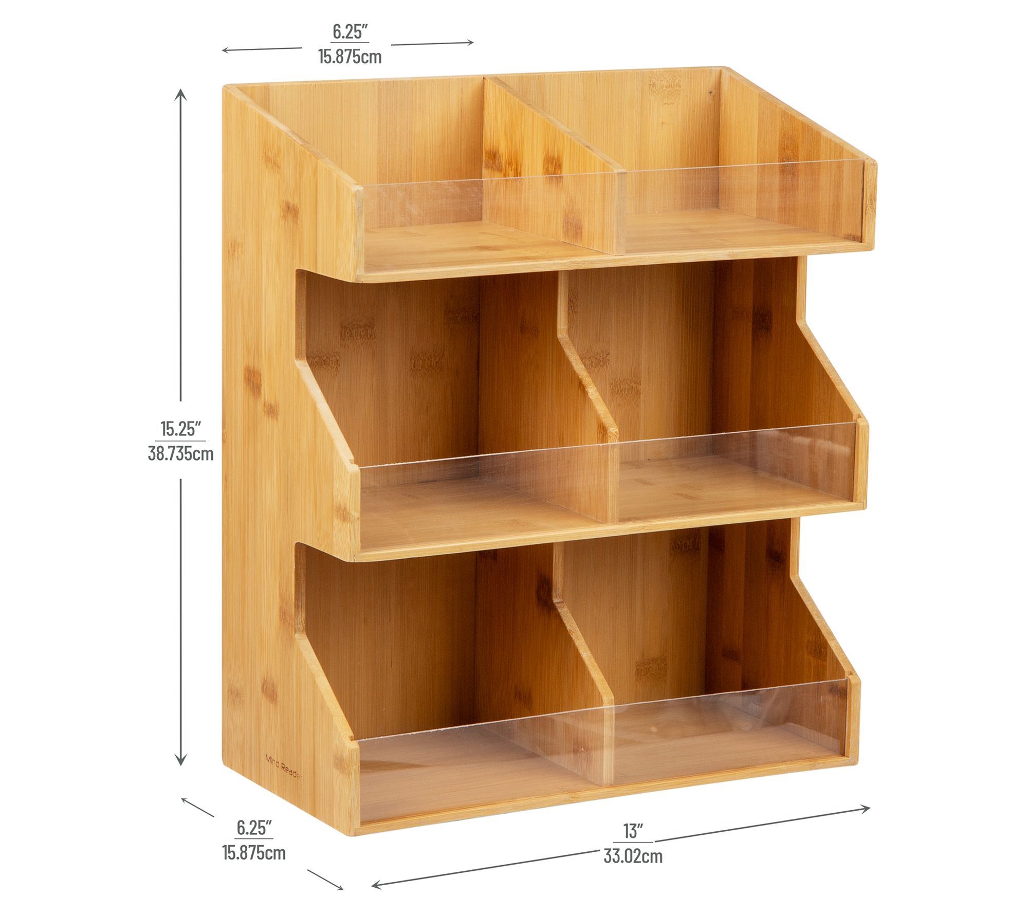 Effortlessly keep your space organized with the versatile 3-tier condiment organizer from the Bali Collection. With its six compartments and transparent PVC windows, you can easily view and access your items at a glance. Perfect for your coffee station, meal prep area, or craft table, this organizer combines both functionality and style. From Mind Reader.