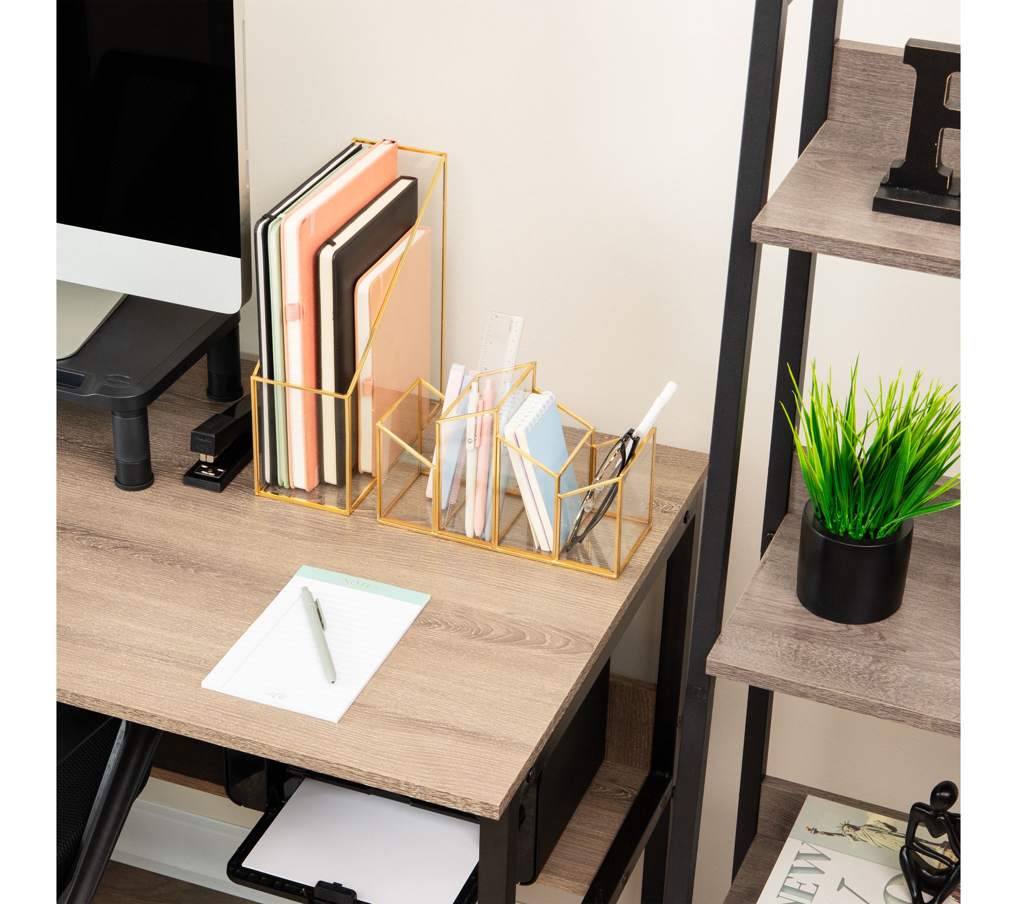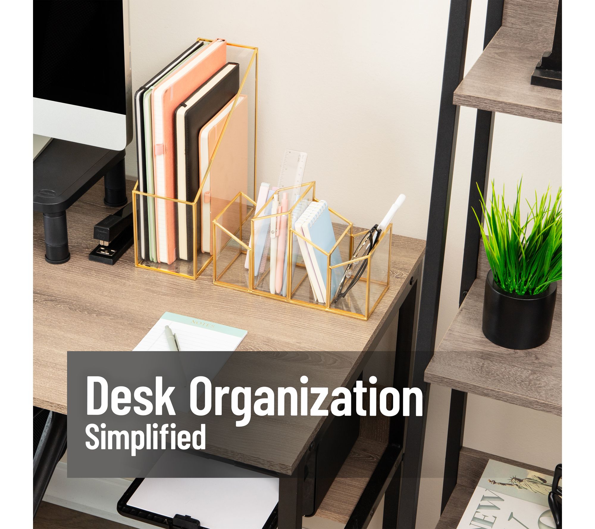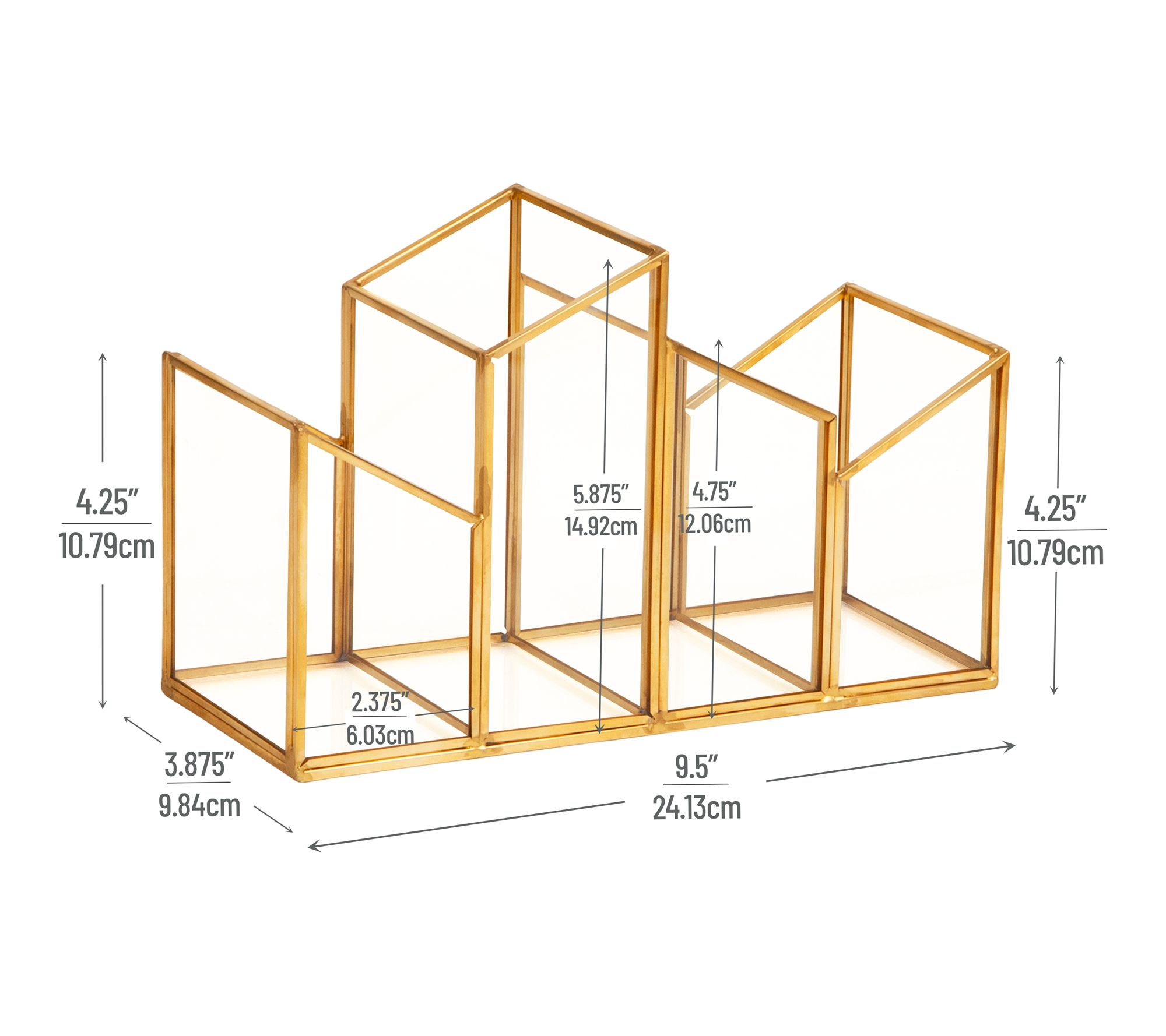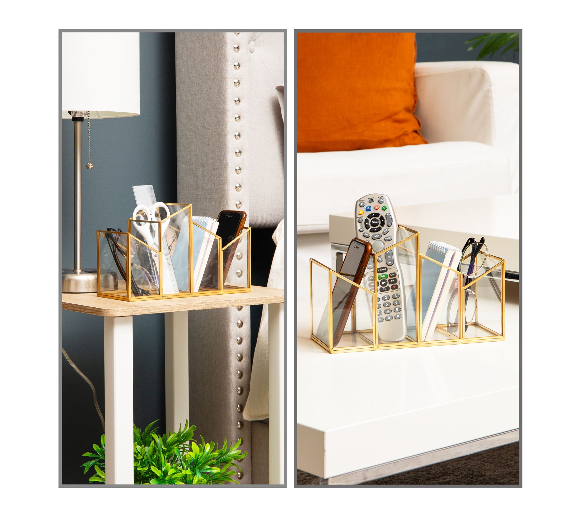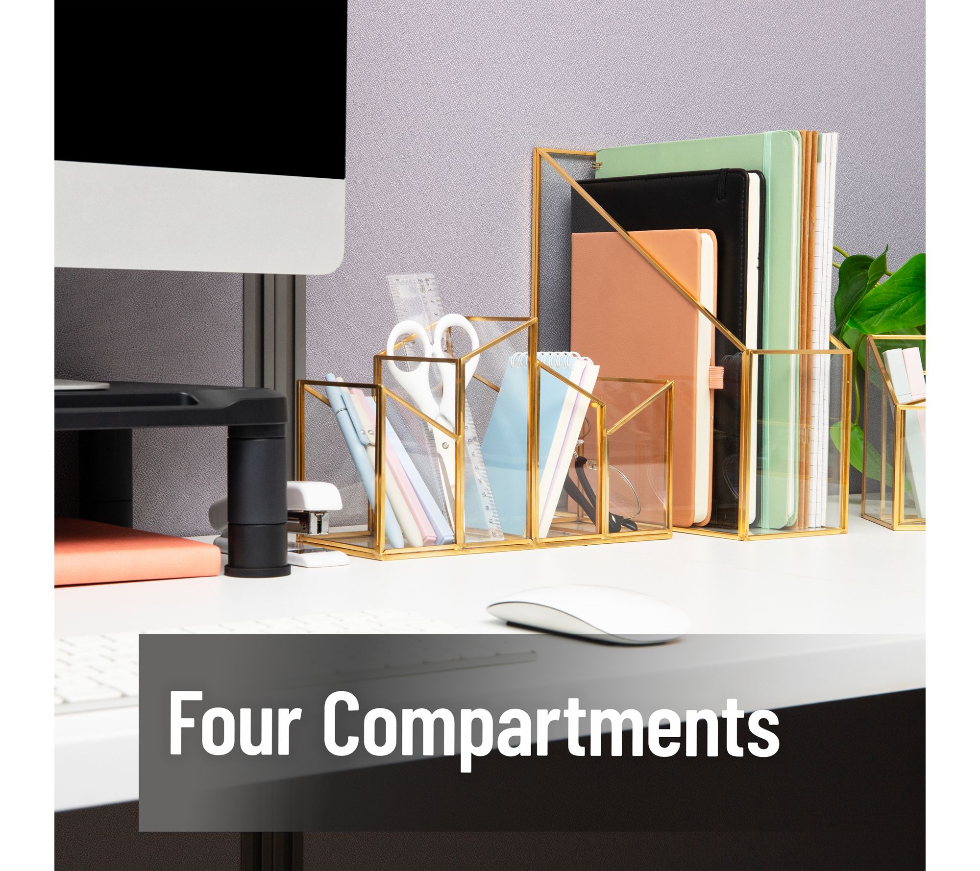 Create an organized, stylish workspace that inspires productivity with this glass desk organizer. Four angled compartments let you easily sort pens, pencils, and small accessories while the copper-trim frame adds a refined touch to any home office or creative space. The transparent design helps you quickly find what you need, keeping your desk clutter-free. From Mind Reader.