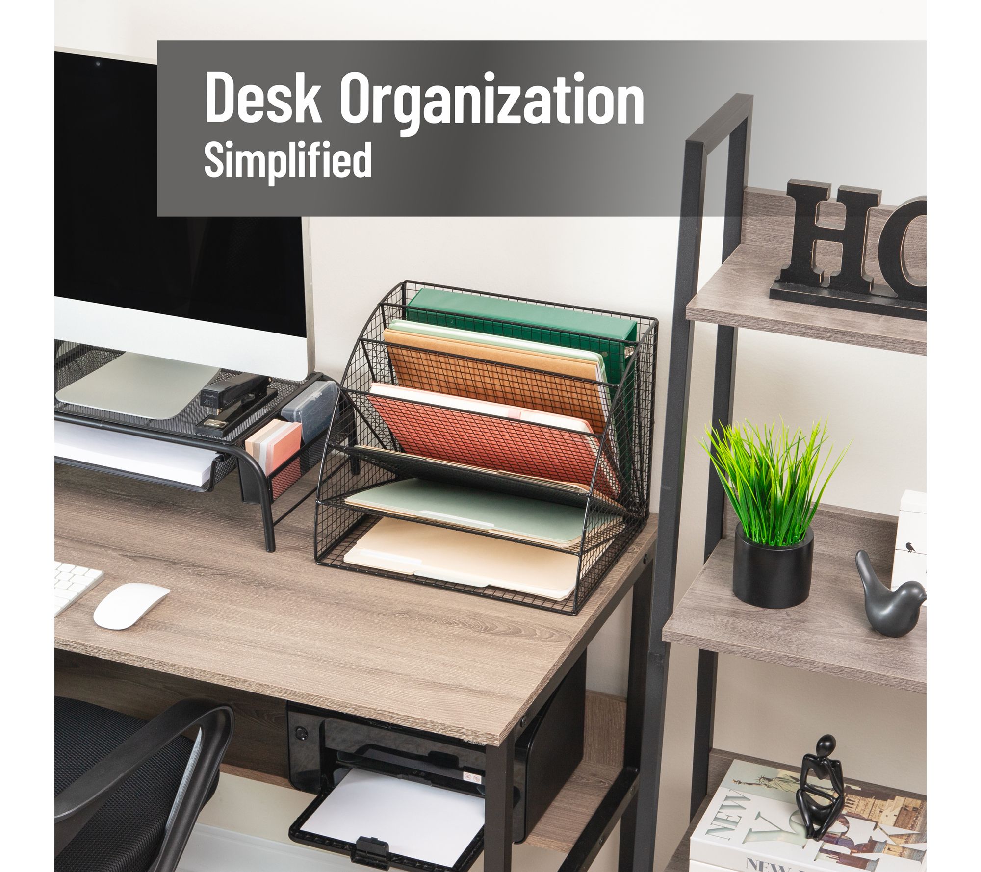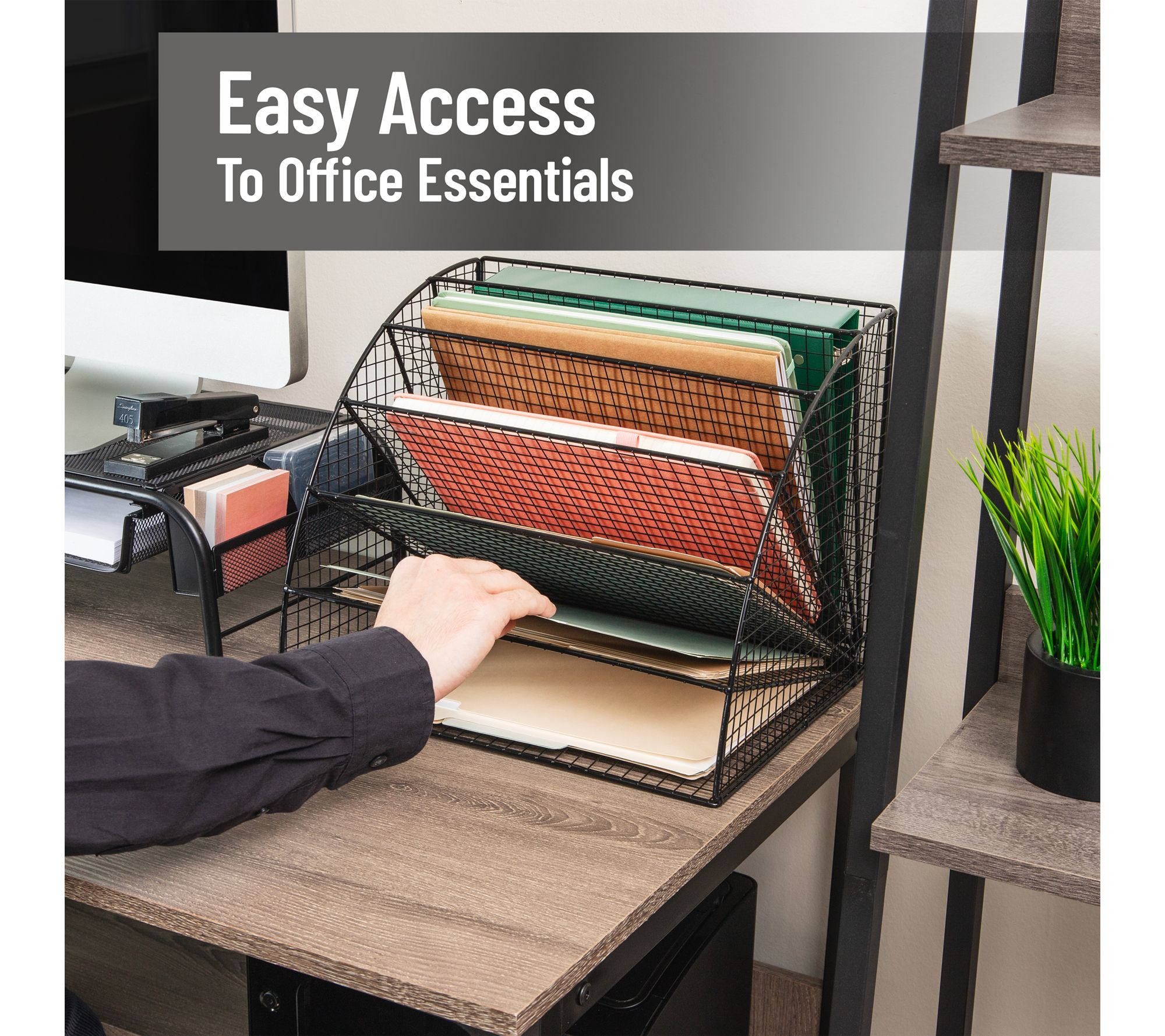 Keep your workspace tidy and stylish with this desktop file organizer. Its six fan-shaped tiers let you easily sort folders, notebooks, and documents, making everything accessible at a glance. The curved design adds a modern touch to any office or home desktop while maximizing usable space. From Mind Reader.
