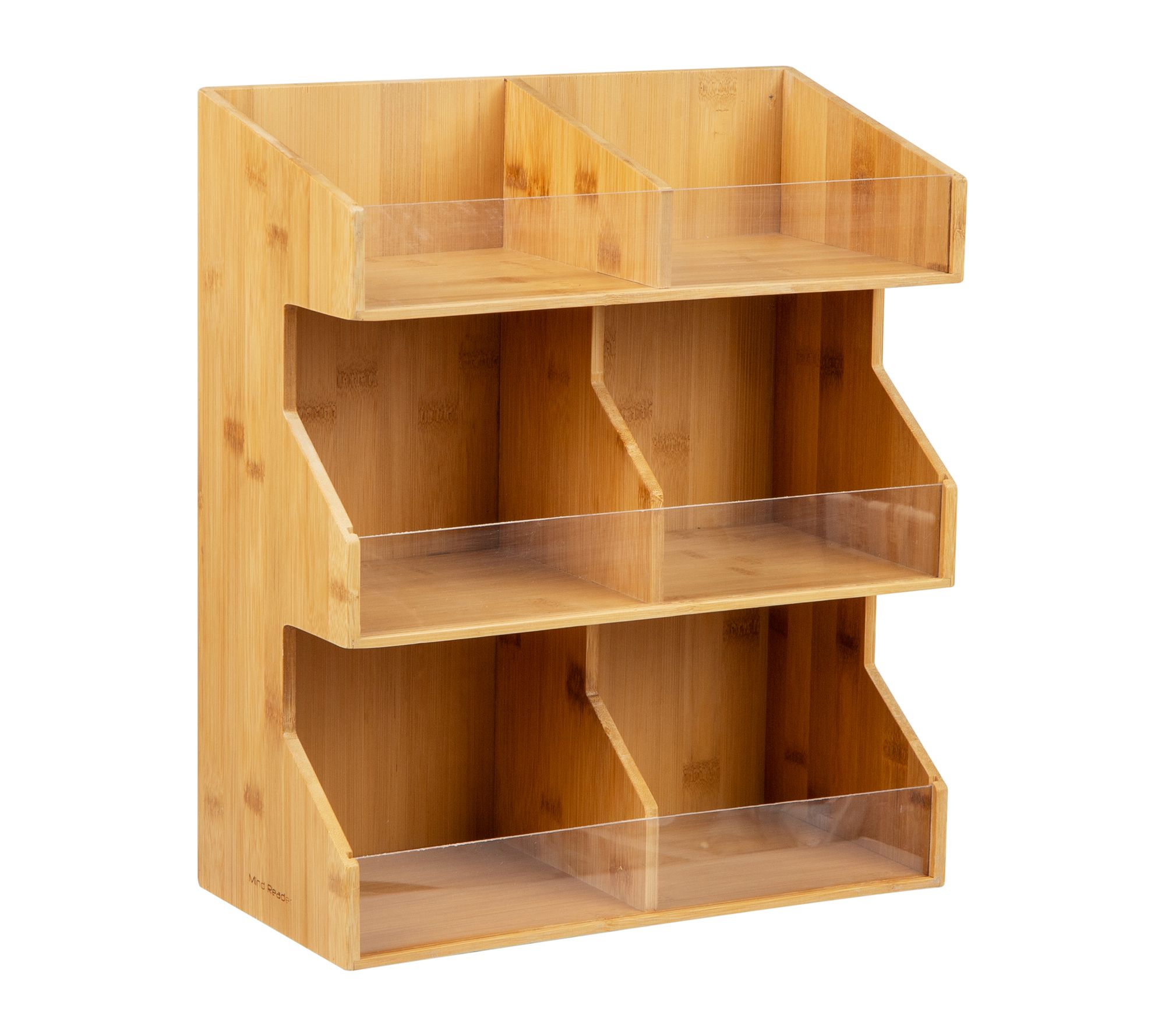Made from tough, eco-friendly bamboo wood, this coffee condiment and cup storage organizer is perfect for your kitchen or work break room. Its six compartments hold k-cups, sugar packets, stir straws, creamers and more, right at your fingertips. From Mind Reader Products.