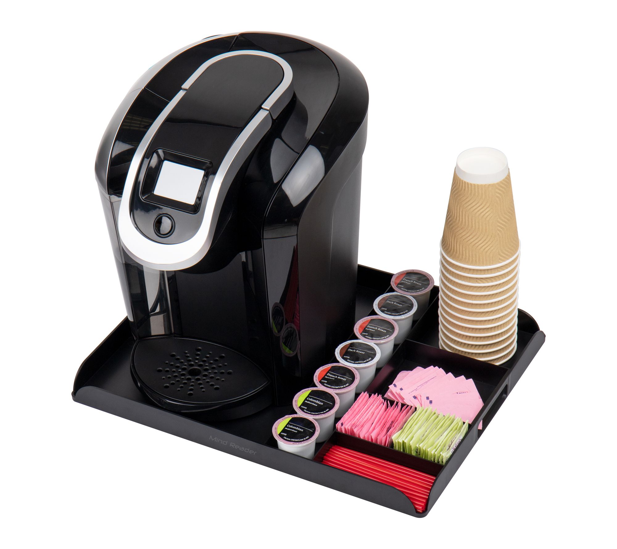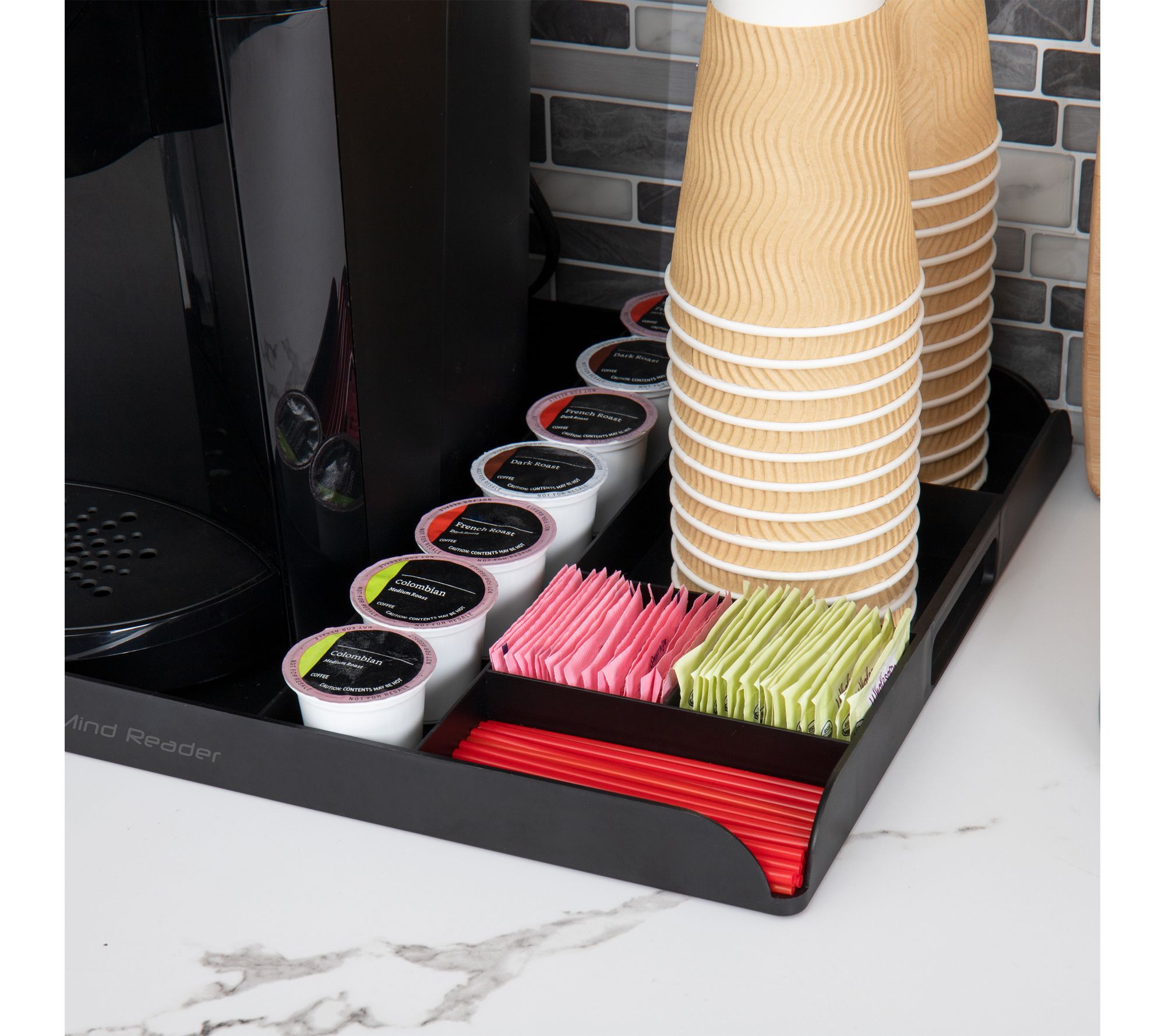 Bring order and flair to your coffee routine with this serving tray, designed to keep cups, pods, sweeteners, and creamers neatly organized. Its compact design fits easily under most coffee machines -- ideal for home coffee bars, office break rooms, or even dorm rooms. Create a welcoming beverage station that impresses guests and keeps your essentials close at hand. From Mind Reader.