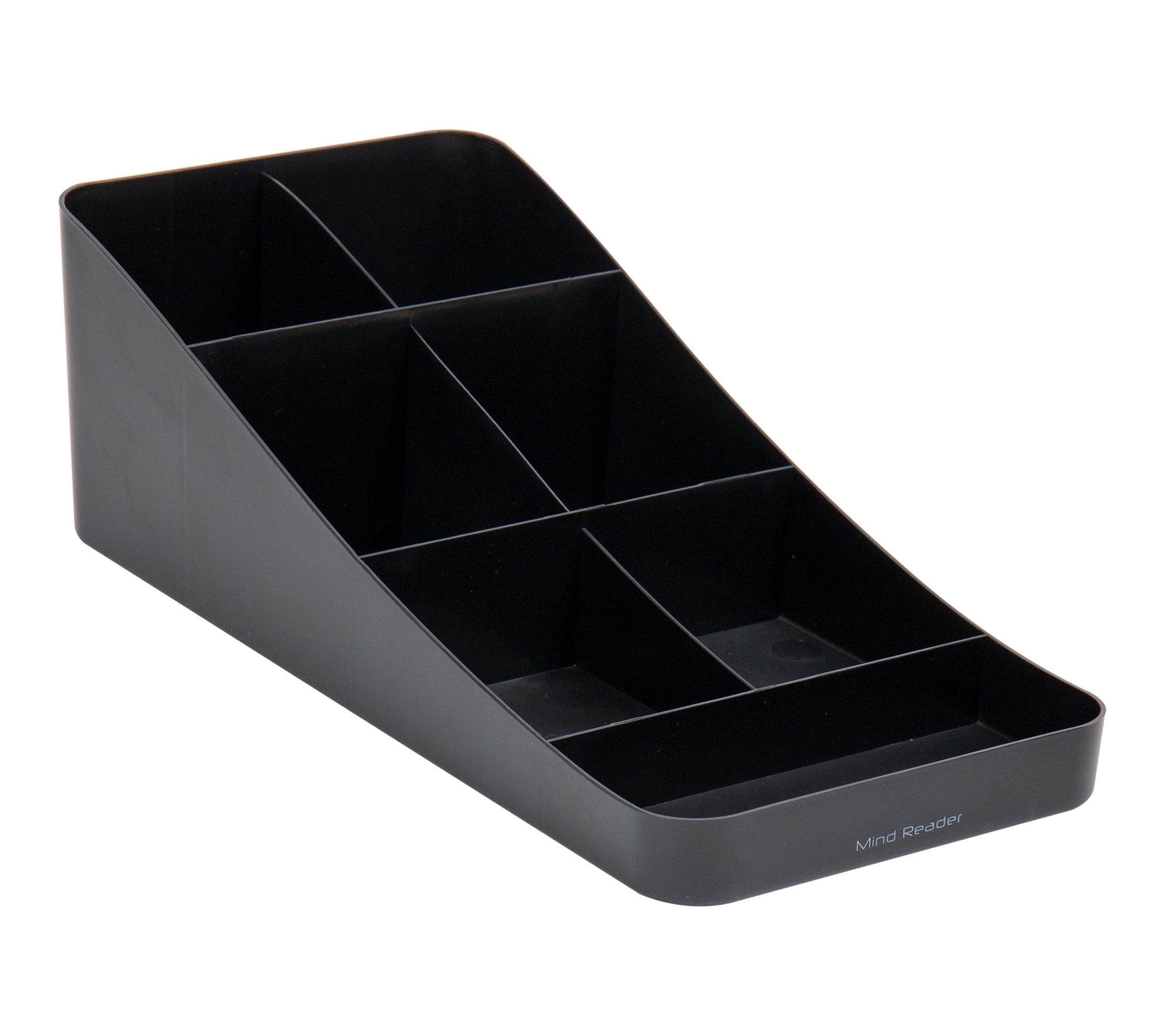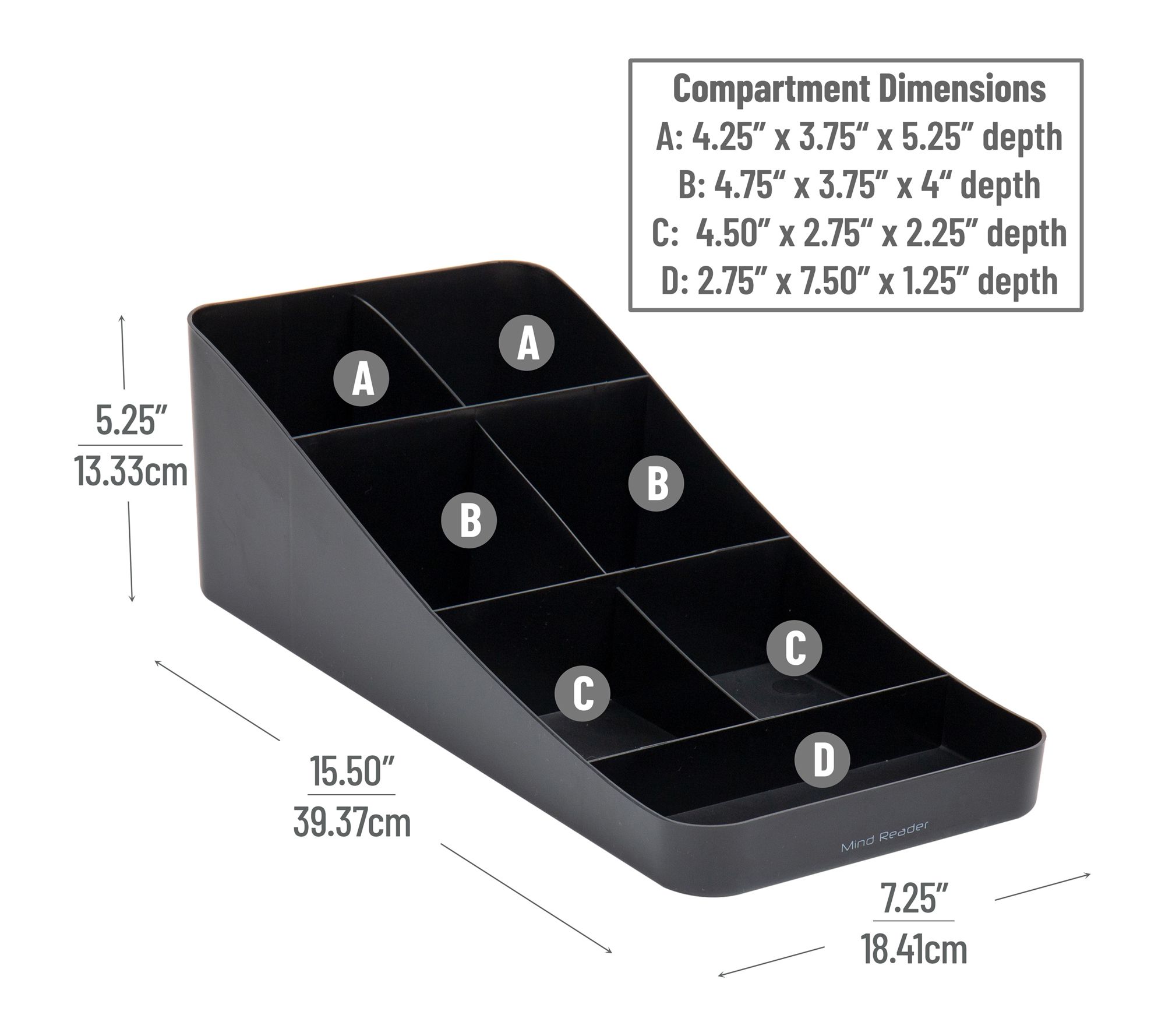 Streamline your morning routine and keep breakroom essentials neatly within reach with this countertop cup and condiment organizer. With seven compartments designed for everything from coffee pods to tea bags and stirrers, it brings order to bustling offices and home coffee bars alike. Its compact size and sleek design make it easy to fit in even the coziest spots. From Mind Reader.