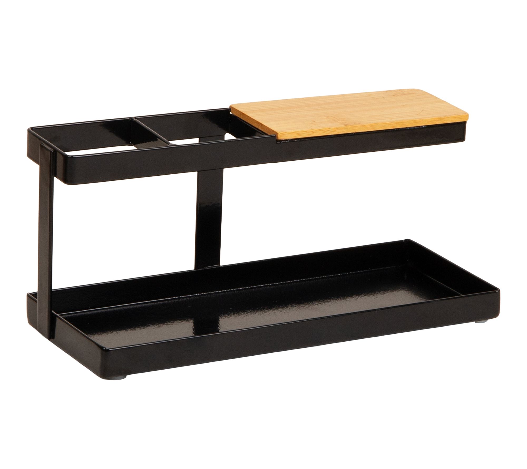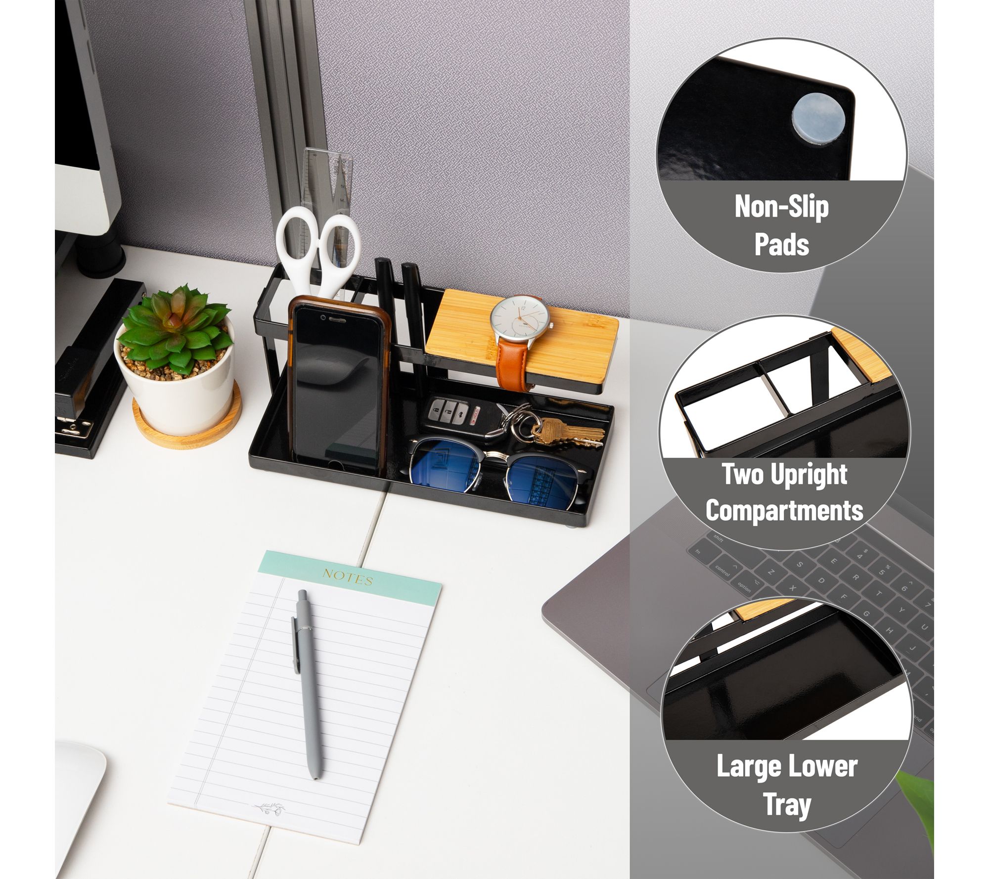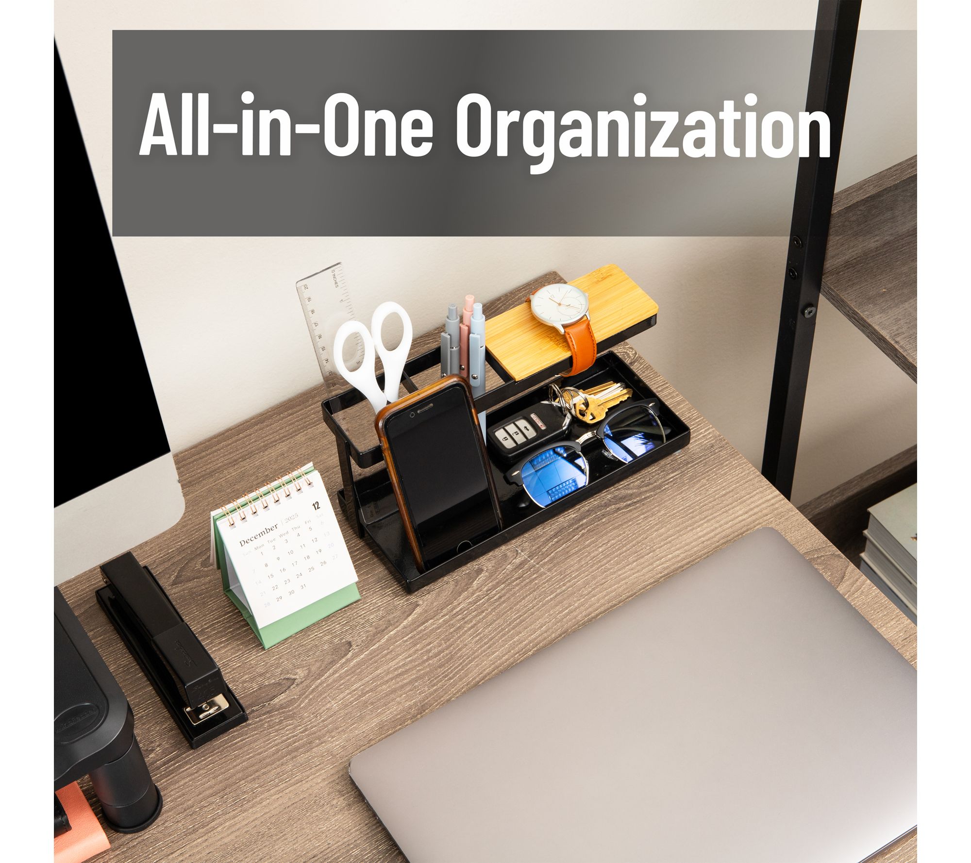 Tame the everyday chaos of your workspace with this desktop organizer, designed to keep tech gadgets, pens, keys, and other essentials neatly in place. Its modern steel and wood construction provides stylish storage, while multiple compartments make it easy to stay organized in your office, entryway, or bedroom. From Mind Reader.