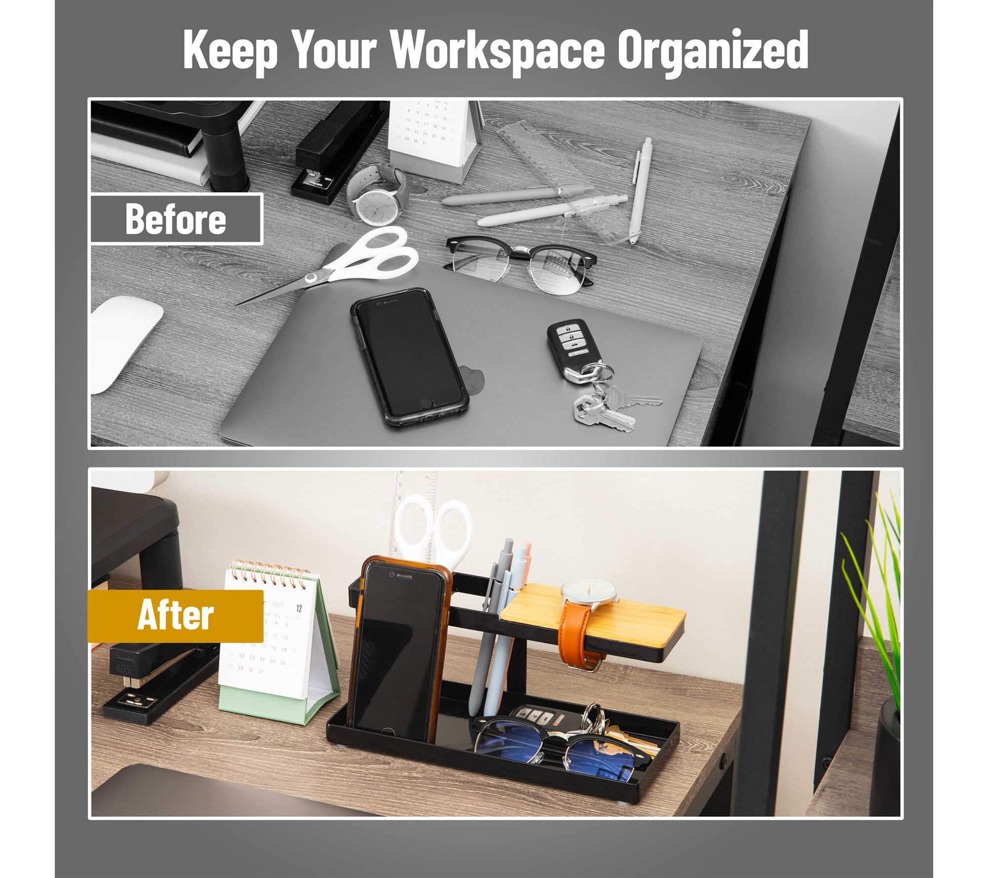 • All-in-one storage for phones, pens, glasses, keys, wallet, and watch