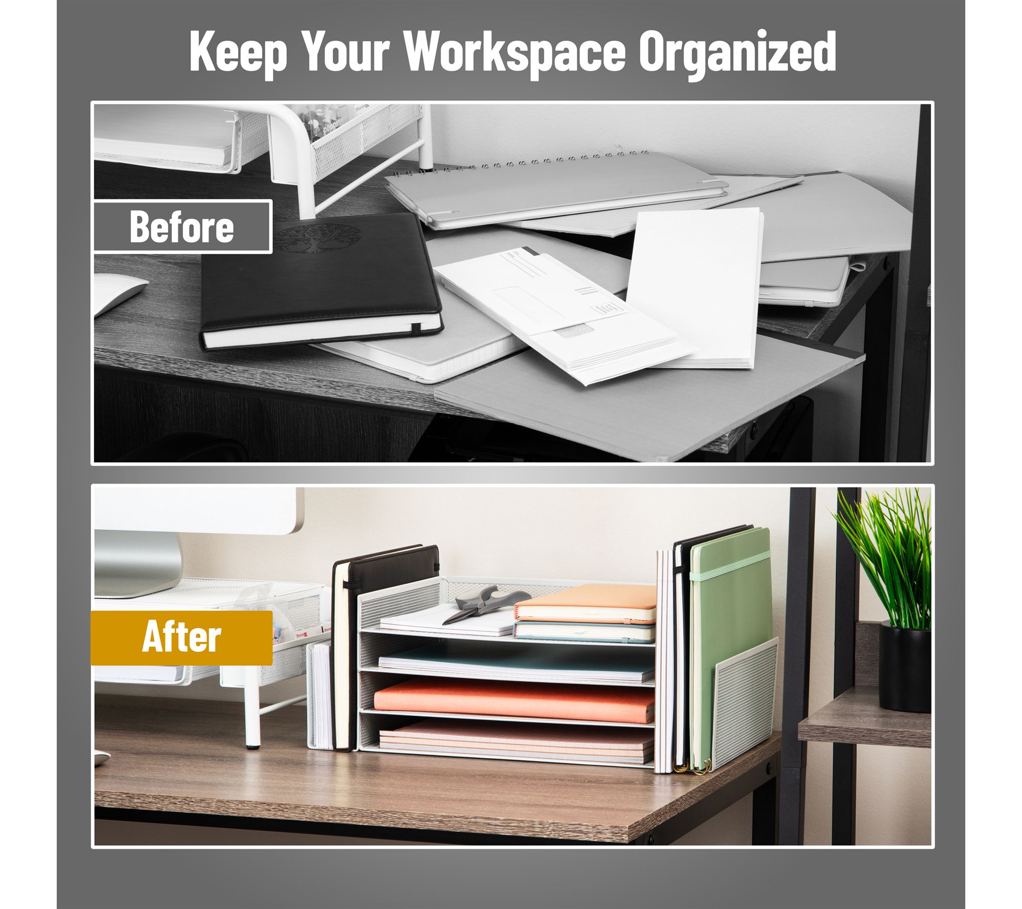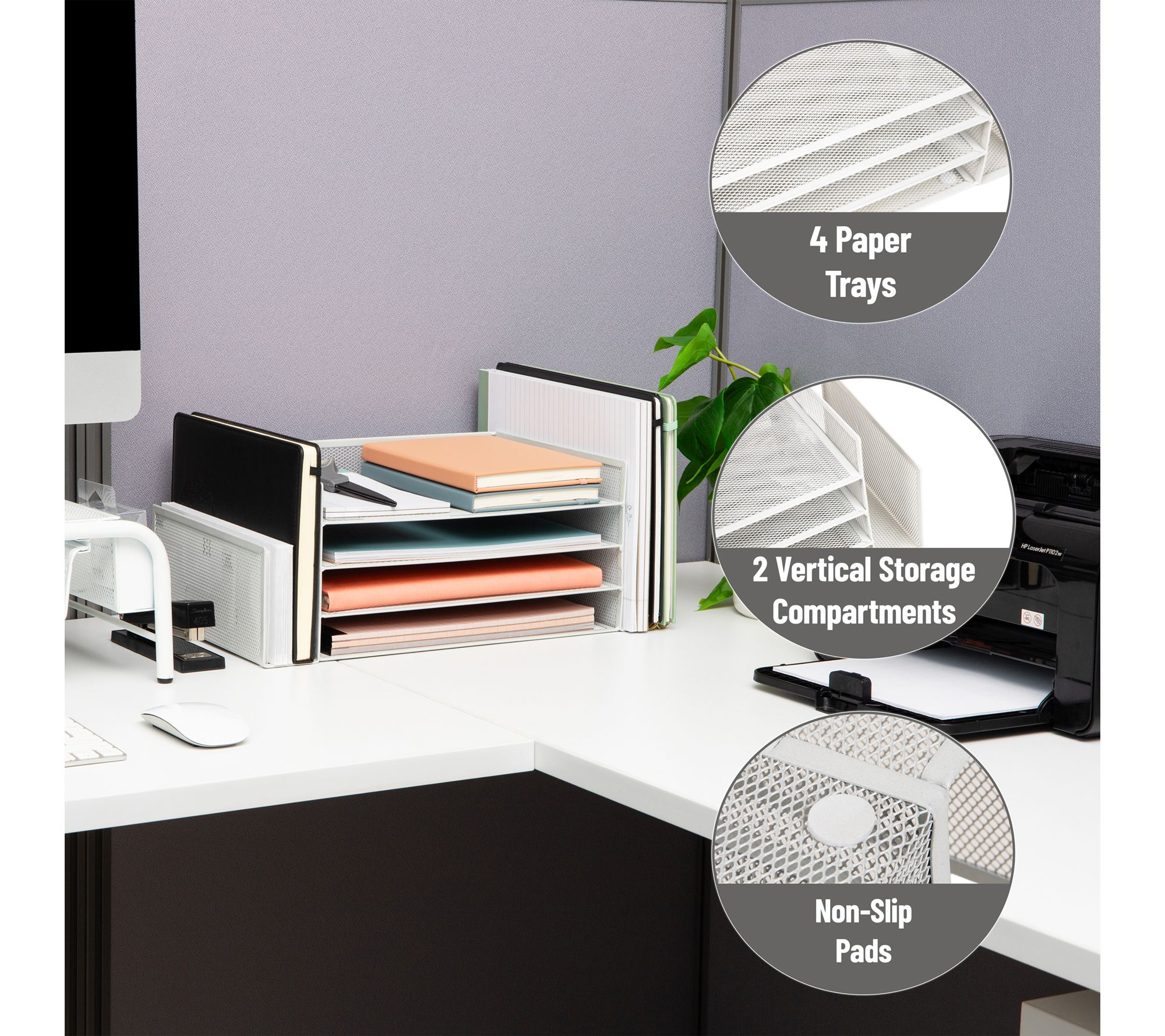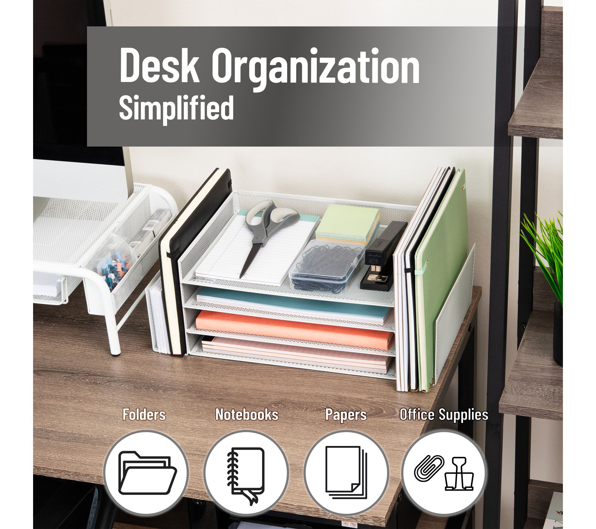 Organization becomes second nature with this desktop organizer, offering six handy compartments -- including four deep shelves for files and two vertical slots for upright items. Whether tackling paperwork at home or in the office, its durable mesh design and large capacity keep important documents at your fingertips while freeing up valuable workspace. From Mind Reader.
