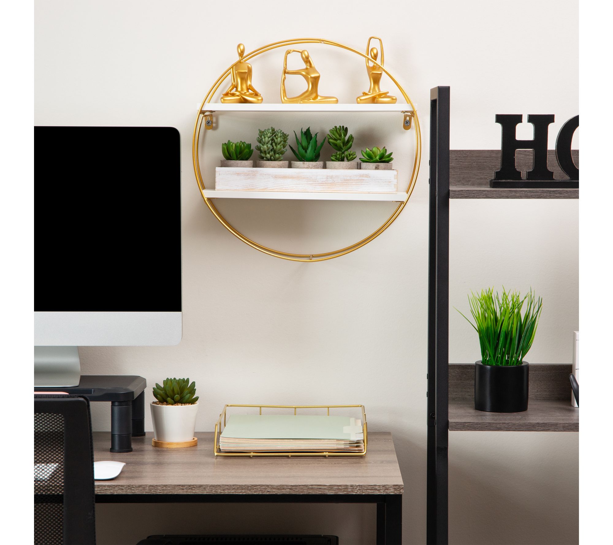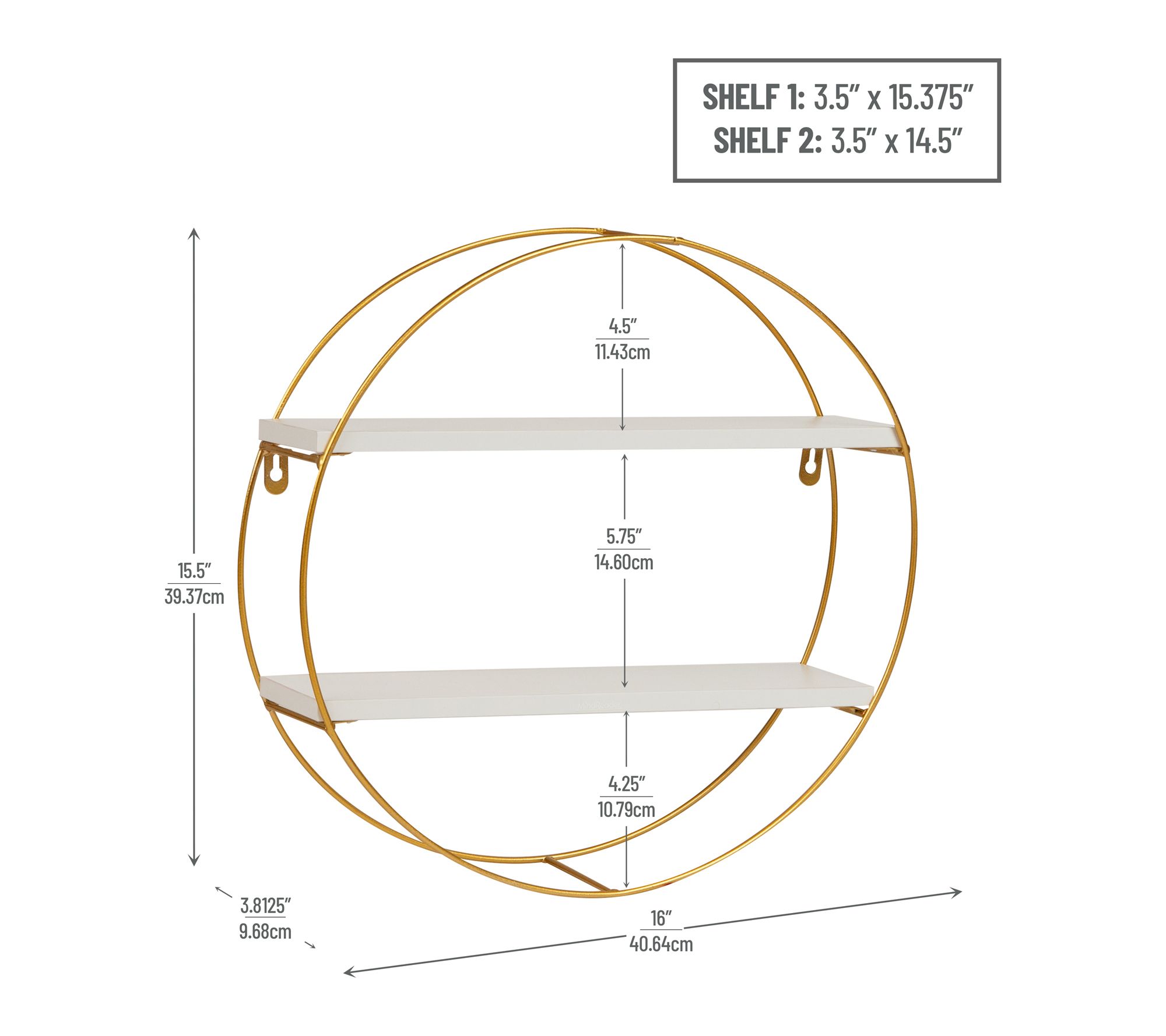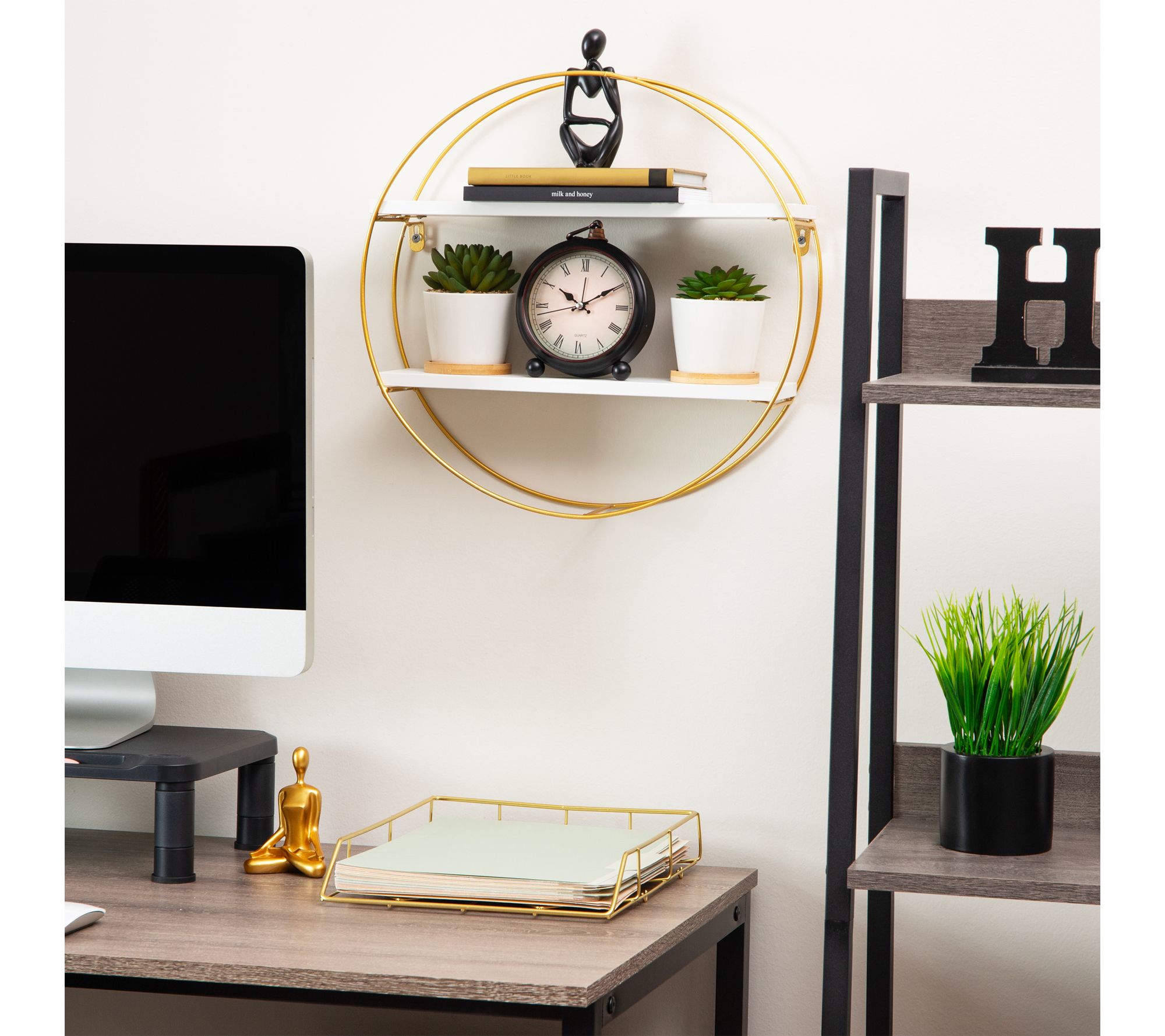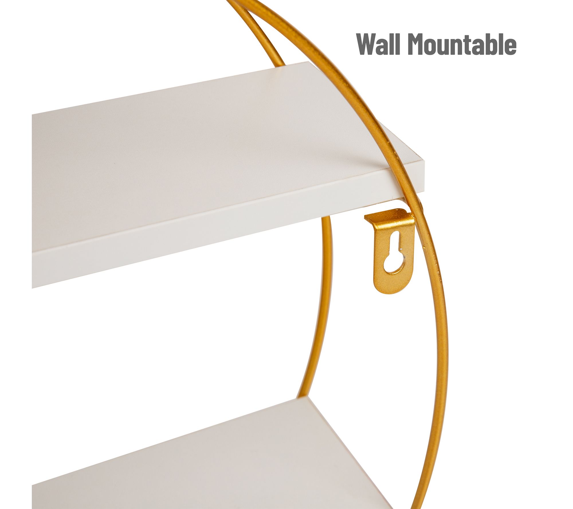 Stylish round wall shelf with goldtone metal frame and two white display shelves