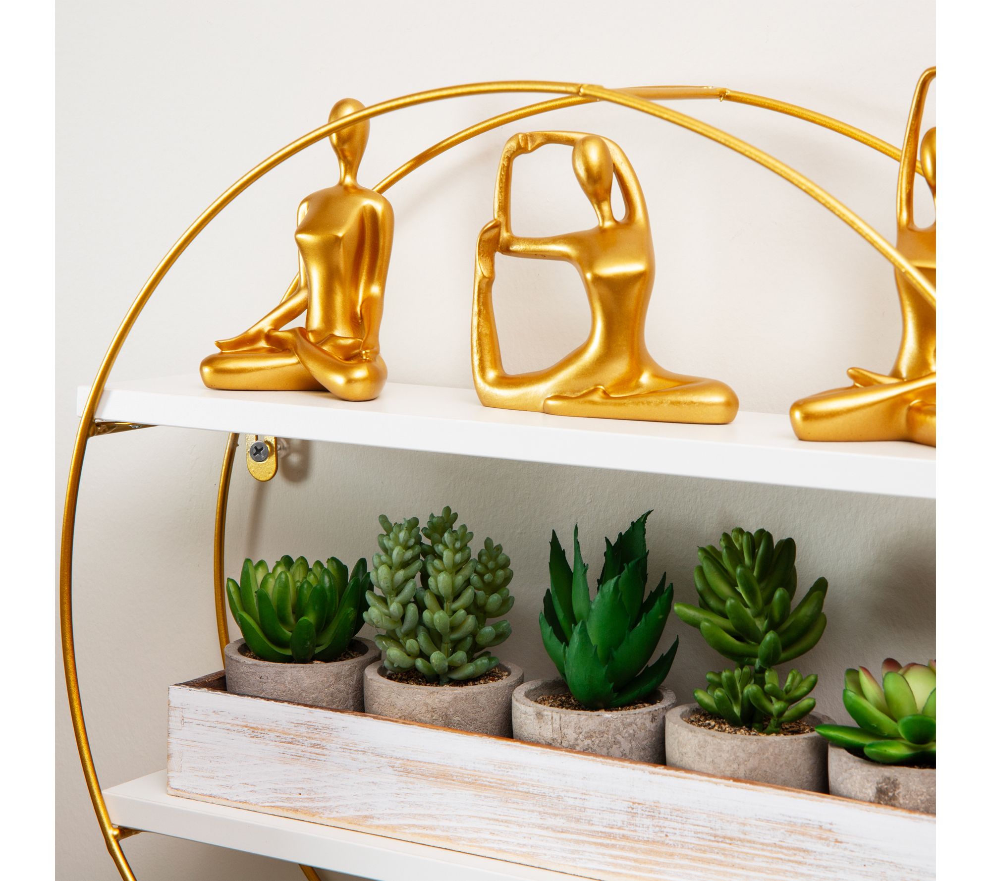Bring modern style and organization to your space with these floating round wall shelves, accented by a gleaming goldtone metal frame and crisp white shelves. Whether you display cherished photos, favorite plants, or decorative accessories, this wall storage solution offers a striking way to keep essentials tidy in your office, entryway, or bathroom. From Mind Reader.