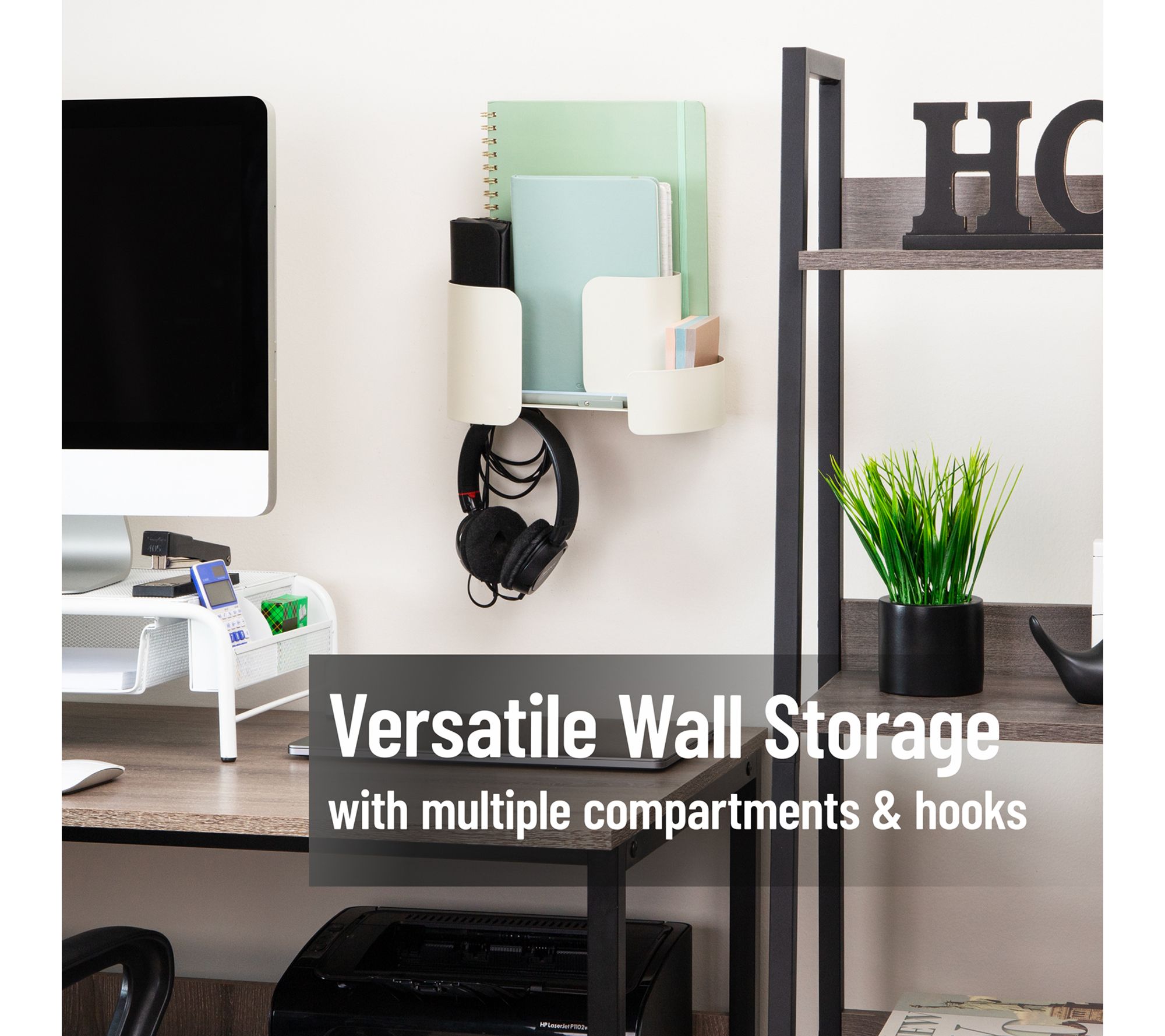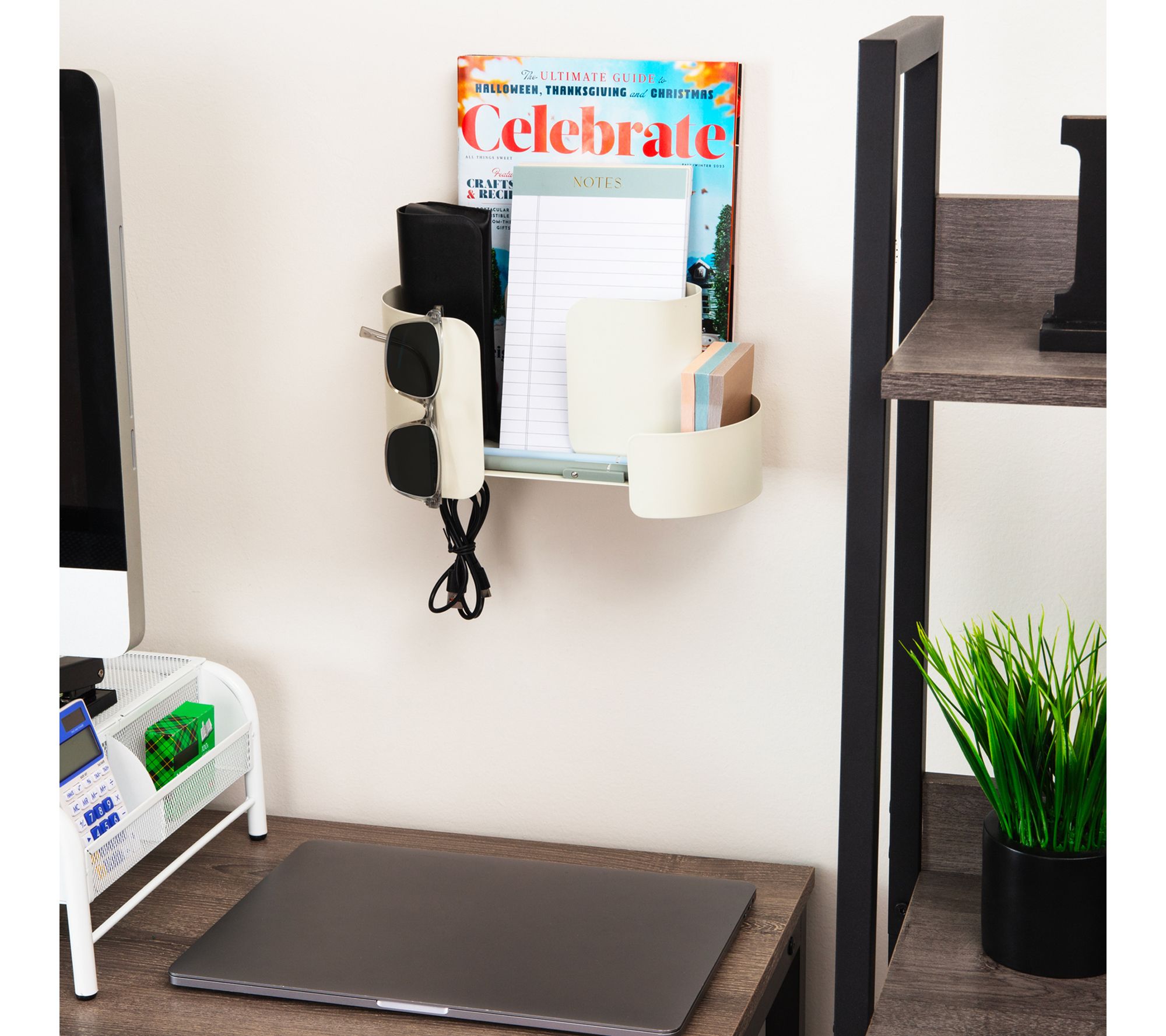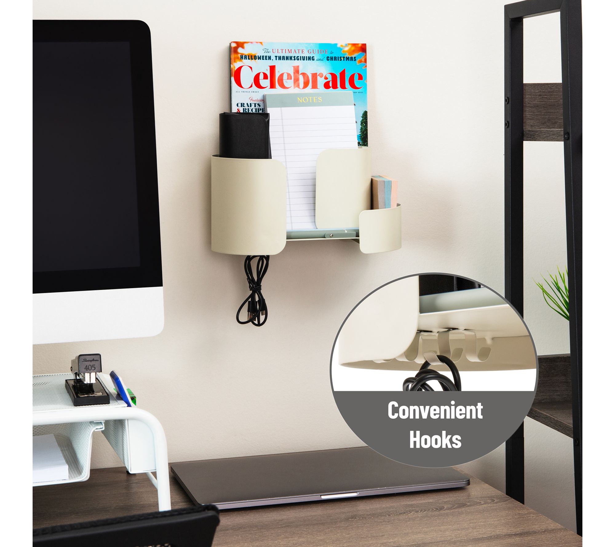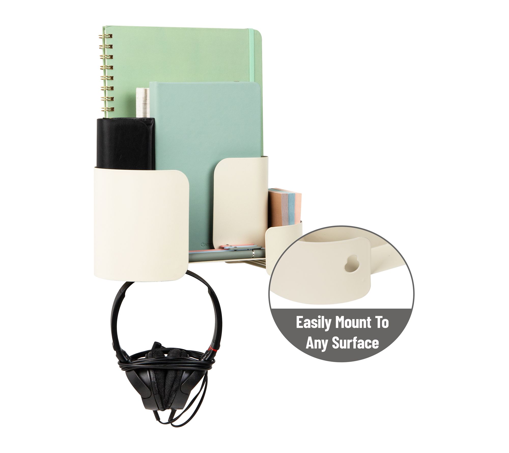 No more digging for keys or scrambling for your phone -- this hanging accessory organizer brings clutter-free order right where you need it. Designed for tool-free wall mounting with included adhesive strips, the versatile shelf features divided compartments and hooks for everything from makeup brushes to office supplies. Its neutral tone and compact form fit seamlessly into dorms, bathrooms, kitchens, and bedrooms. From Mind Reader.