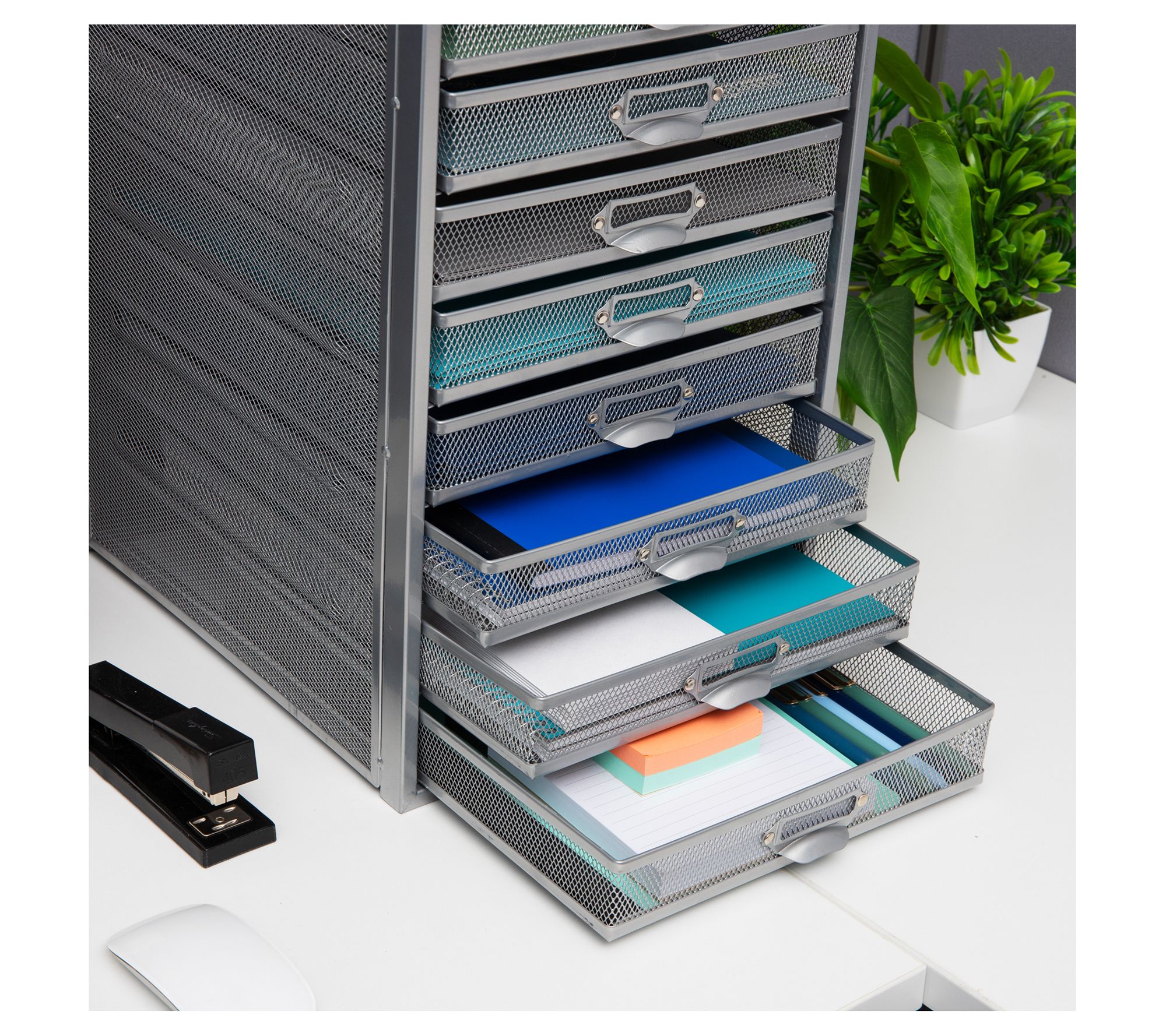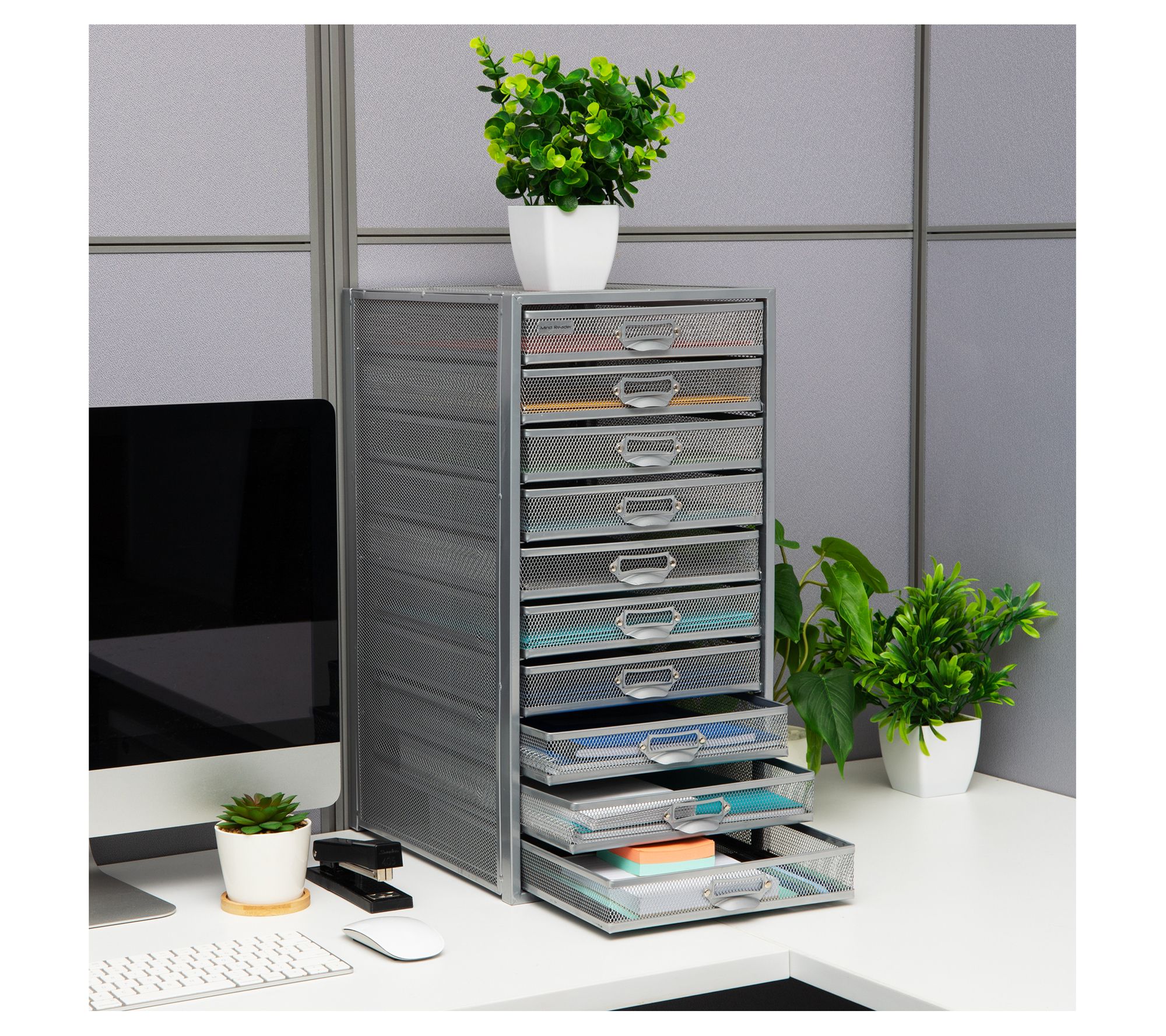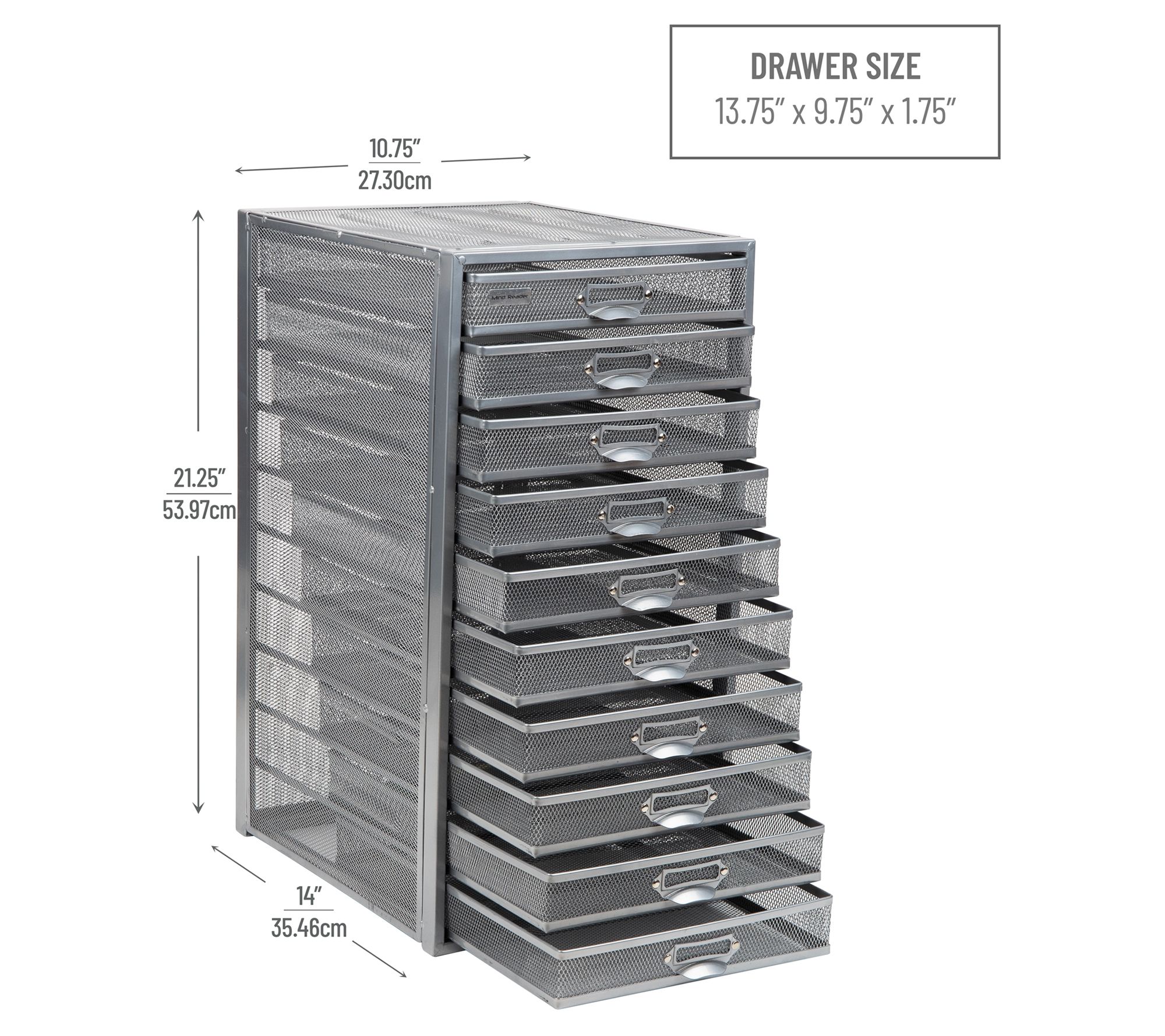 Transform your workspace into a beacon of organization and efficiency with this 10-drawer metal mesh cabinet. Its sleek design and multi-functional drawers make it an essential addition to any office, kitchen, or craft area, helping you keep your essentials neatly stored and within easy reach. From Mind Reader.