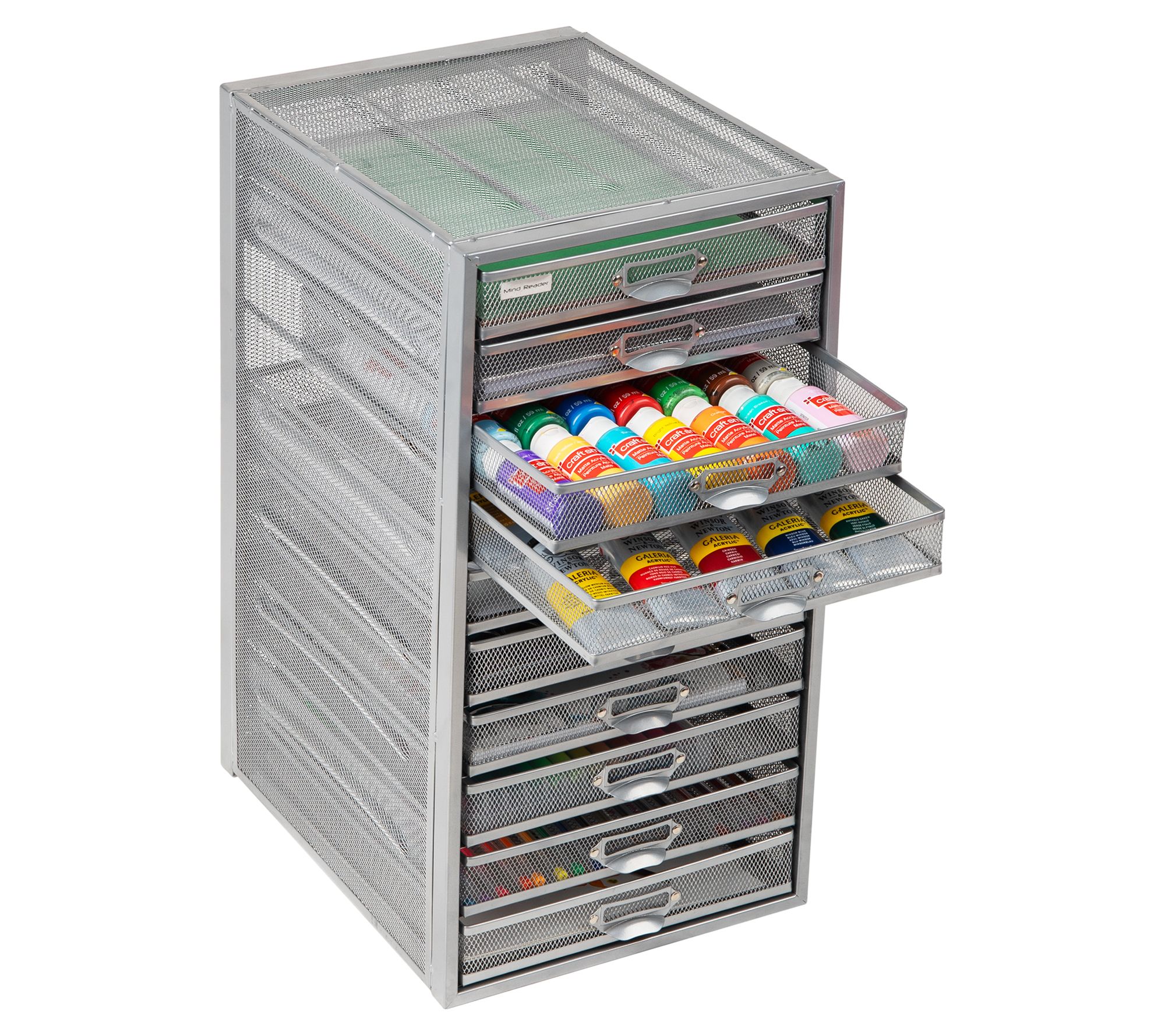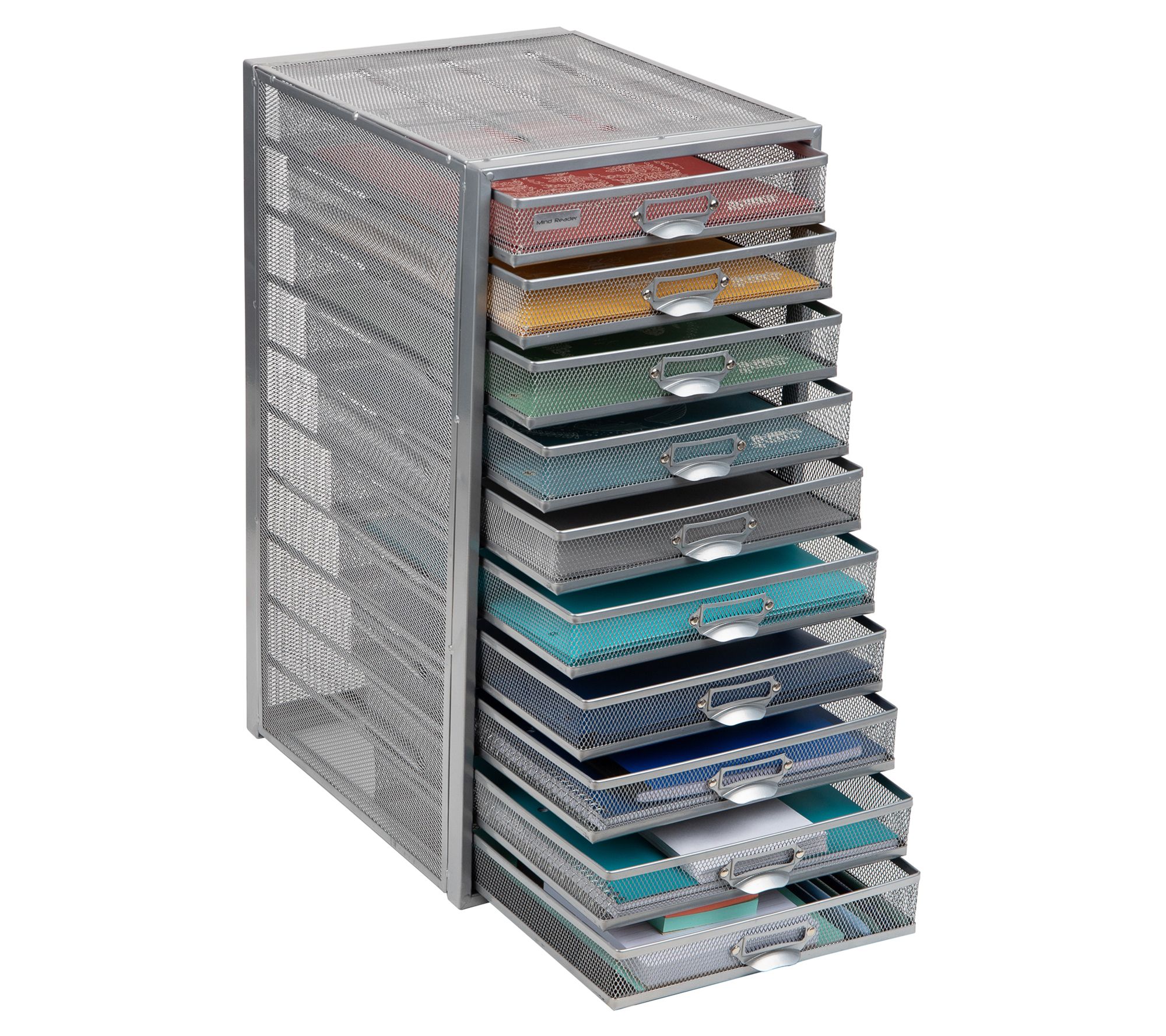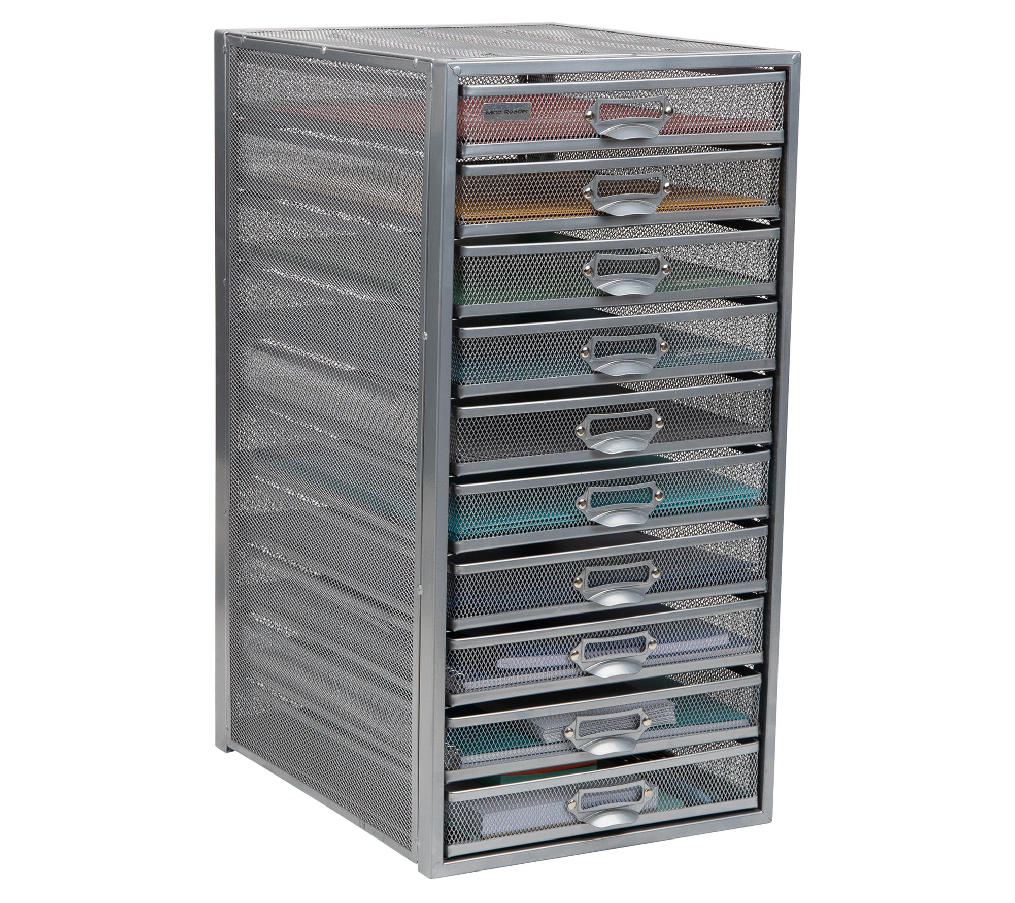 Transform your workspace into a beacon of organization and efficiency with this 10-drawer metal mesh cabinet. Its sleek design and multi-functional drawers make it an essential addition to any office, kitchen, or craft area, helping you keep your essentials neatly stored and within easy reach. From Mind Reader.