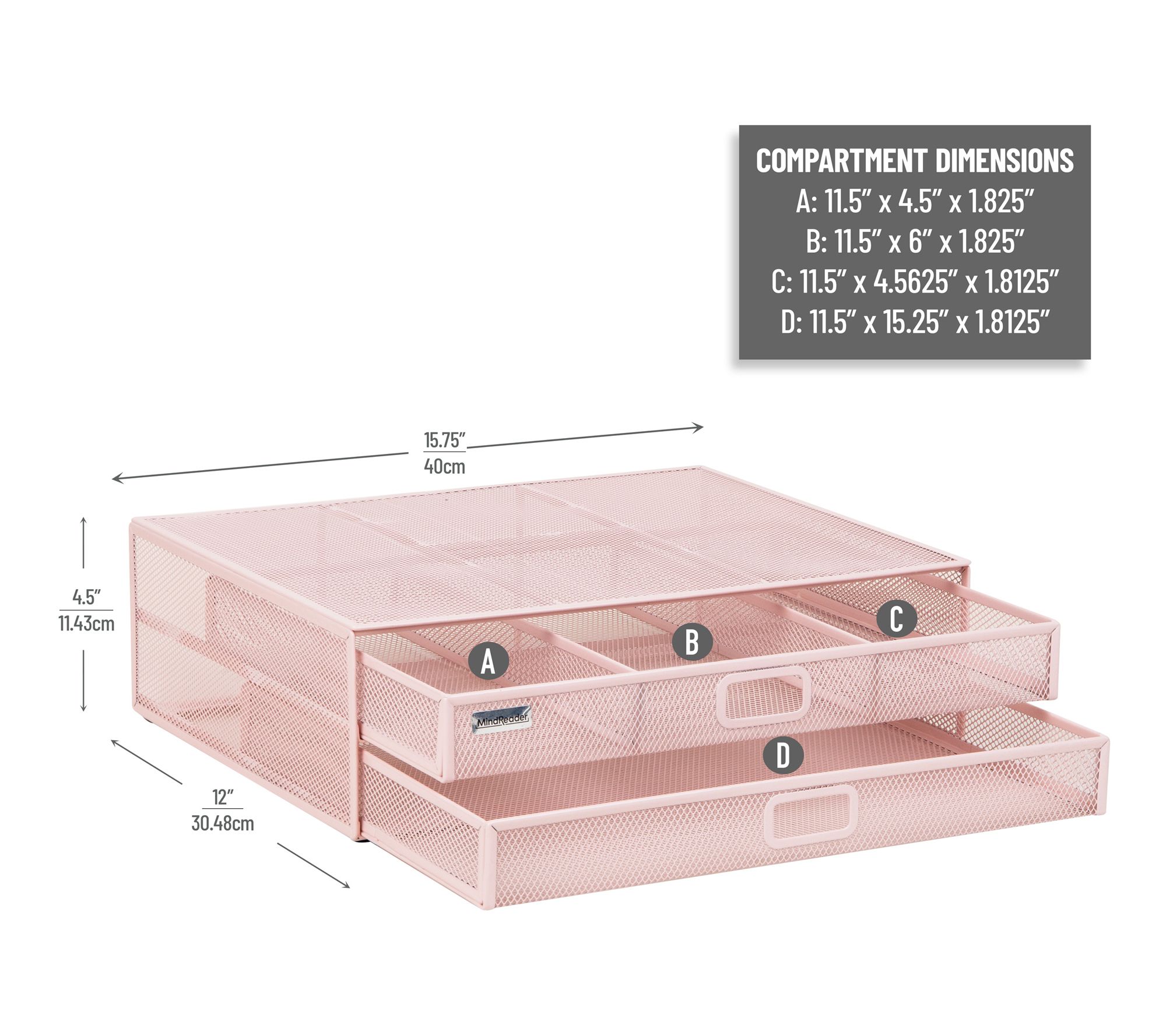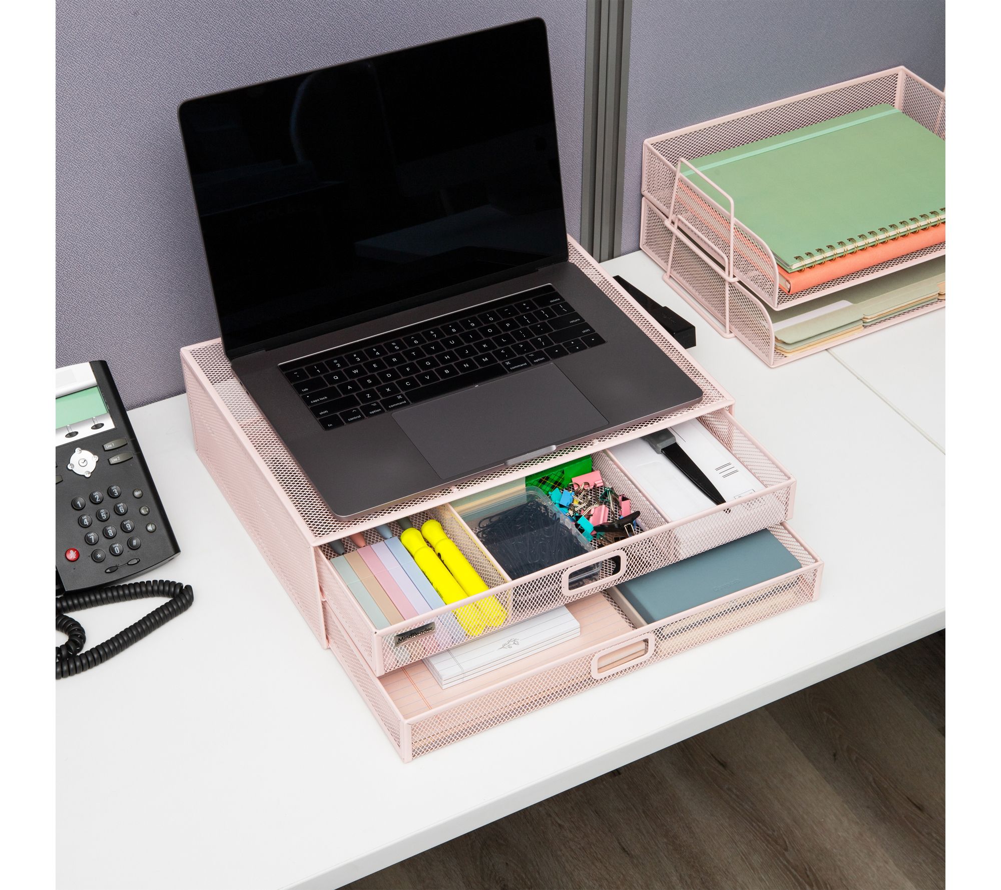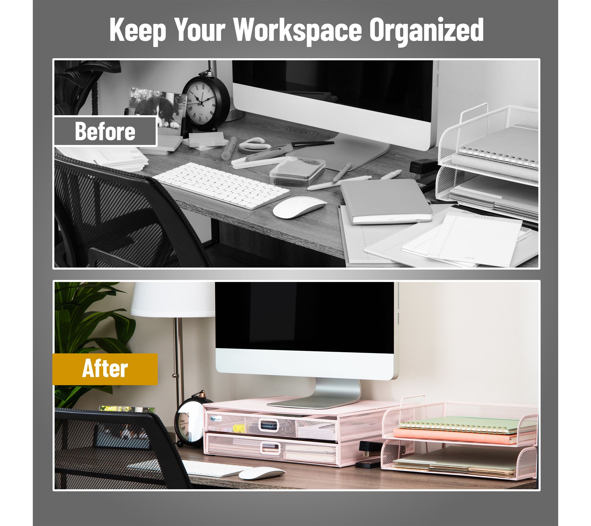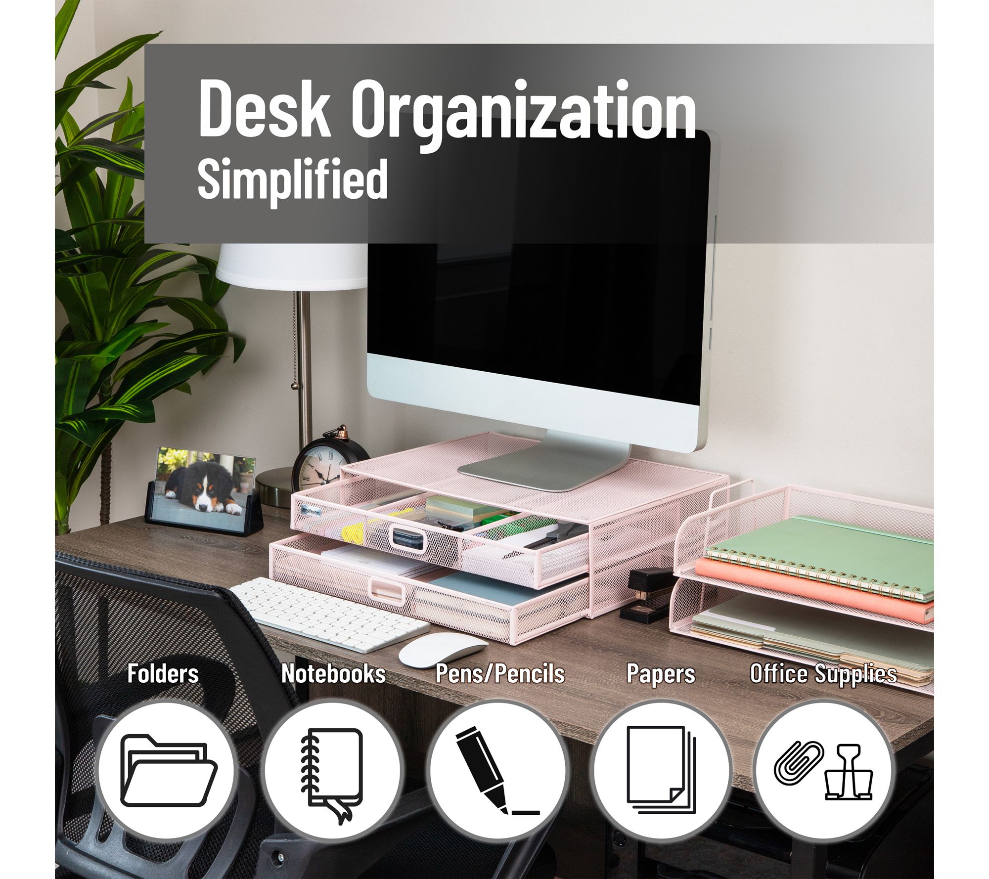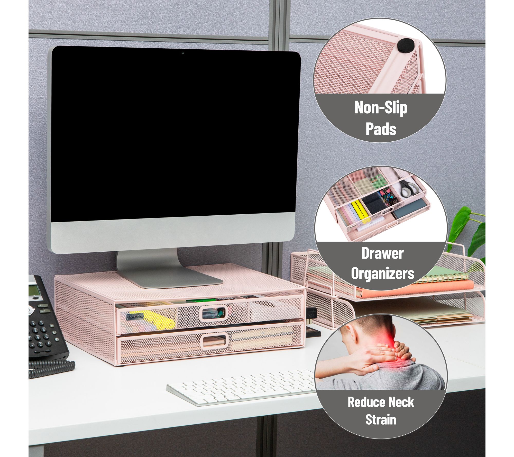 Elevate your desk and streamline your workflow with this two-tier mesh monitor stand and organizer. The sturdy metal construction supports your monitor or laptop while keeping everyday essentials neatly arranged in built-in storage drawers. Keep your workspace efficient and stylish, whether you're at home or at the office. From Mind Reader.