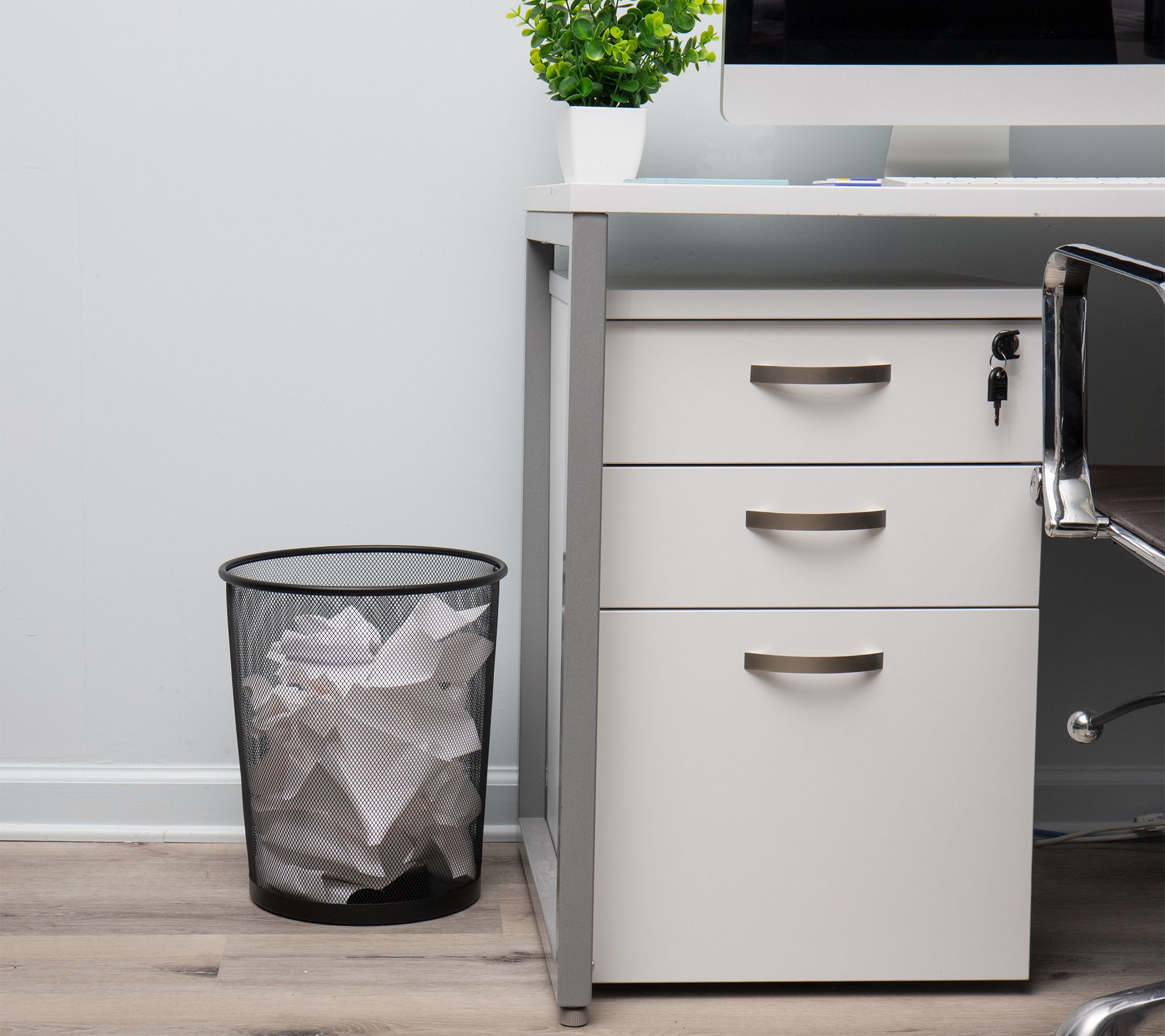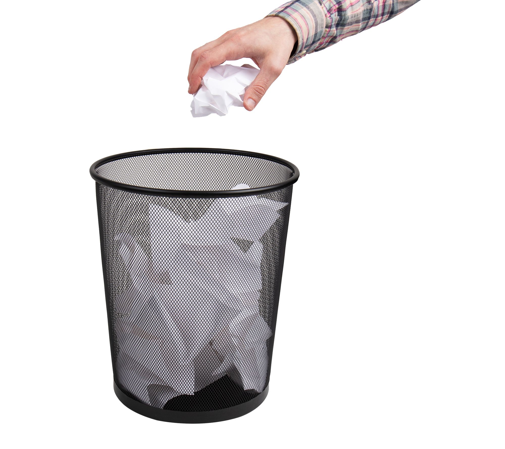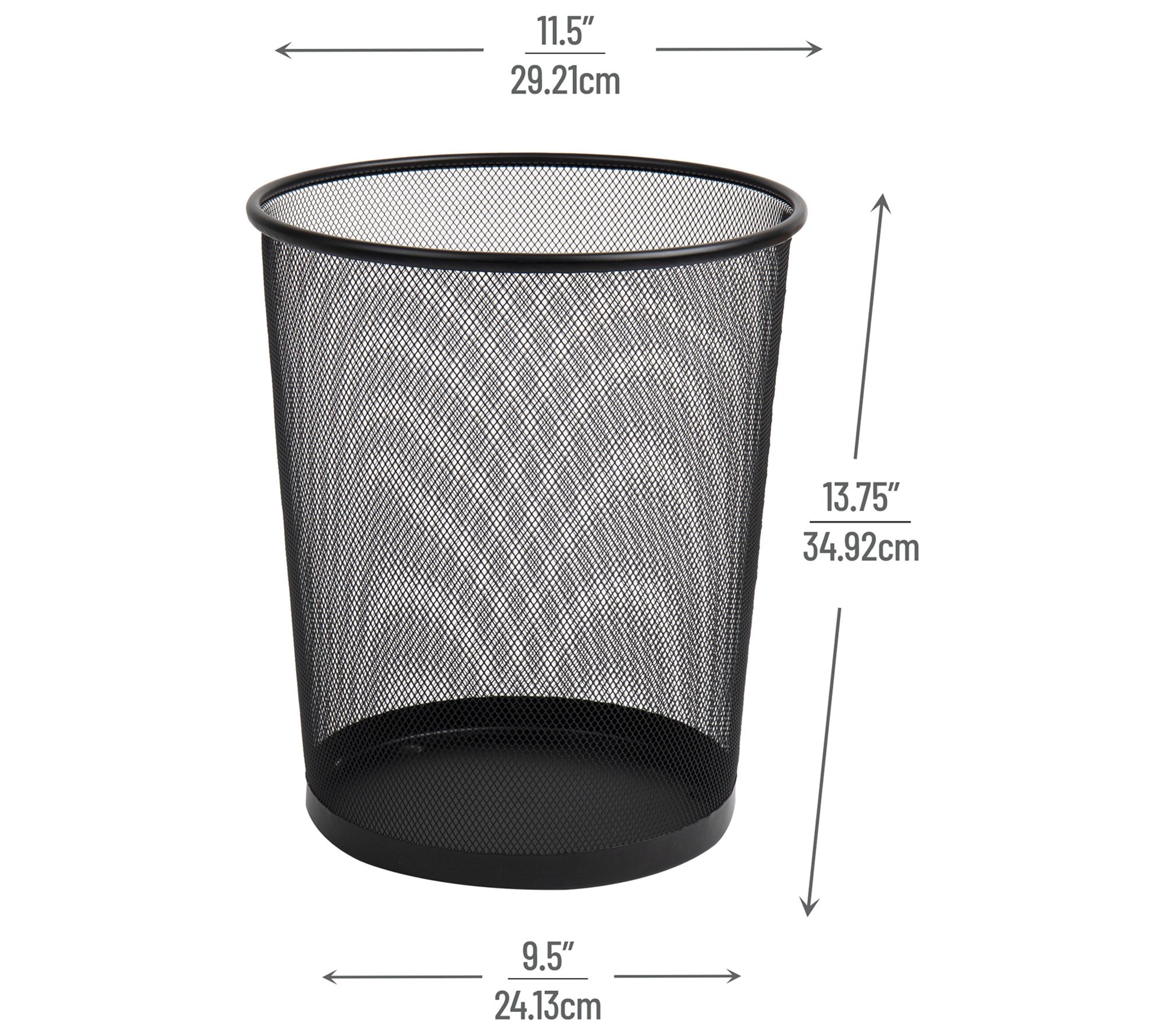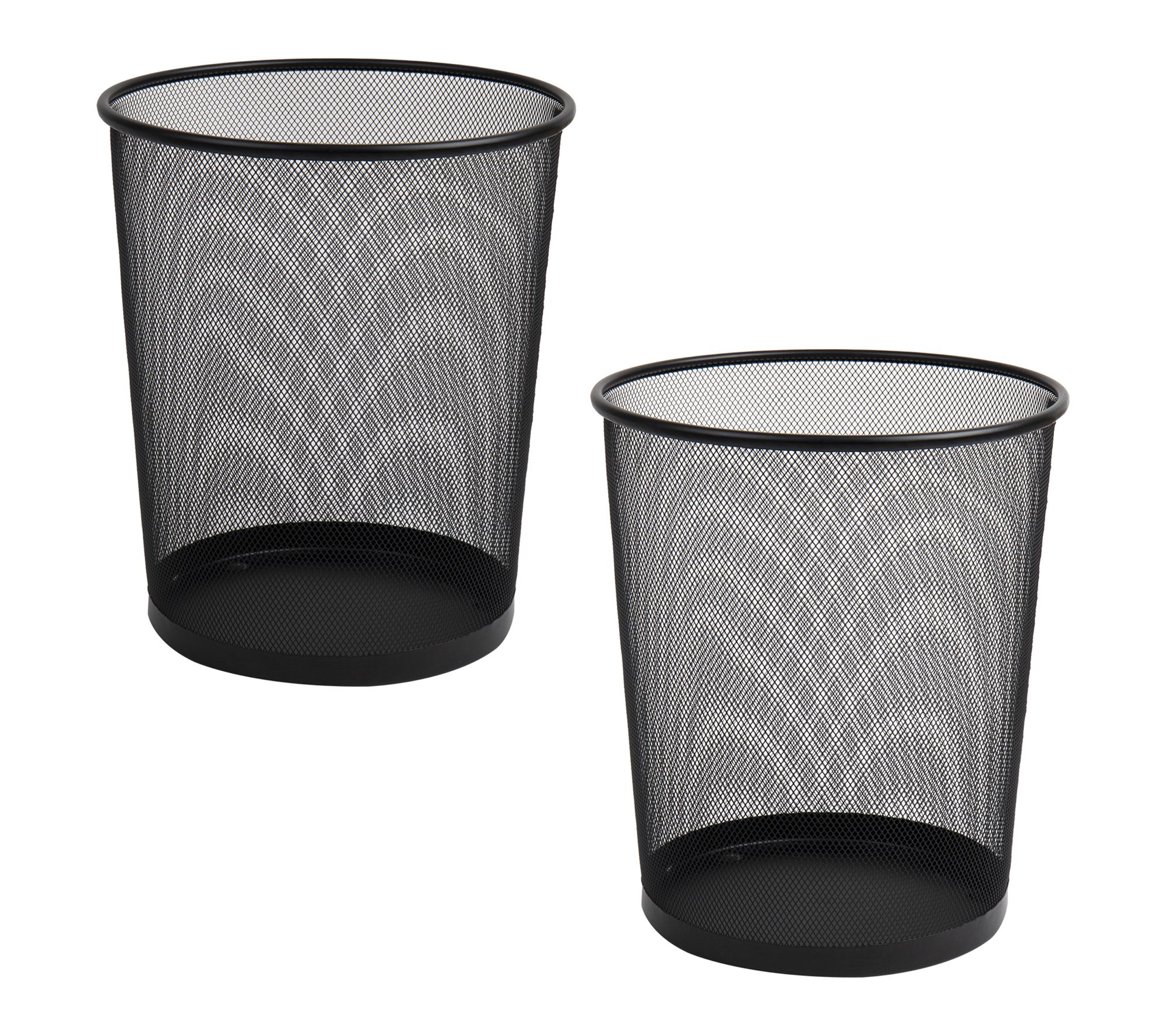Tidy up your workspace, bathroom, or kitchen with this set of two mesh trash cans, designed to make waste disposal effortless and stylish. The ventilated design promotes airflow, which helps minimize odors, while the sturdy metal edge at the bottom contains any small spills. Easily portable, the mesh baskets slide under desks or into cabinets where you need them most. From Mind Reader.