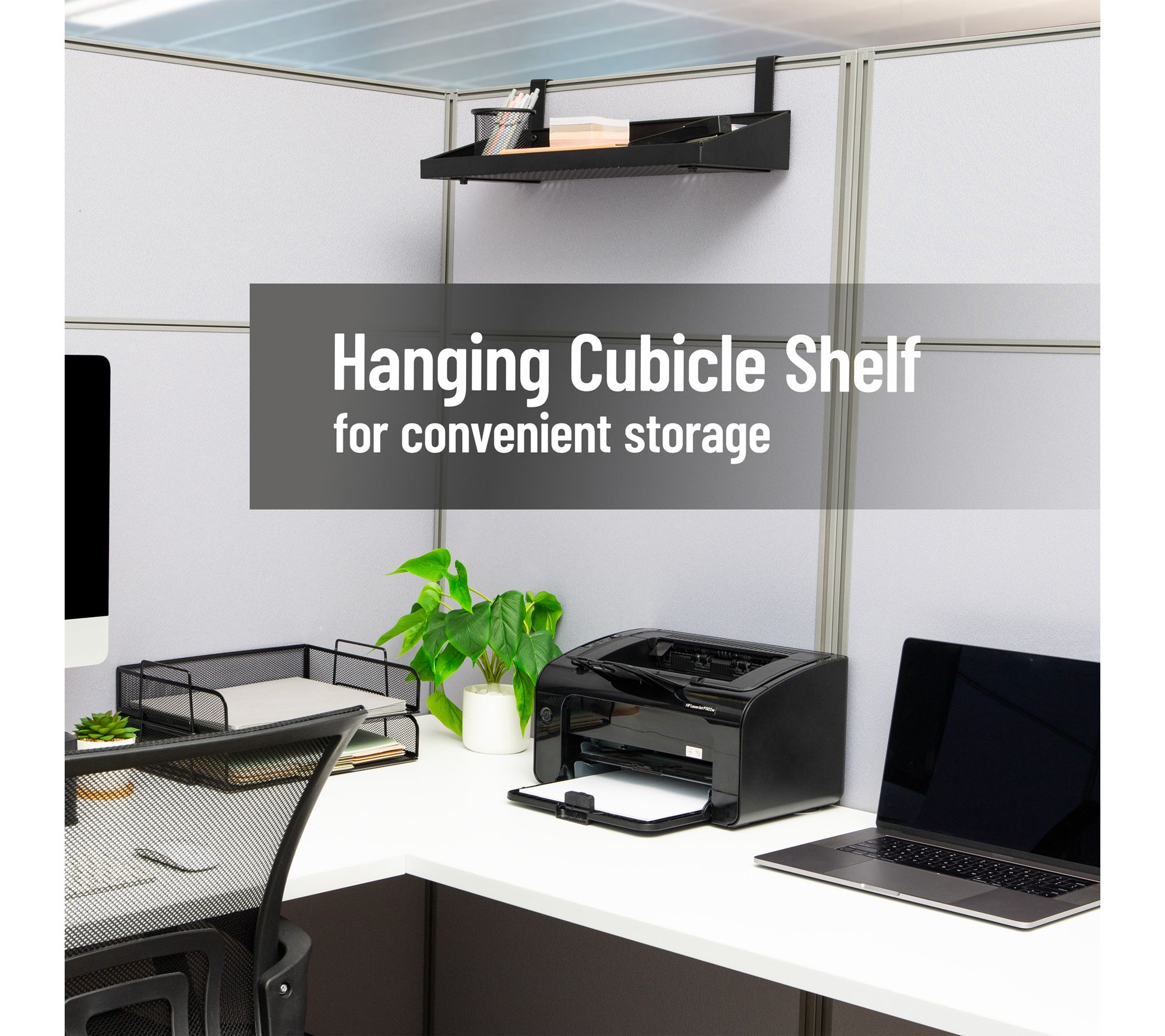 Keep your workspace tidy and efficient with this metal hanging cubicle shelf -- just mount it over your partition to add convenient, space-saving storage without taking up your desk. The sturdy steel frame and open design ensure office supplies, books, or personal items stay organized and within easy reach, whether you're in an office, classroom, or working from home. From Mind Reader.