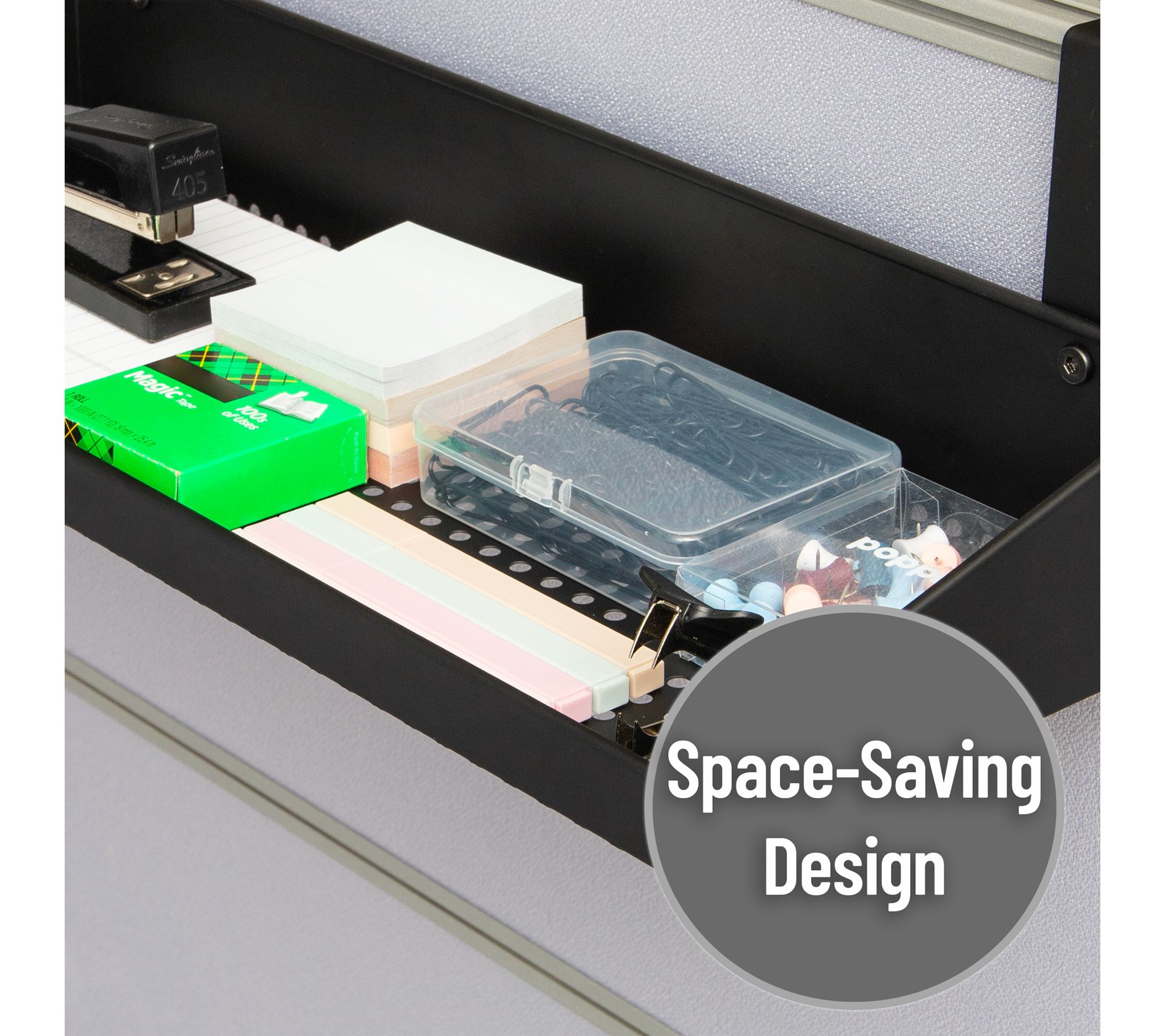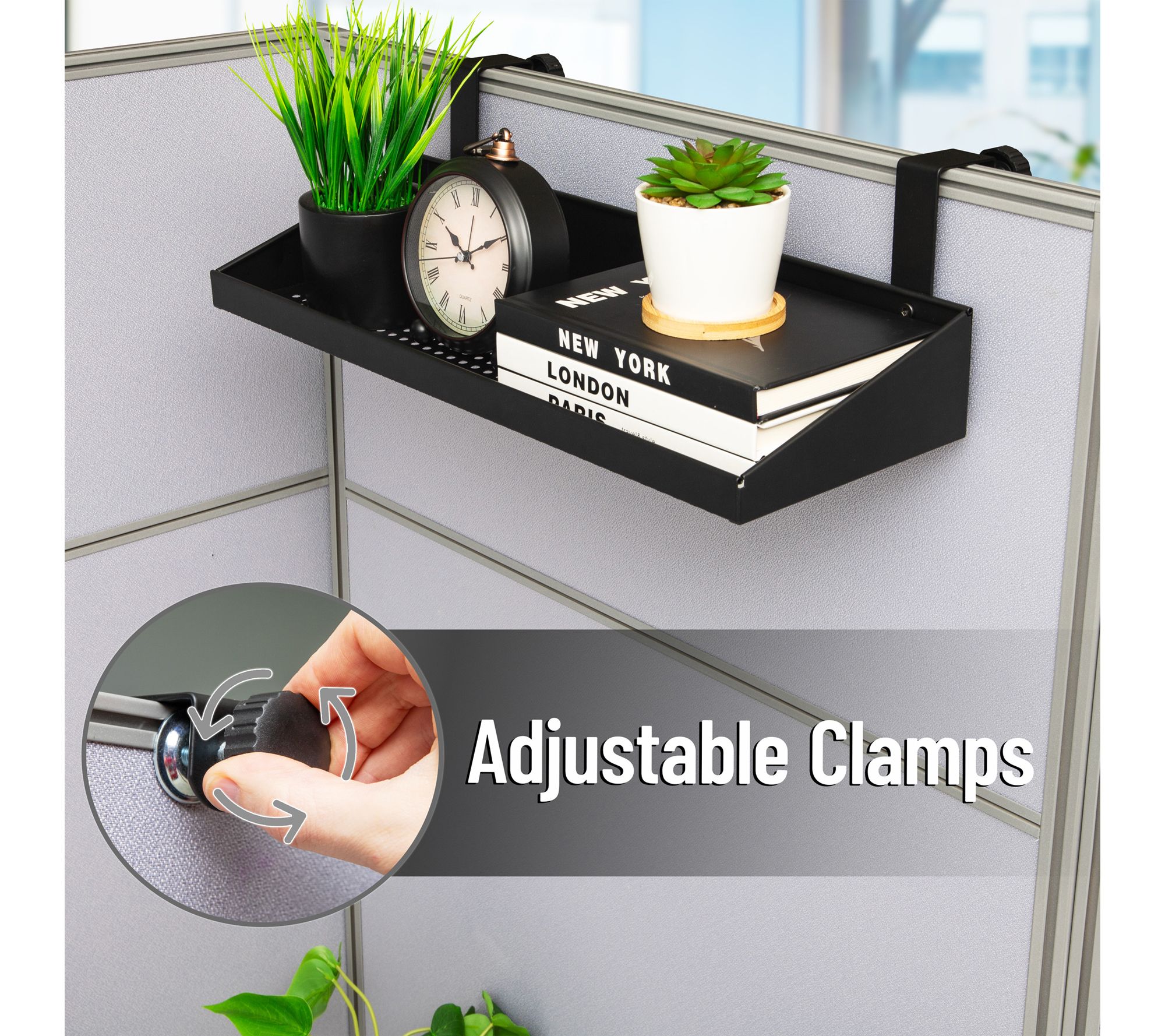 • Space-saving hanging shelf mounts easily over cubicle walls with adjustable clamps -- no tools required