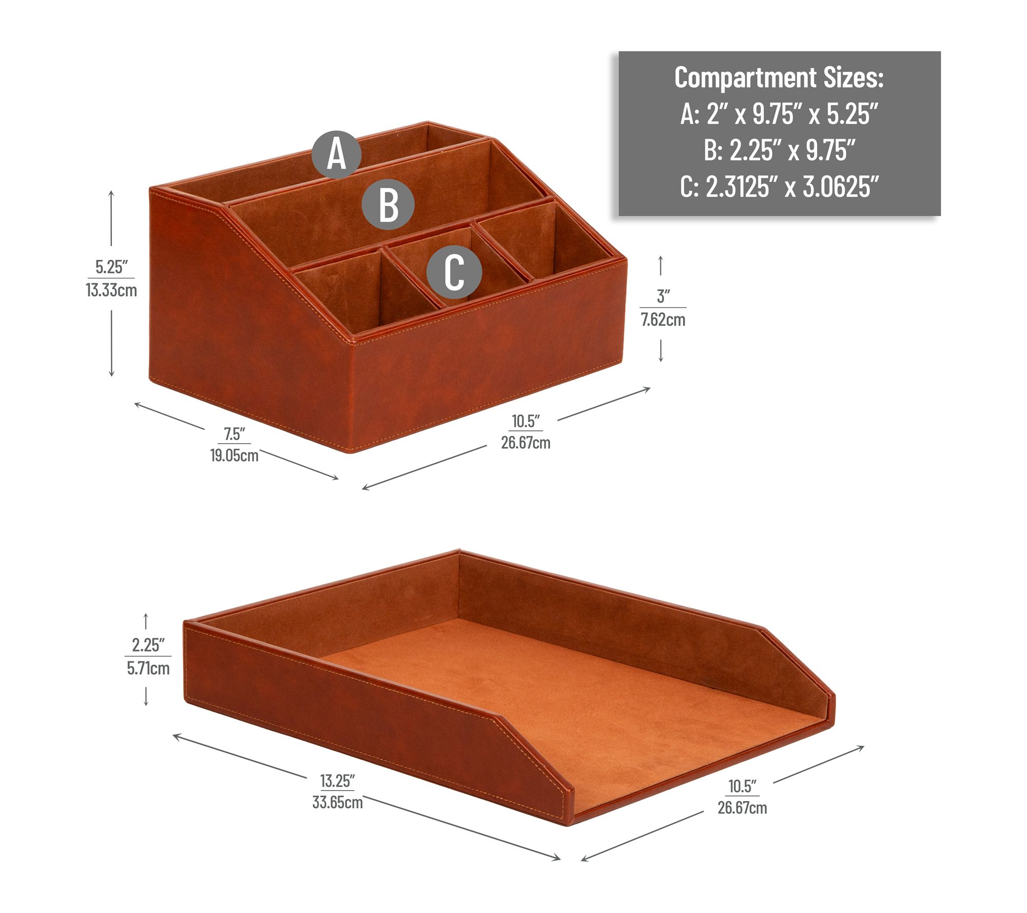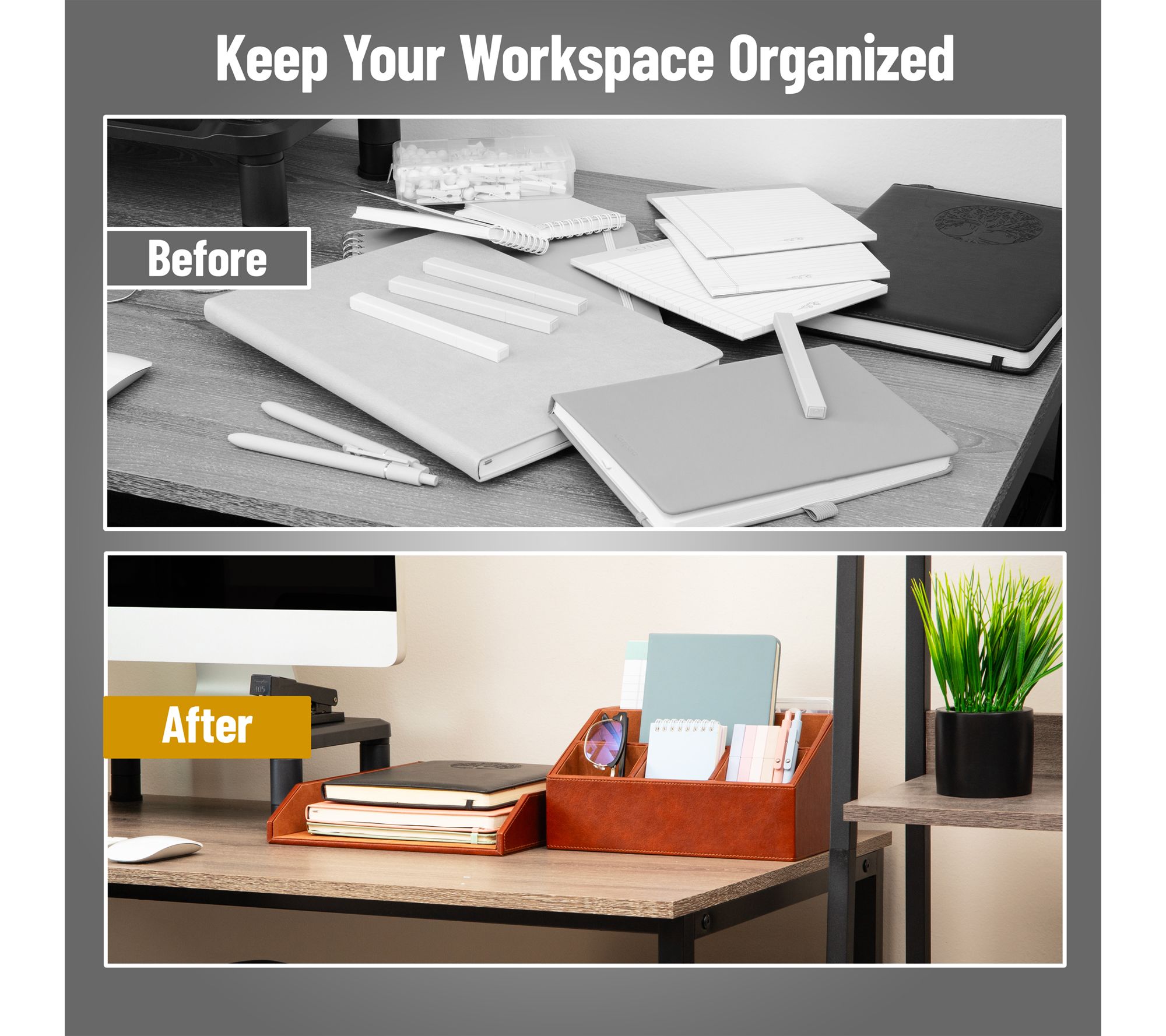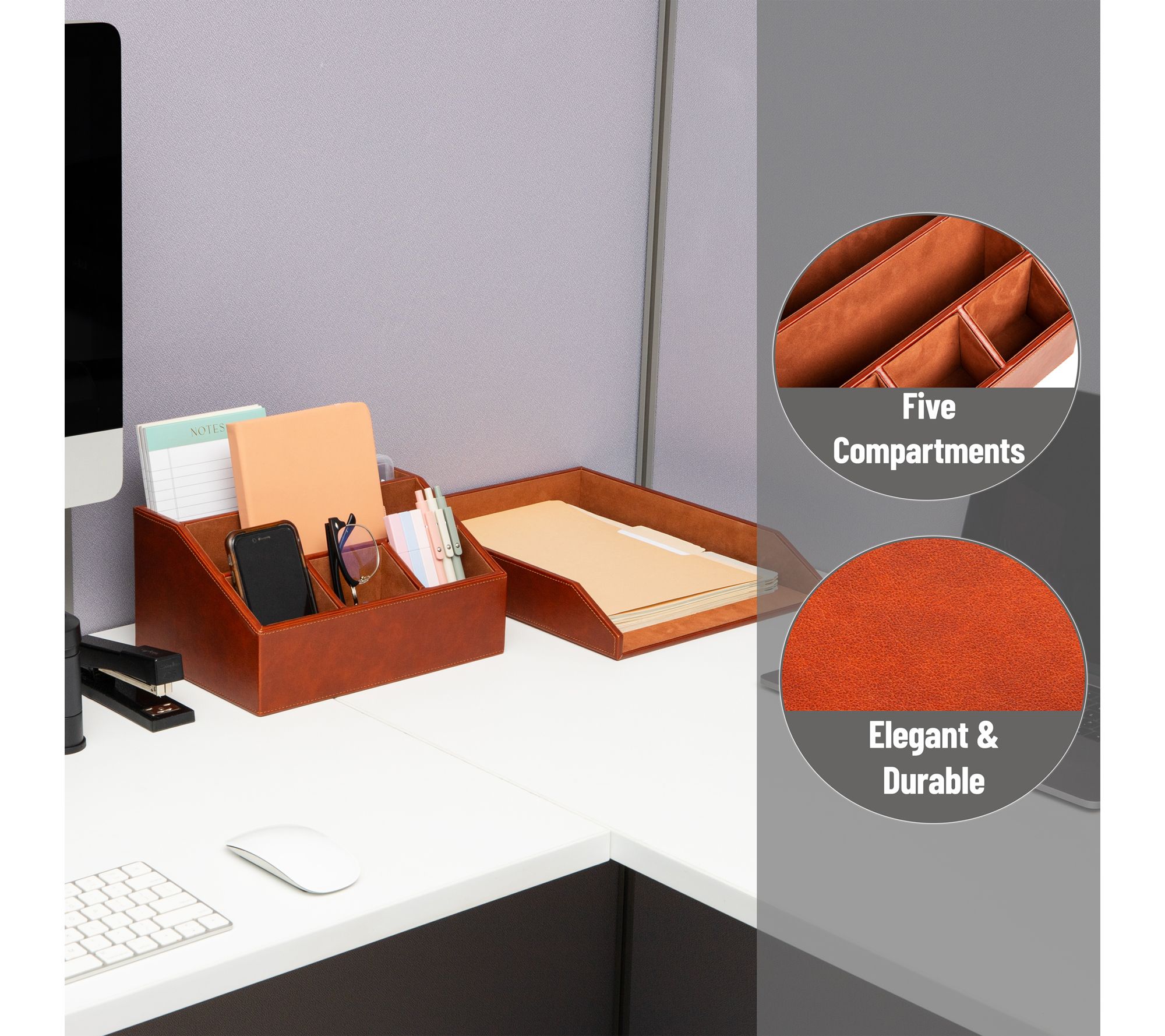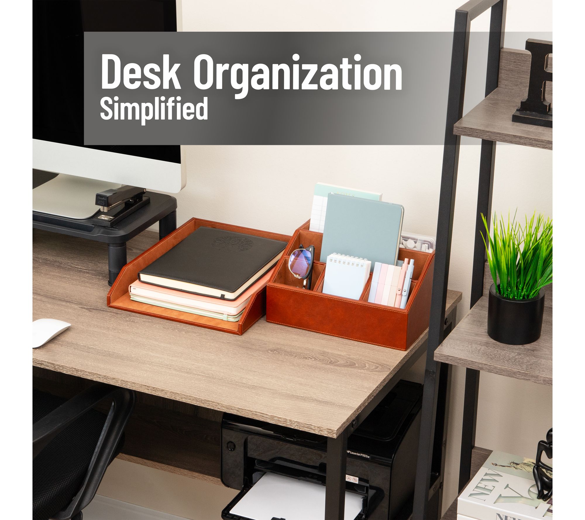 Give your workspace a stylish upgrade with this desk organizer and letter tray set, crafted from brown PU leather for a polished, unified look. Store pens, cards, and notebooks in dedicated compartments, while the matching tray stacks your mail and loose papers neatly within reach. Great for home offices or shared workspaces, it helps minimize clutter and elevate your daily routine. From Mind Reader.