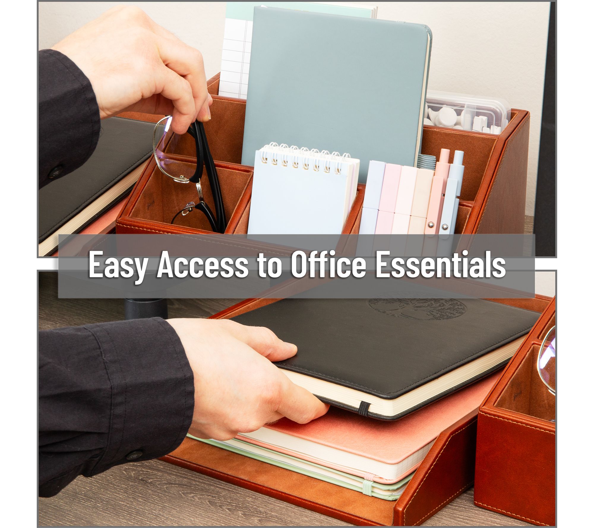 • Multi-compartment organizer for pens, cards, notebooks, and planners