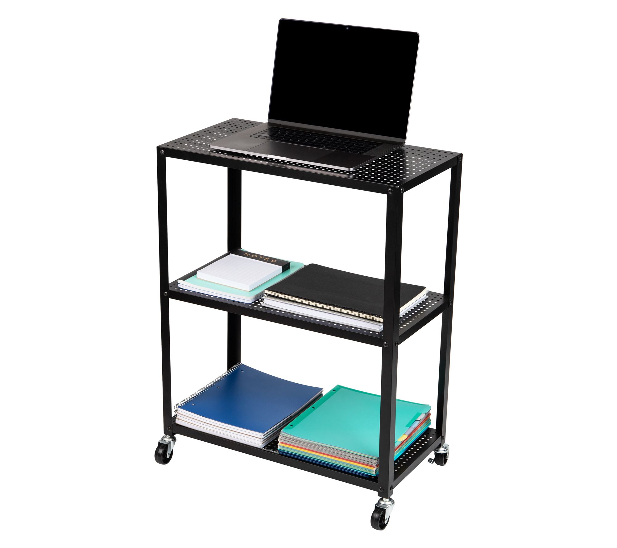 From serving up coffee in the kitchen to storing office essentials or barware, this three-tier rolling utility cart keeps everything organized and within reach. The perforated metal shelves provide ample ventilated storage, while smooth-gliding wheels make it a breeze to move from room to room. Lock the wheels to create a convenient stationary end table or prep station. From Mind Reader.
