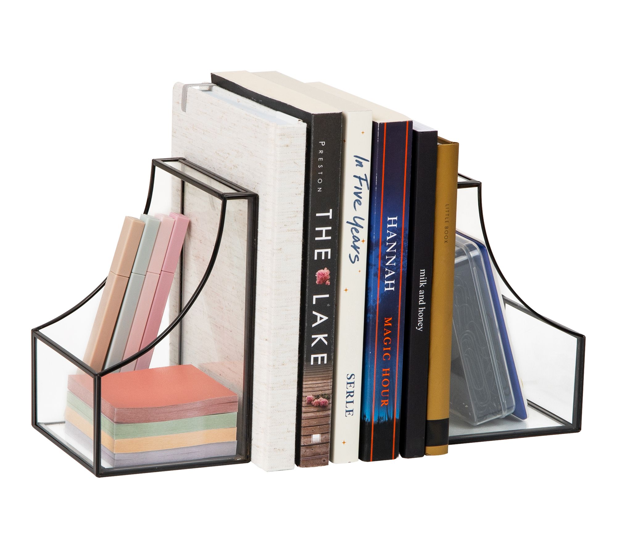 • Modern glass bookends feature black metal trim and built-in storage