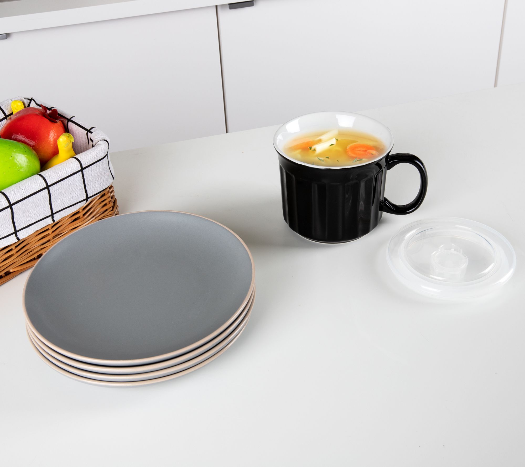 Savor your favorite cup of soup or tea in this delightful stoneware mug that features a vented lid and cool-touch handle for safe carrying. From Mind Reader.