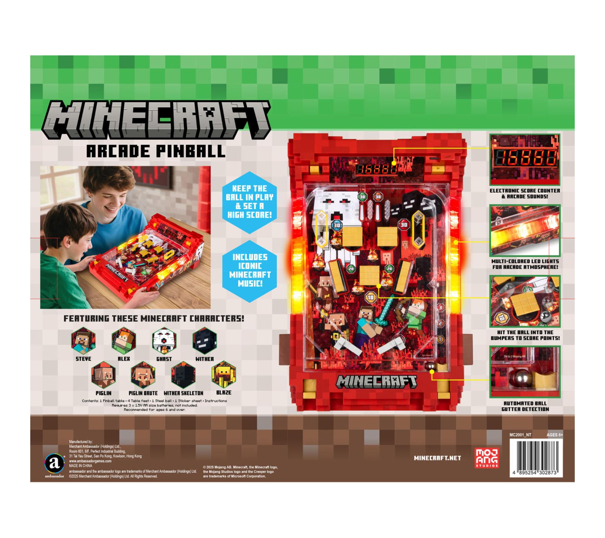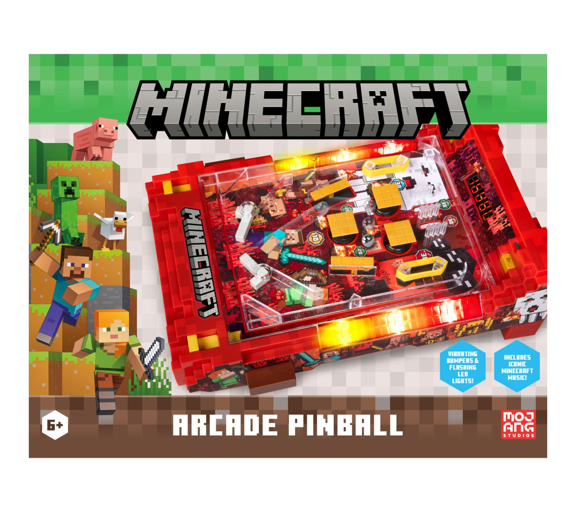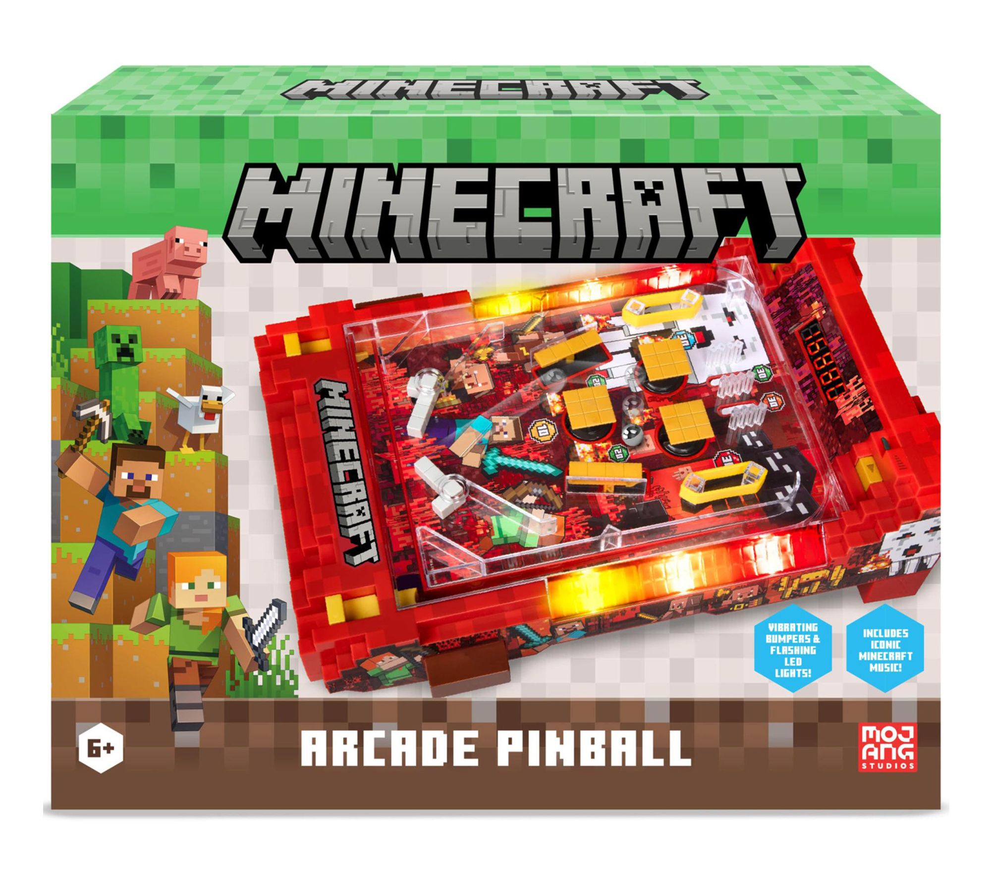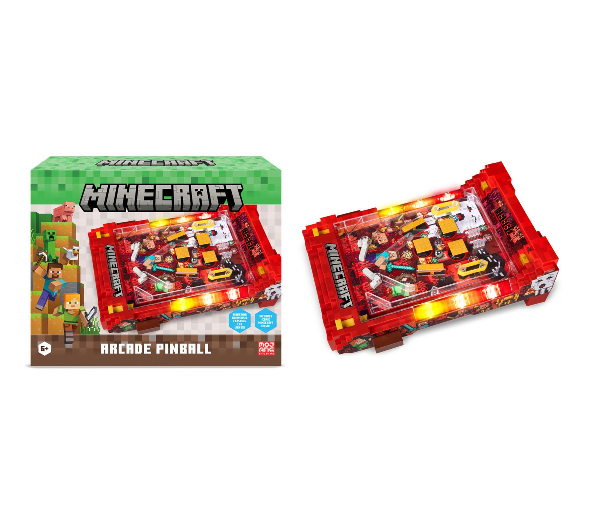 Bring the fast-paced excitement of the arcade to your home with this Minecraft Arcade Pinball Nether tabletop game. Fans will love battling for high scores with vibrant multi-colored LED lights, iconic Minecraft sounds, and interactive bumpers that shake up each turn. Compact yet lively, this arcade-inspired pinball machine is ideal for game nights, bedroom fun, or collectors looking to channel the thrill of the Nether dimension. From Minecraft.