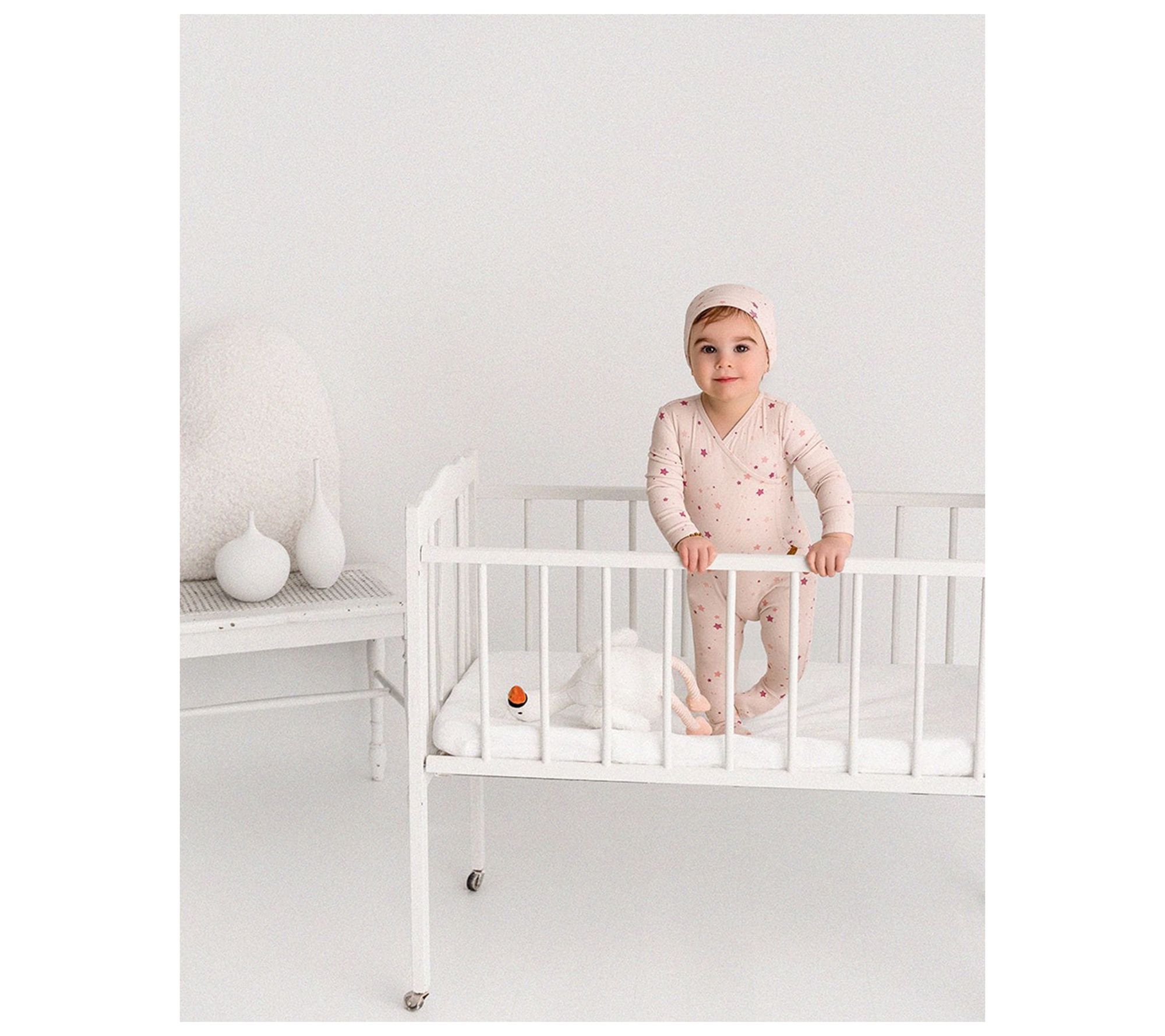 This ribbed star footie set is designed to keep your little one cozy and stylish. Perfect for spring and summer, this footie features a crew neckline, long sleeves, and footed legs, while the matching bonnet adds an adorable touch. From MiniMoi.
