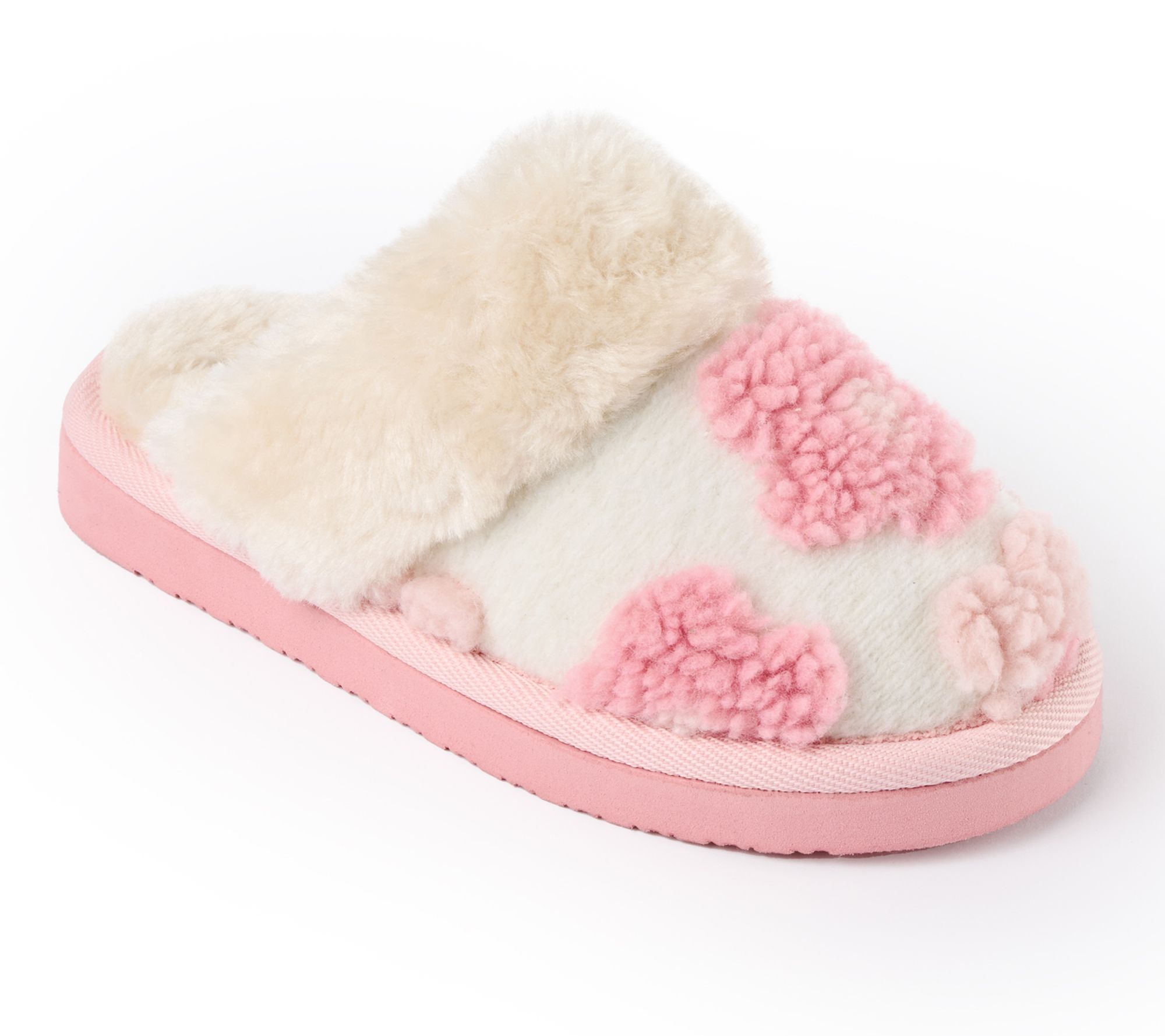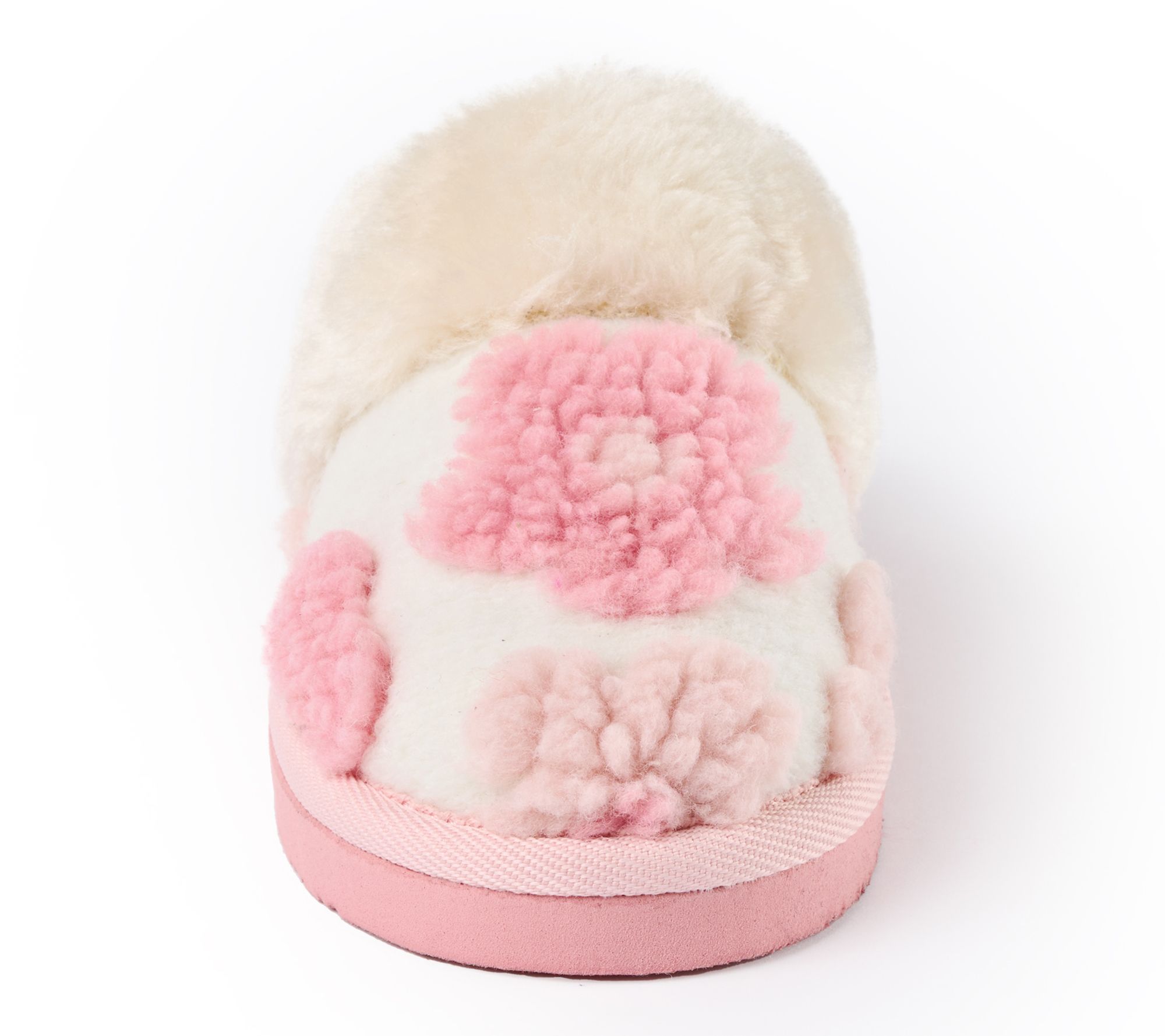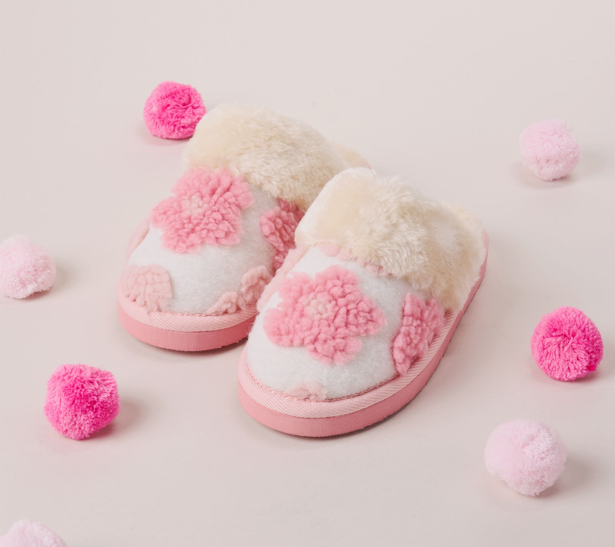 • Slip-on style with rounded toe and fuzzy floral embellishment