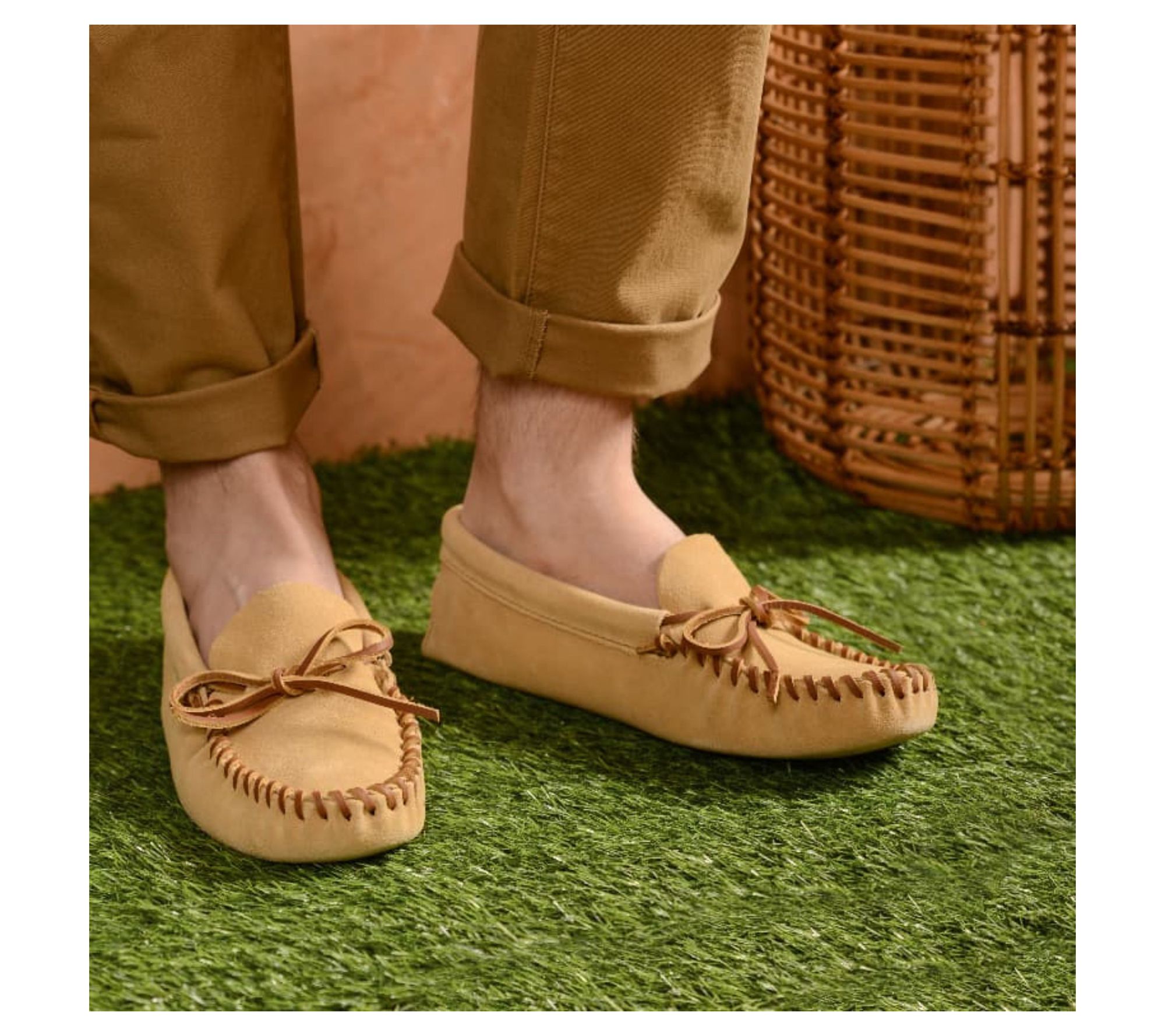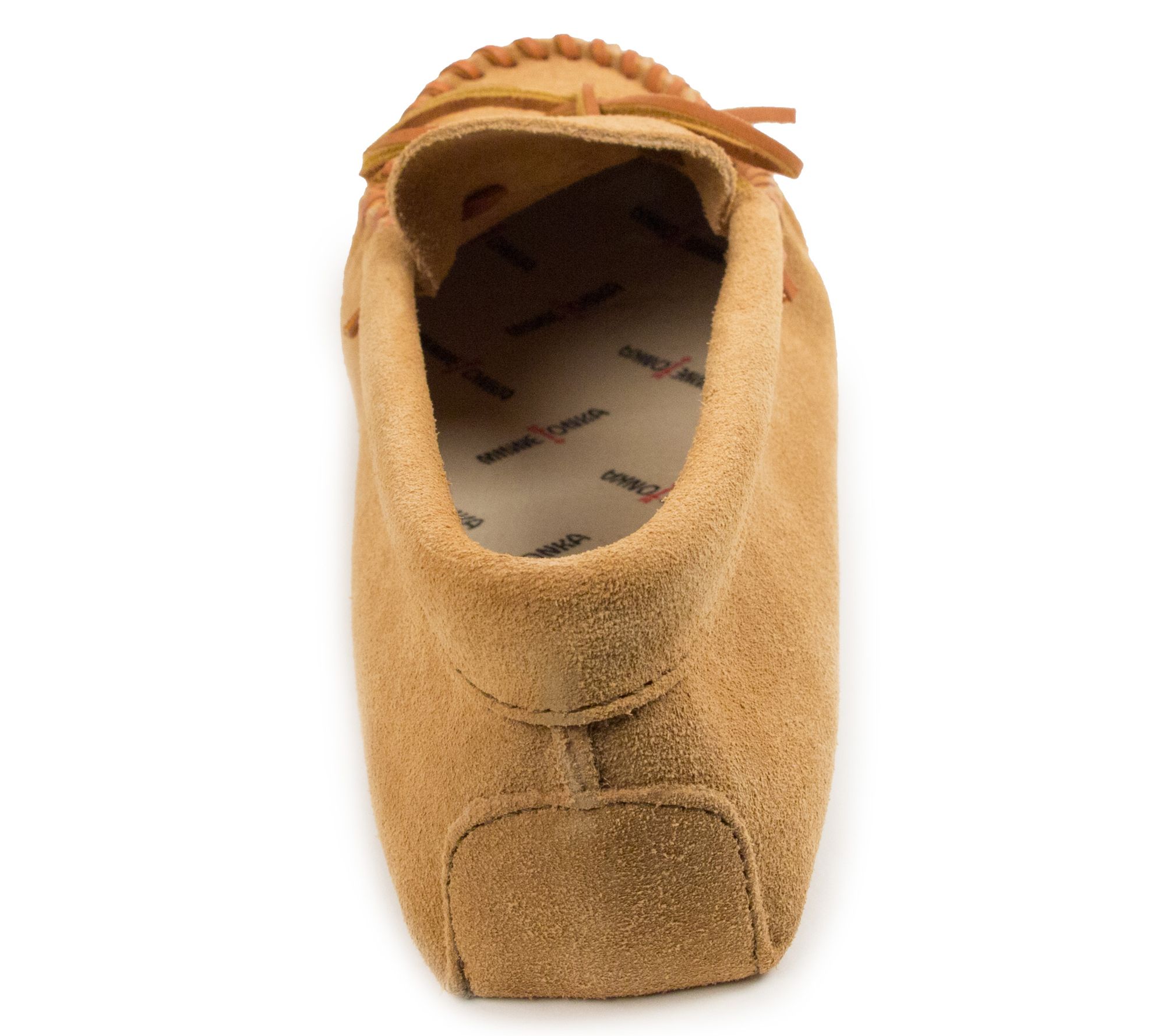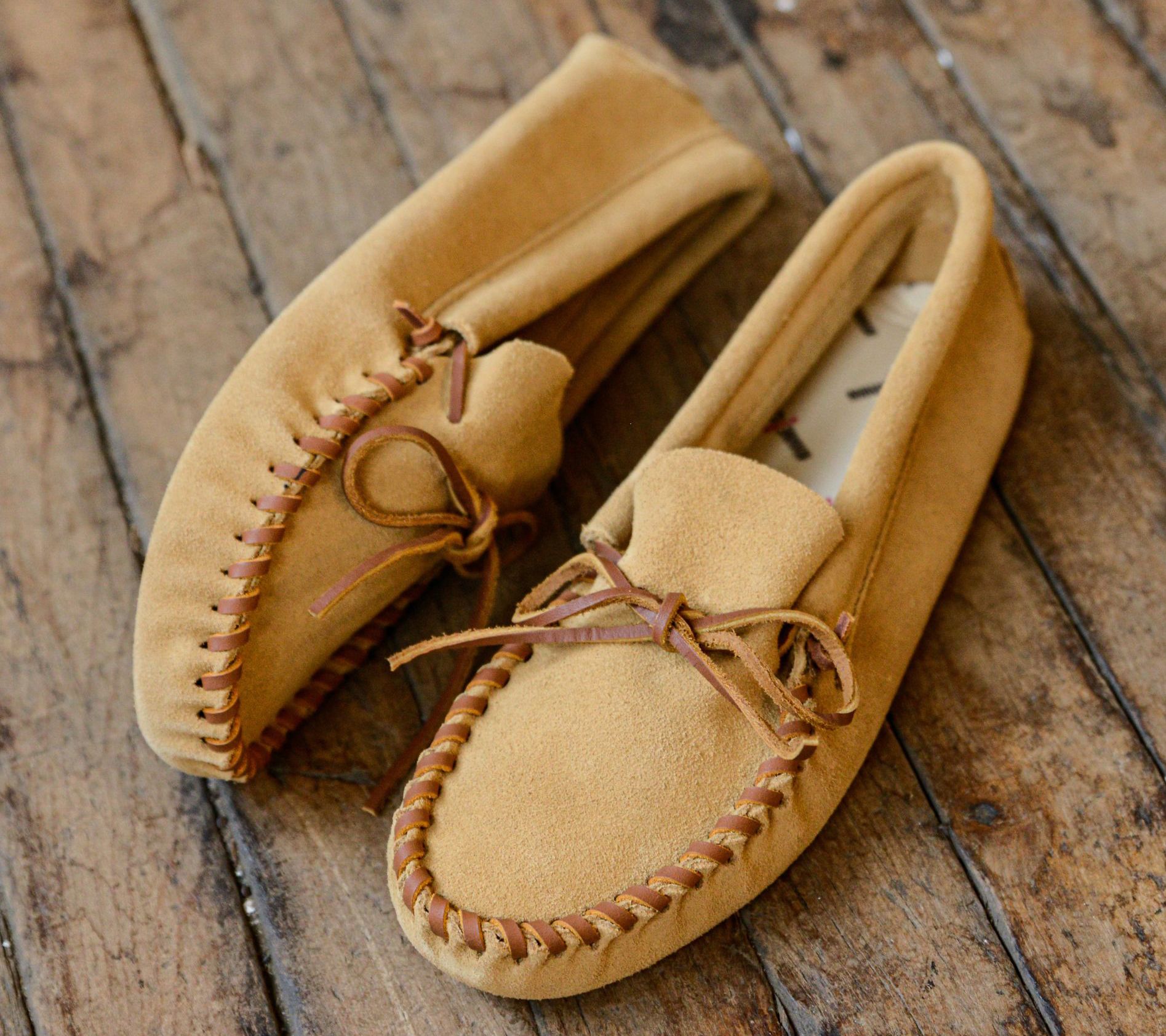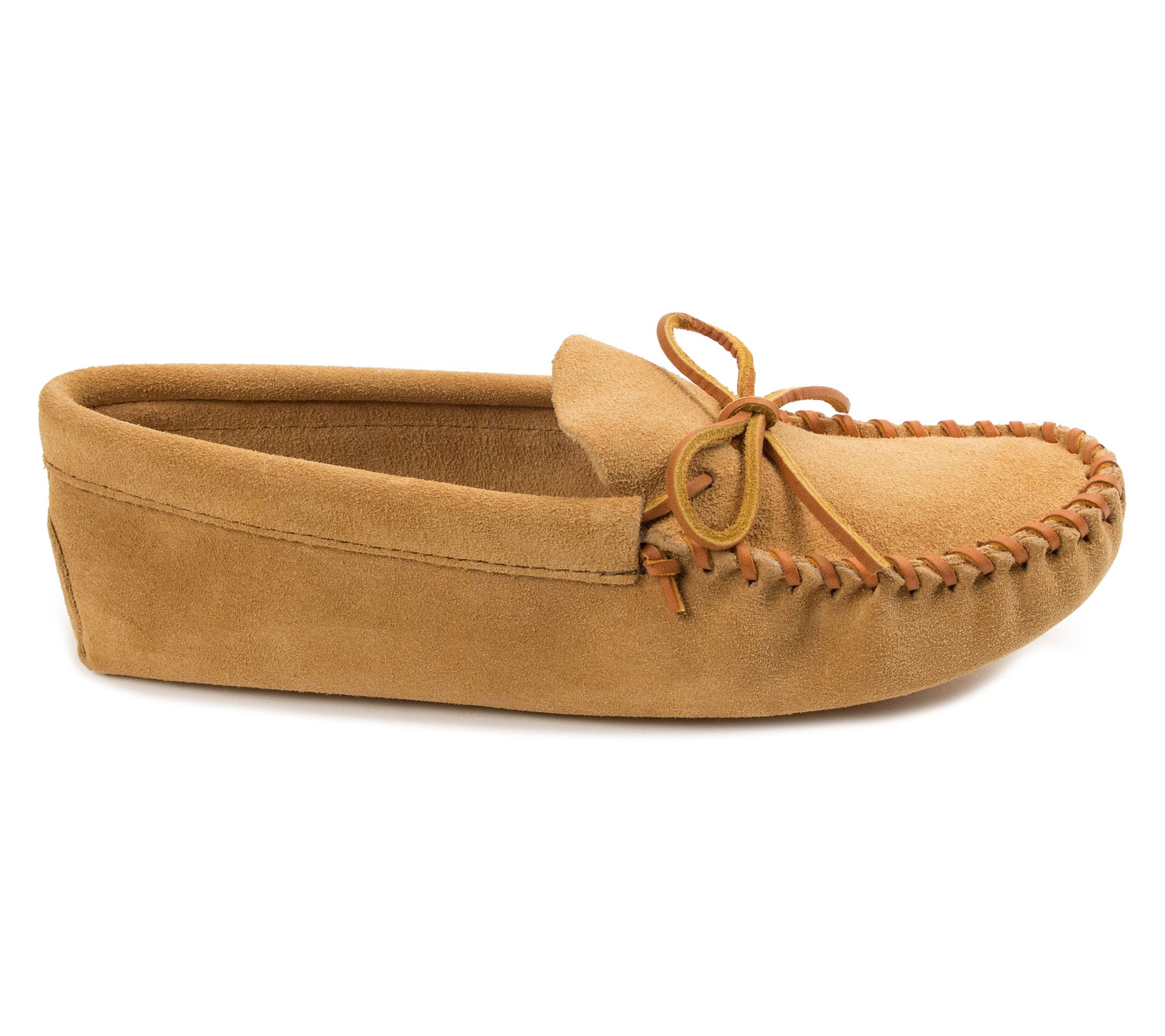 Slip into comfort. Accented by a classic front tie and topstitching, these leather softsole moccasins are just what you need to wear around the house. From Minnetonka.